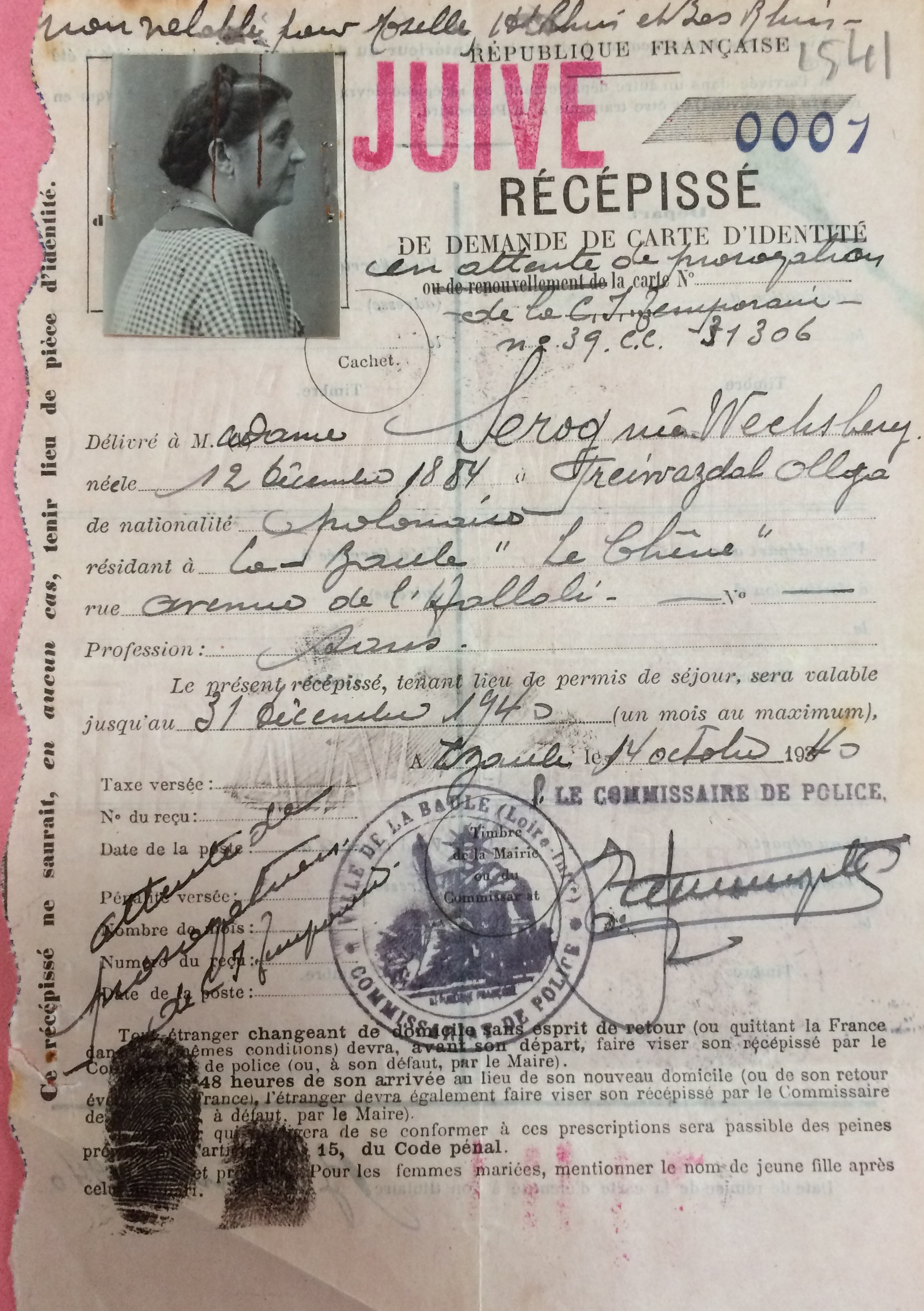 Les tampons « Juif » et »Juive » sont apposés sur leur récépissé de carte d’identité au cours de l’automne 1940.