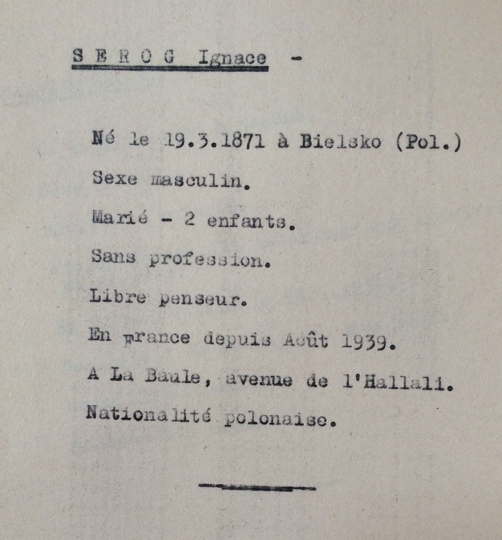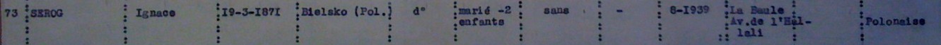 Ignace SEROG se fait recenser en tant que Juif entre le 27 septembre et le 20 octobre 1940 auprès de la sous-préfecture de Saint-Nazaire ou du commissariat de La Baule sous le numéro 073.