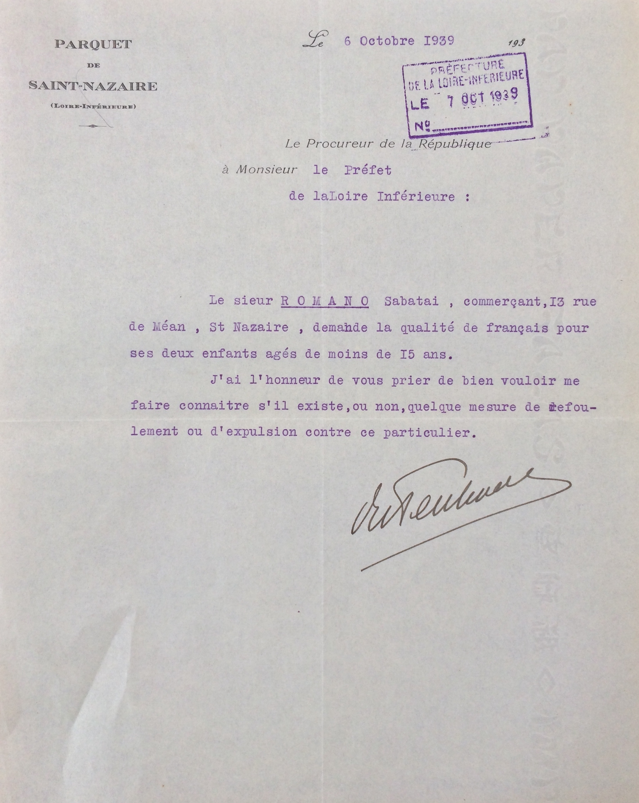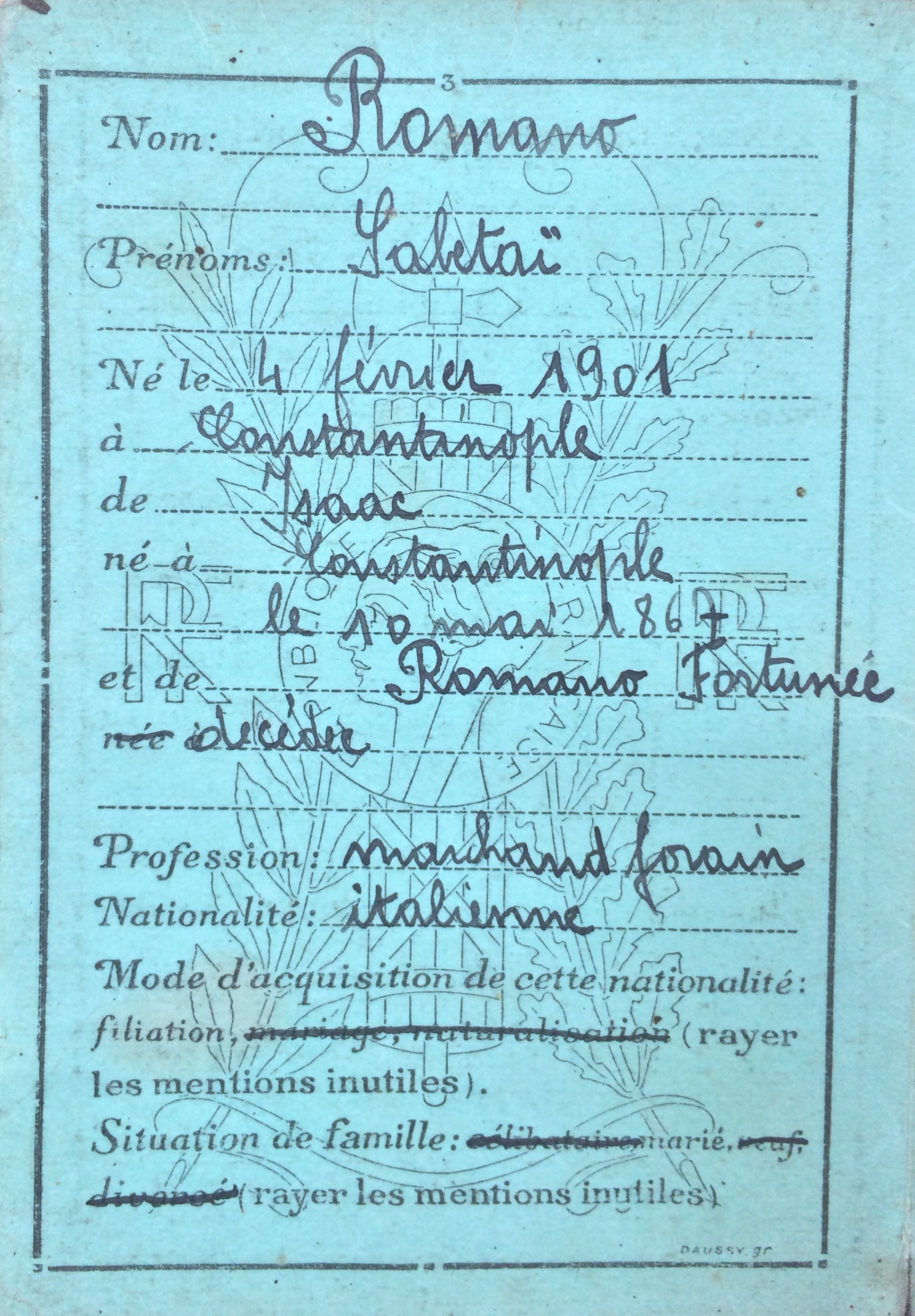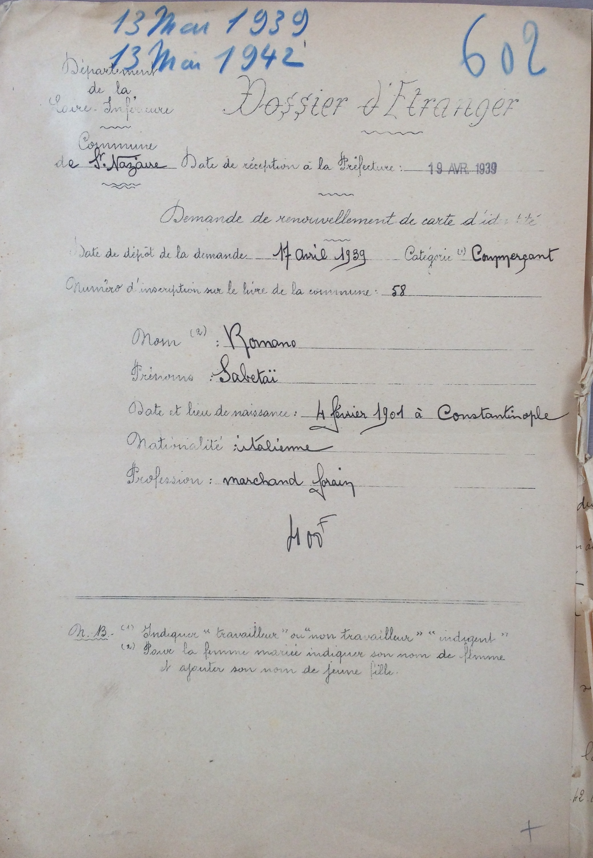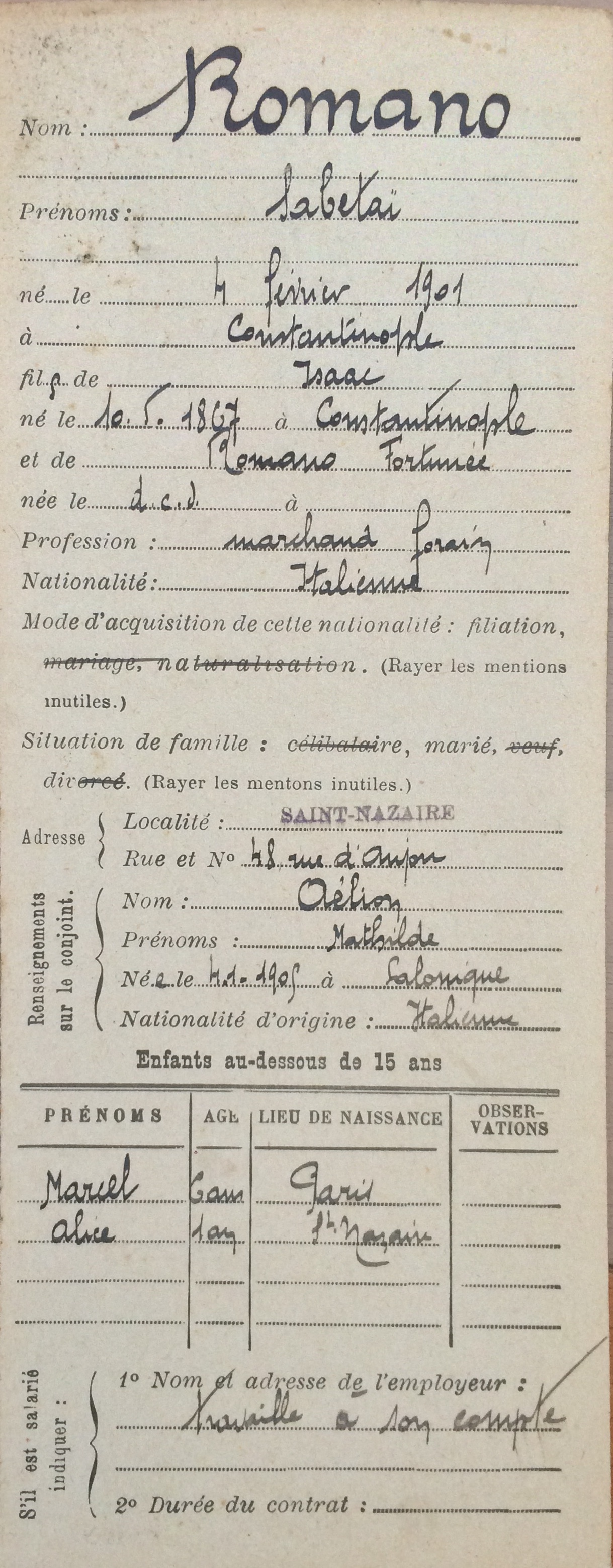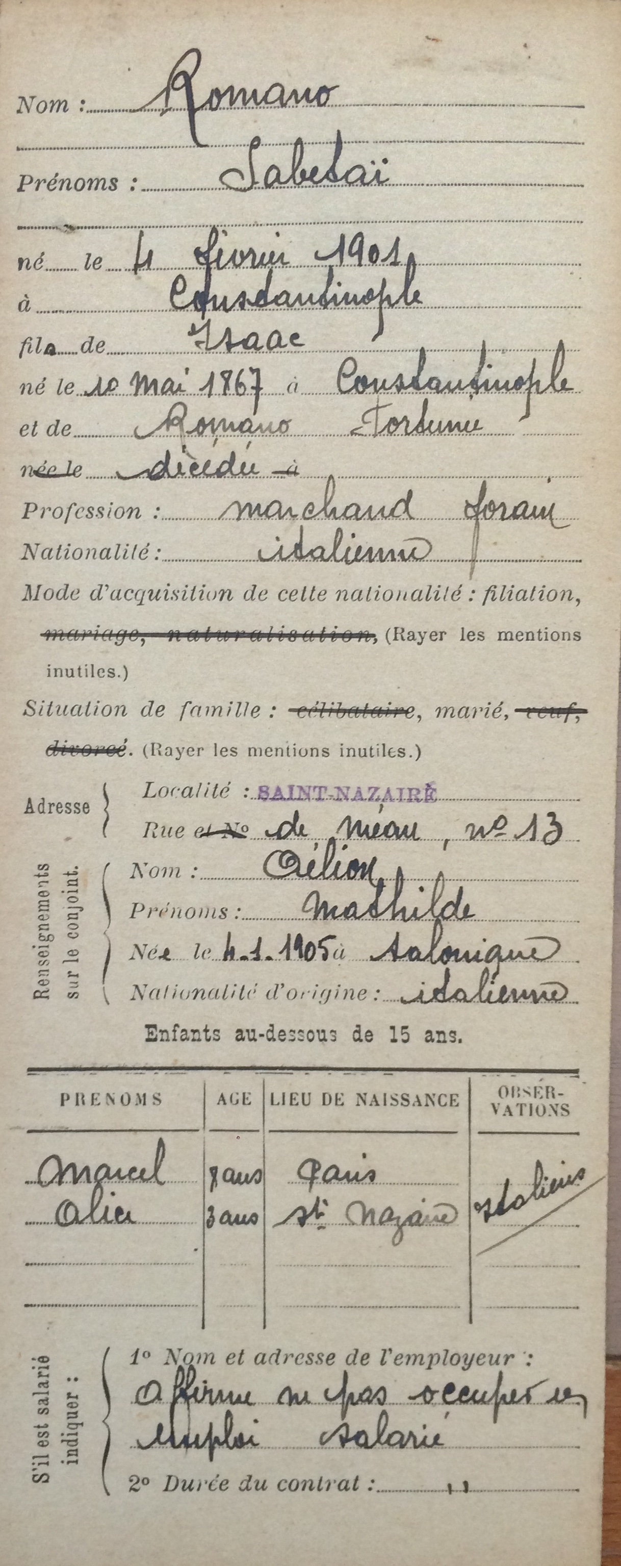 Sabetaï ROMANO est né le 04 février 1901 à Constantinople (Turquie) [Père : ROMANO Isaac né le 10 mai 1867 Constantinople et mère : ROMANO Fortunée]. Il est marié avec Mathilde ROMANO née AELION née le 04 janvier 1905 à Salonique (Grèce) [Père : AELION Joseph né le 04 février 1877 et Mère : AELION Reyna]. Ils sont de nationalité italienne et ont deux enfants : Marcel Isaac né en 1928 à Paris et Alice née en 1933 à Saint-Nazaire (Loire-Atlantique).