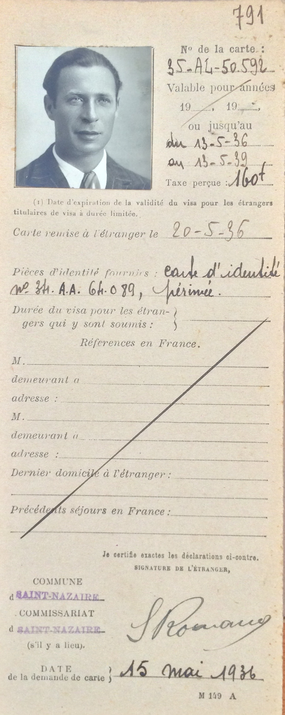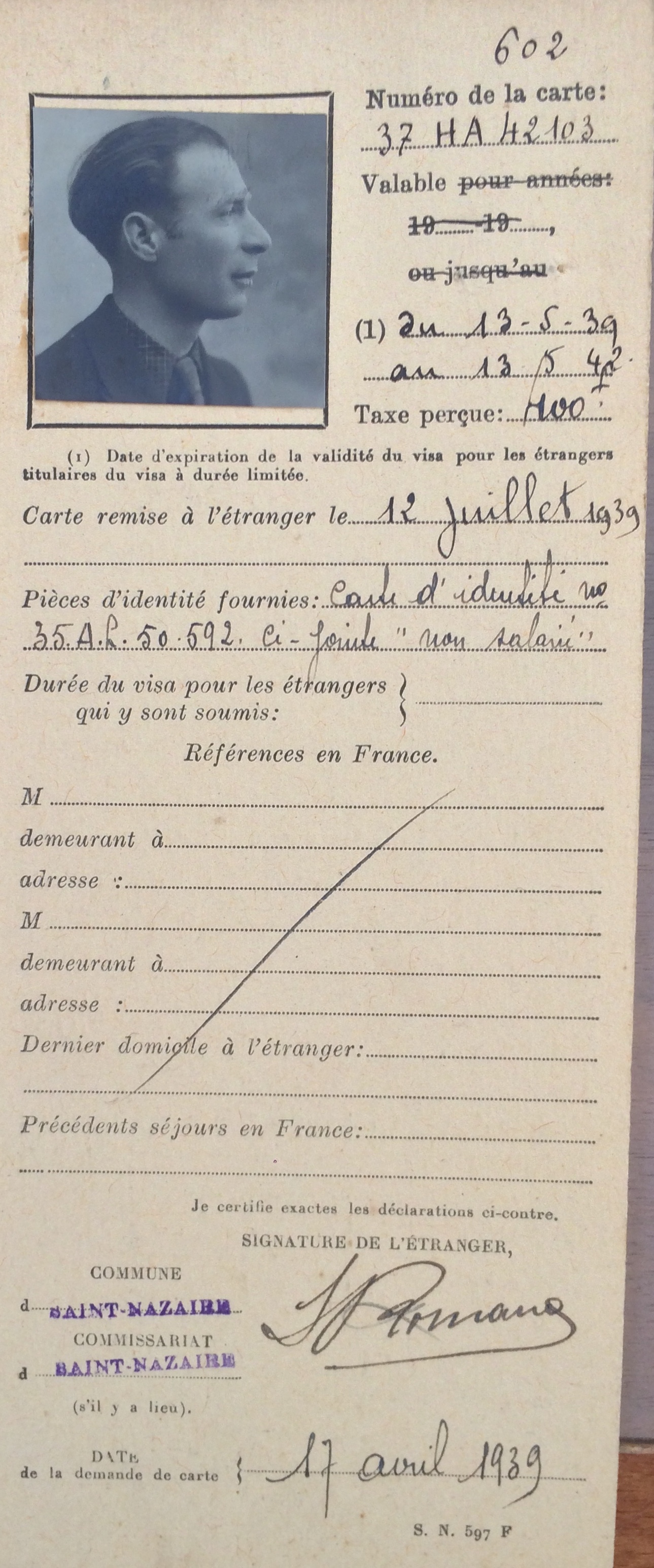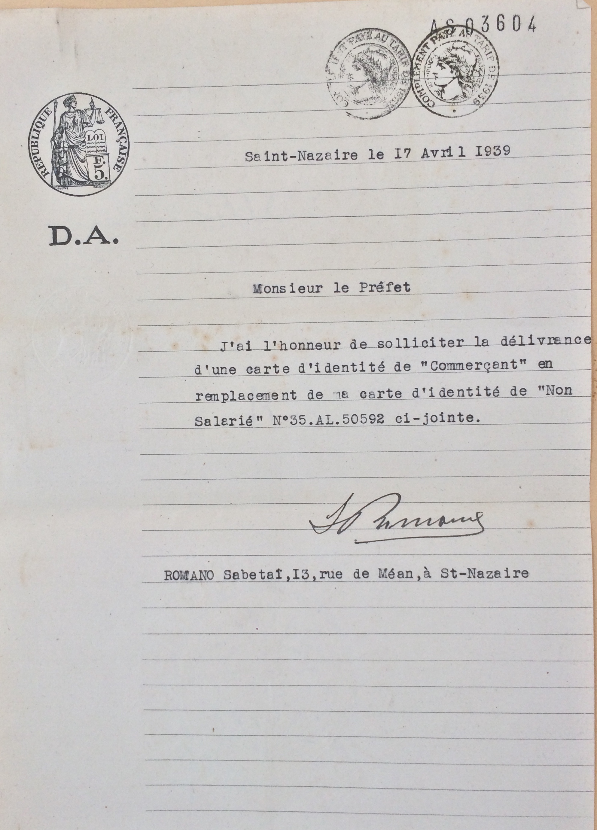 Sabetaï ROMANO est présent à Saint-Nazaire depuis 1933 et est inscrit au registre du commerce auprès du Tribunal de commerce comme marchand forain depuis le 06 avril 1939, plsu précisément marchand forain en tissus. La famille habitait (1933) 46, rue de Richebourg à Nantes puis habite 48, rue d’Anjou à Saint-Nazaire puis déménage au 13, rue de Méan (1933-1941) à Saint-Nazaire.