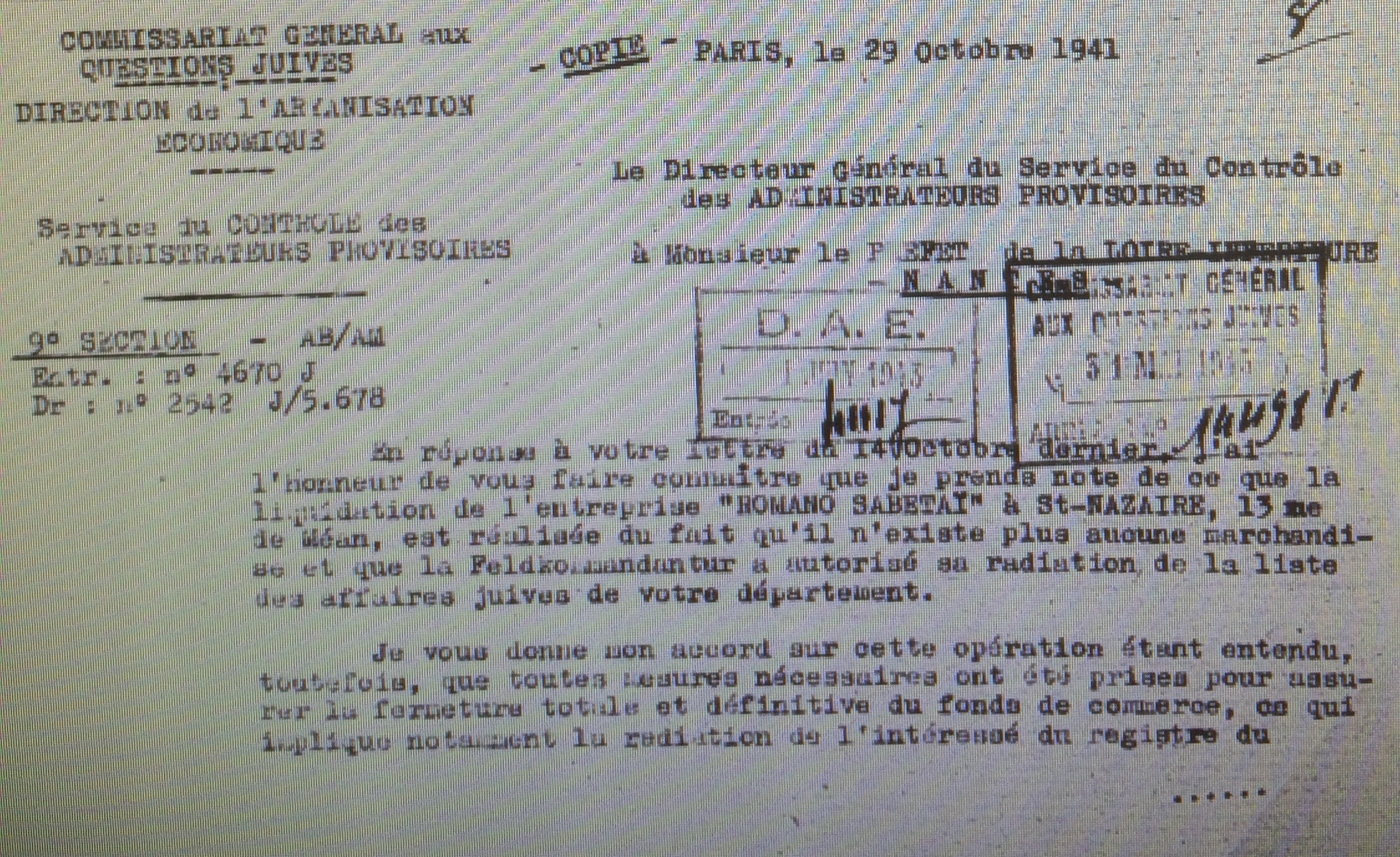 Lors de la procédure de « désenjuivement de l’économie française », Gabriel HERVOUËT, arbitre de commerce à Saint-Nazaire 44, rue de Nantes et nommé administrateur provisoire de l’entreprise constate lors de la pose des scellés le 03 décembre 1940 que Sabetaï ROMANO qu’il n’exerce plus de commerce et ne possède aucune marchandise. Il sera rayé de la liste des commerçants juifs de l’arrondissement de Saint-Nazaire, radié du registre du commerce et du rôle de patente.