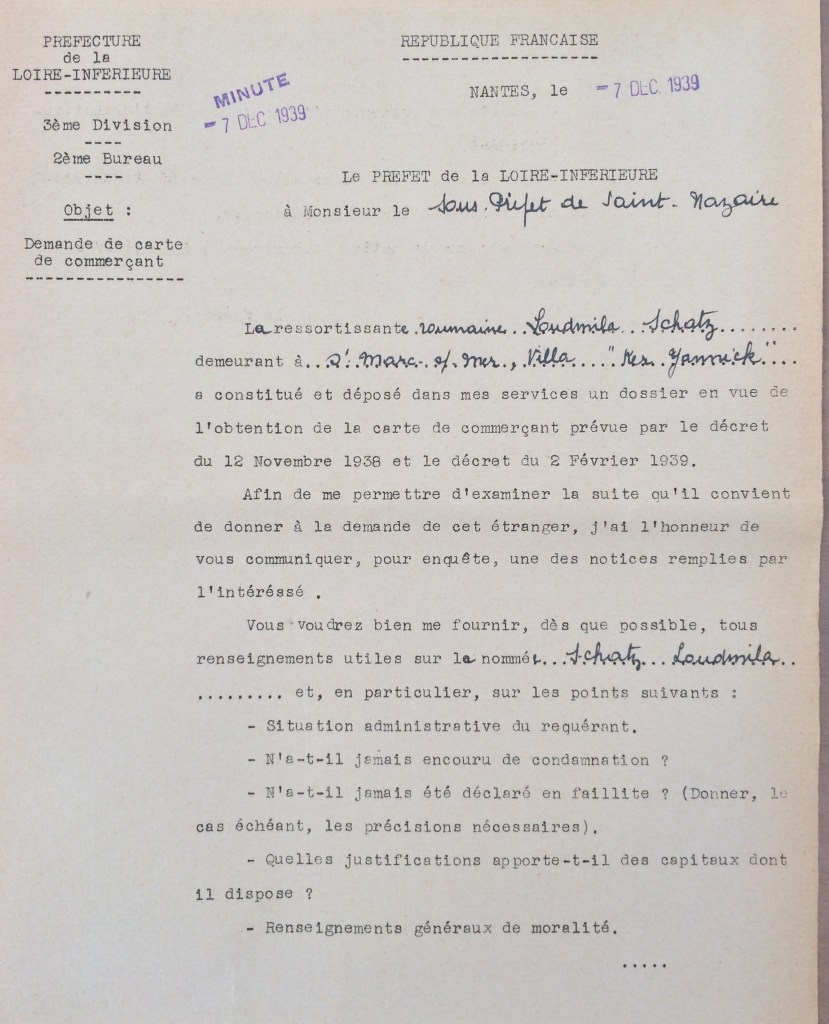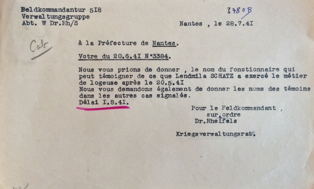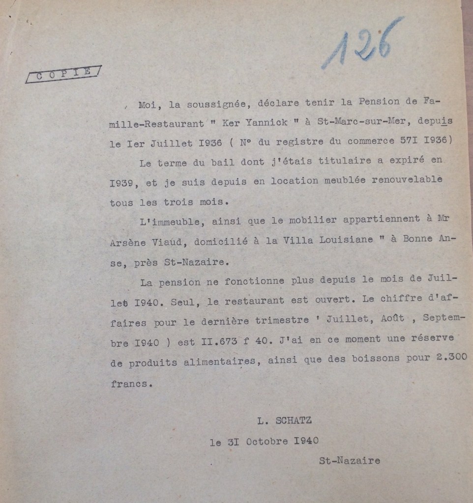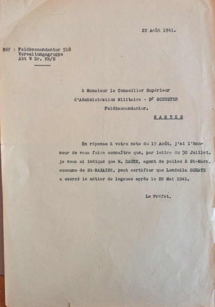 L’ordonnance du 26 avril 1941 du Chef militaire des autorités allemandes en France prescrivant la fermeture des industries hôtelières, Ludmilla SCHATZ écrit à la Kreiskommandantur de Saint-Nazaire via la sous-préfecture pour obtenir un délai de trois semaines afin de liquider son commerce, trouver un logement et un emploi, ce qui lui est accordé.
