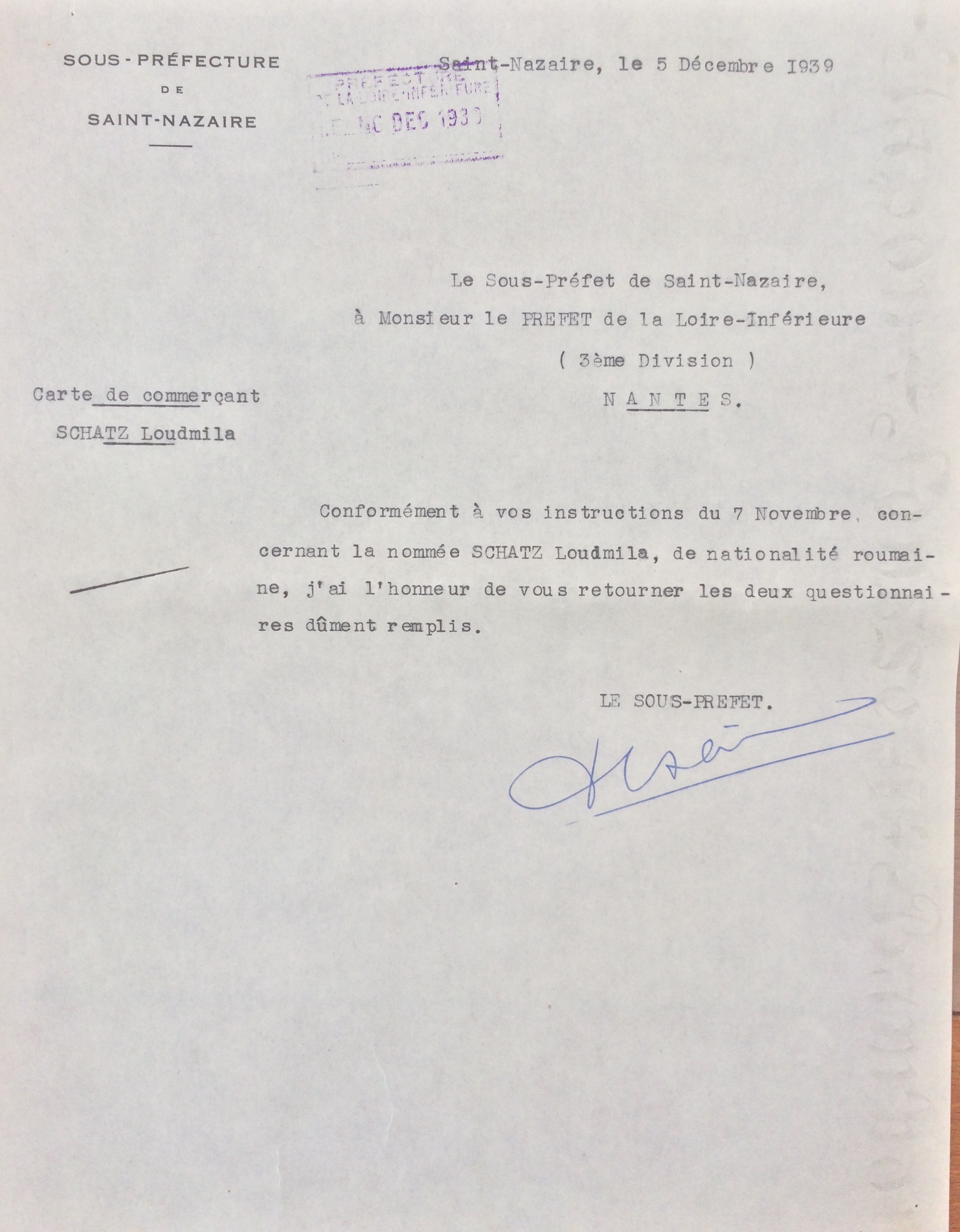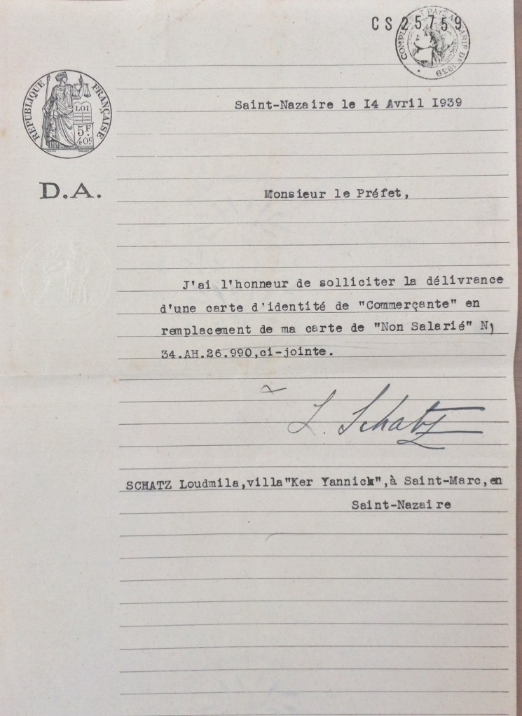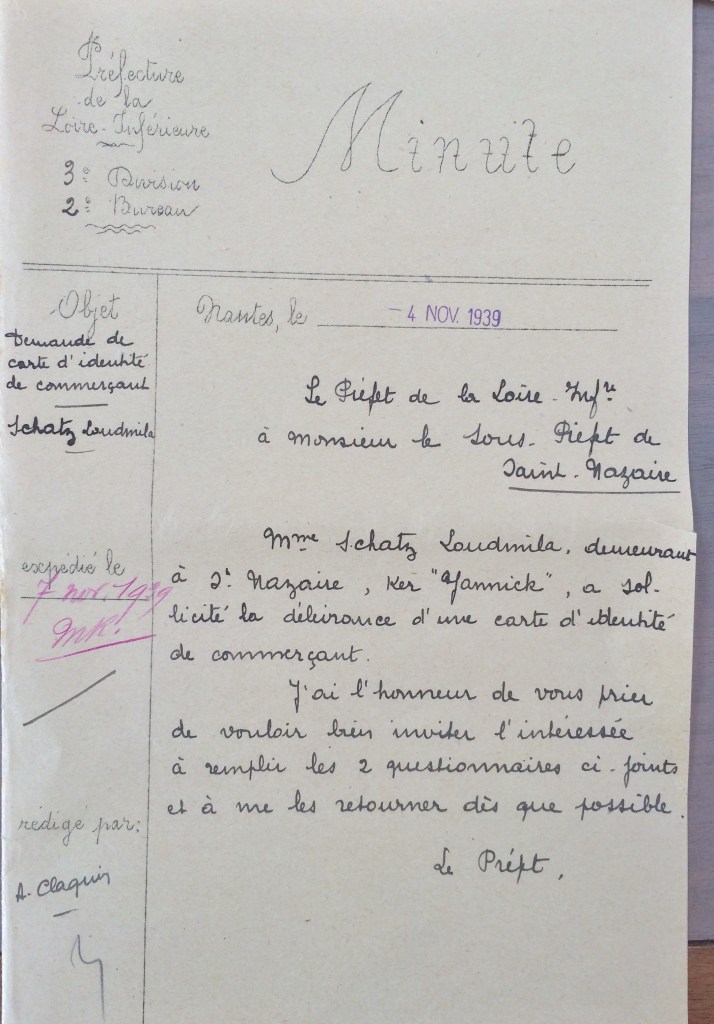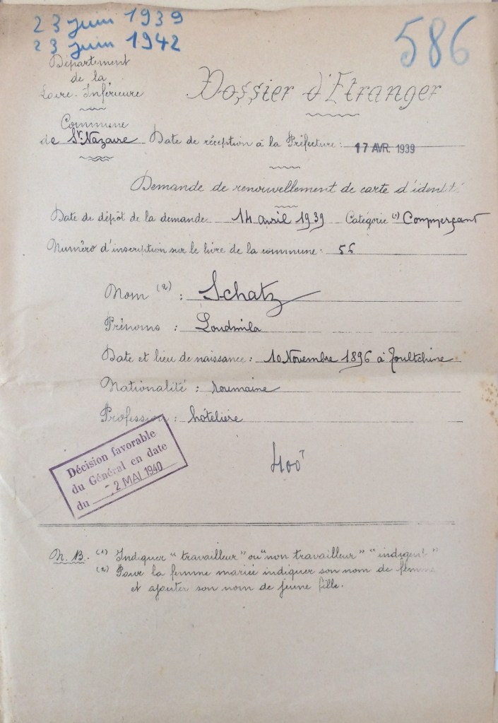 L’ordonnance du 26 avril 1941 du Chef militaire des autorités allemandes en France prescrivant la fermeture des industries hôtelières, Ludmilla SCHATZ écrit à la Kreiskommandantur de Saint-Nazaire via la sous-préfecture pour obtenir un délai de trois semaines afin de liquider son commerce, trouver un logement et un emploi, ce qui lui est accordé.