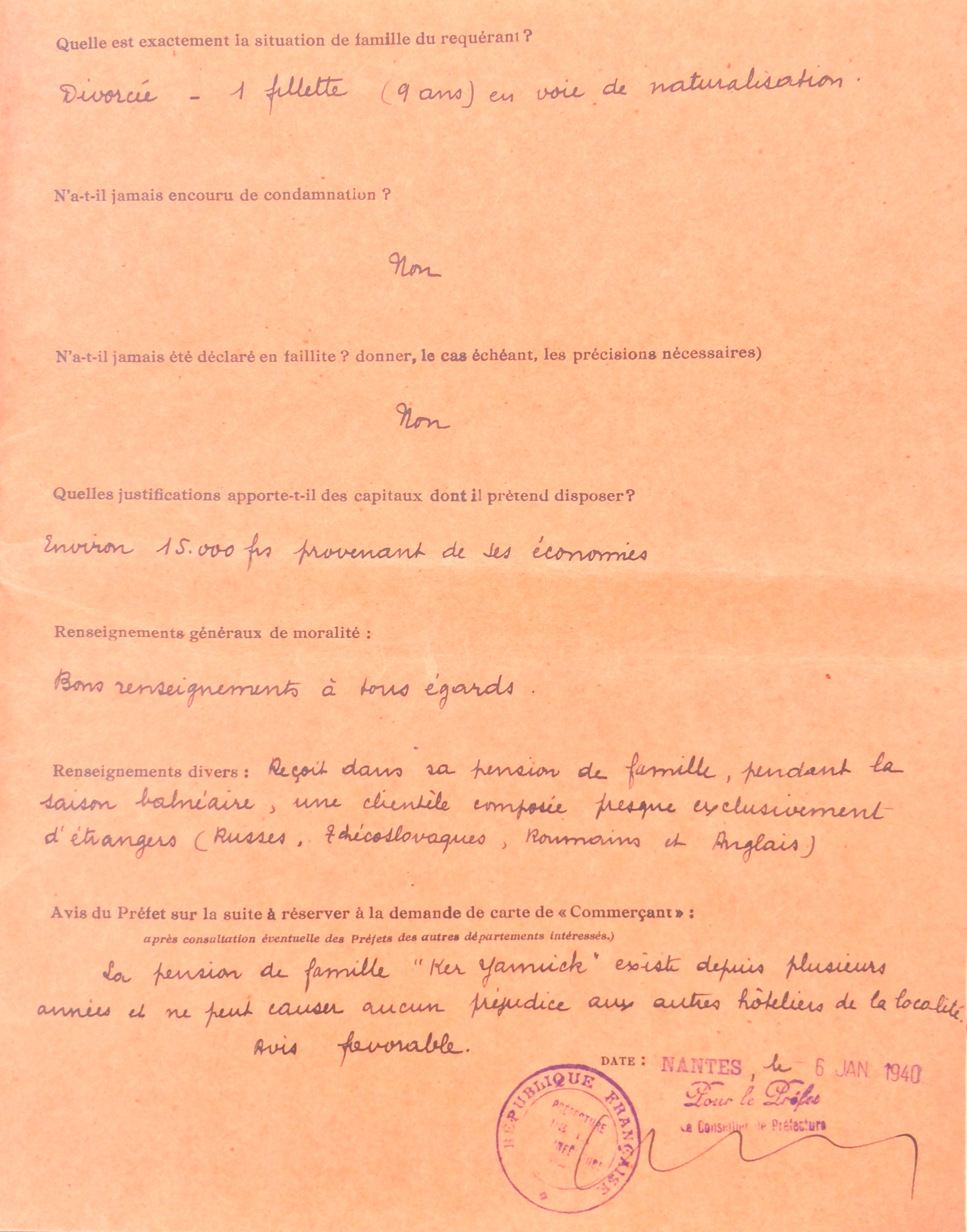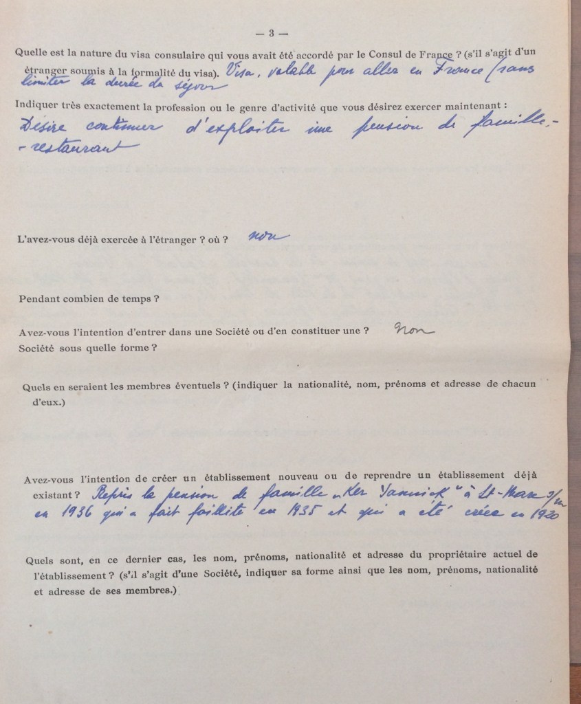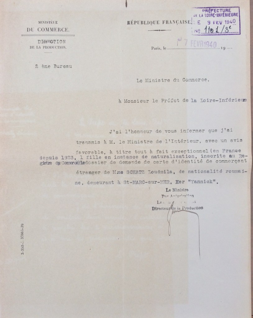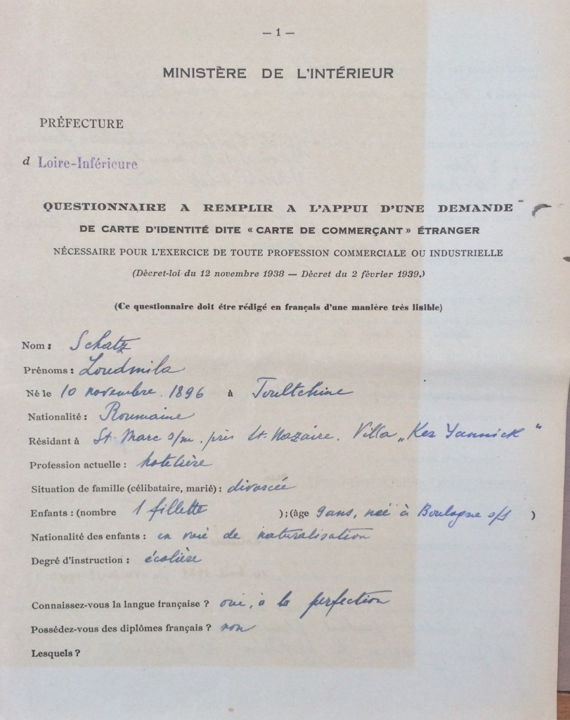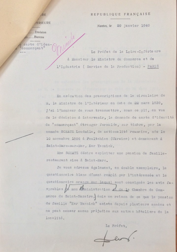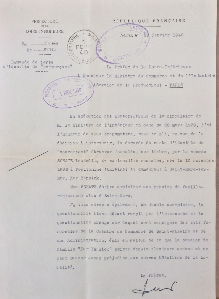 Elle obtient sa carte de commerçant étranger le 25 février 1940 après dépôt de dossier, approbation de la sous-préfecture de Saint-Nazaire et de la chambre de commerce de Nantes qui eu égard à sa présence en France lui accorde de « façon exceptionnelle » l’autorisation d’exploiter la pension de famille.