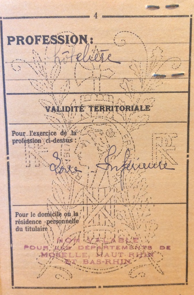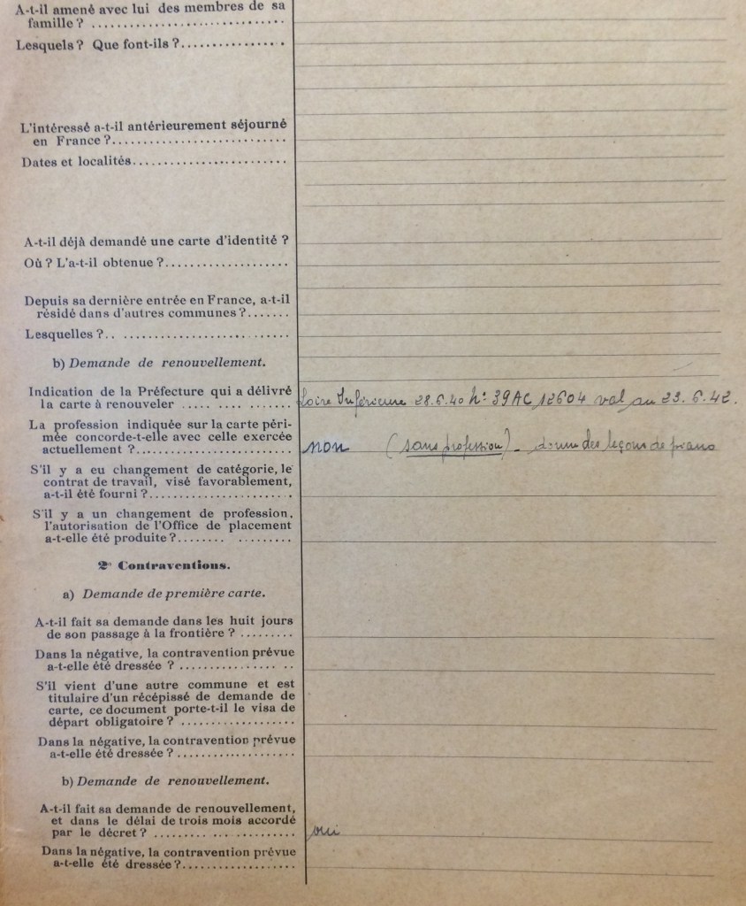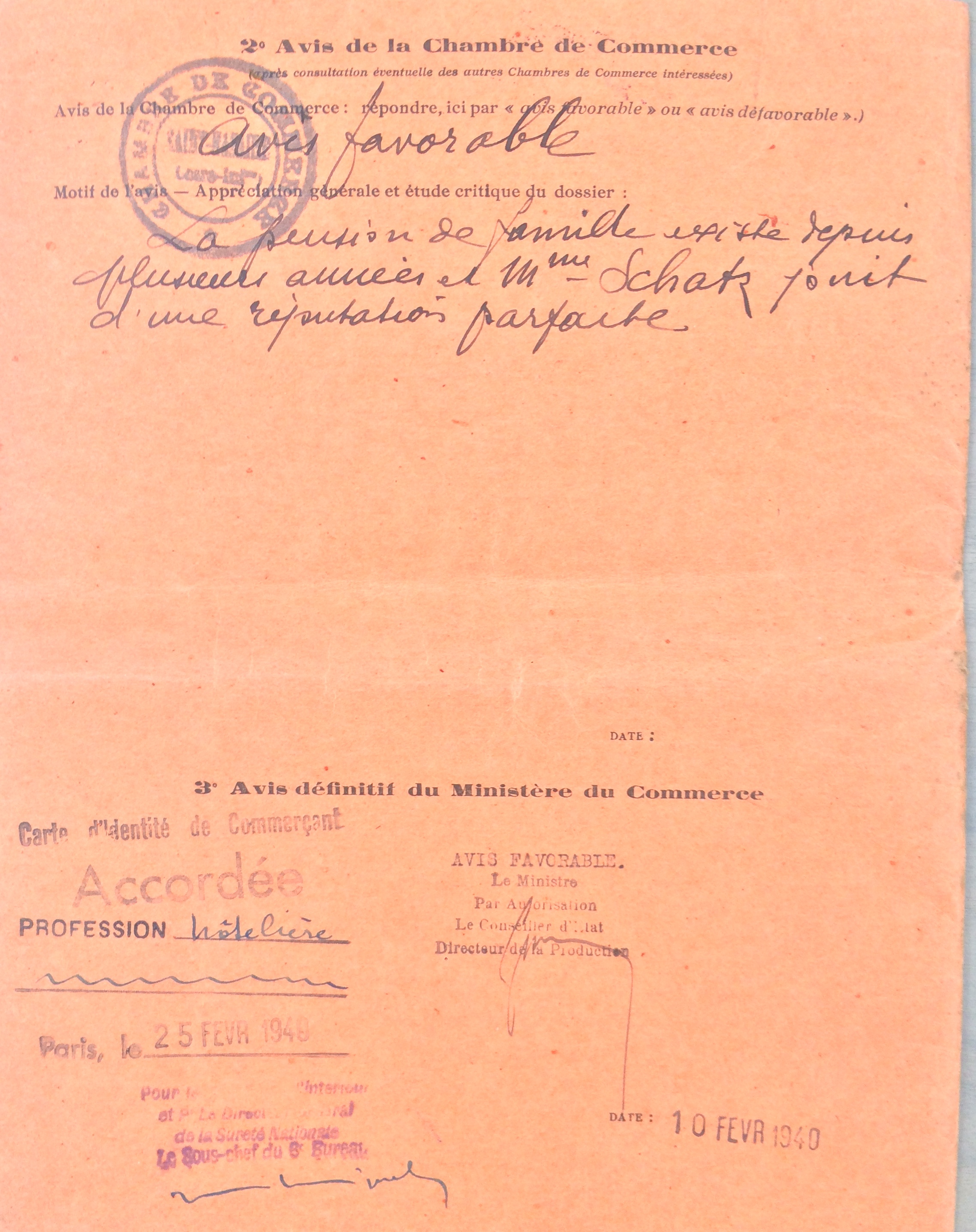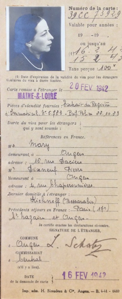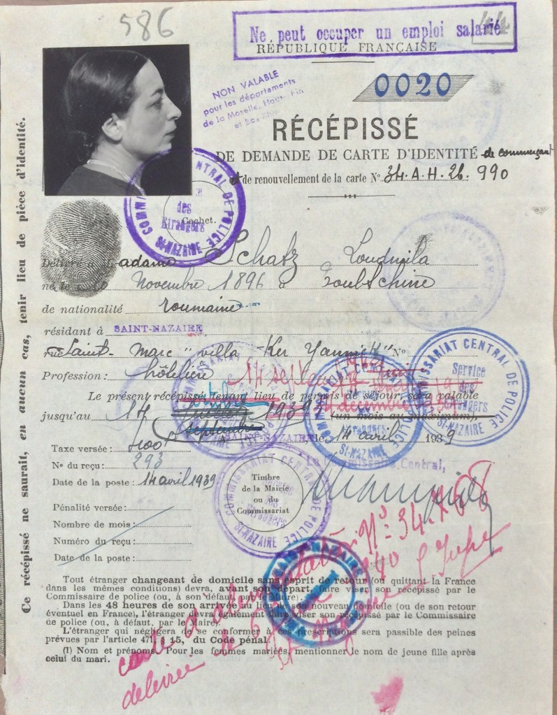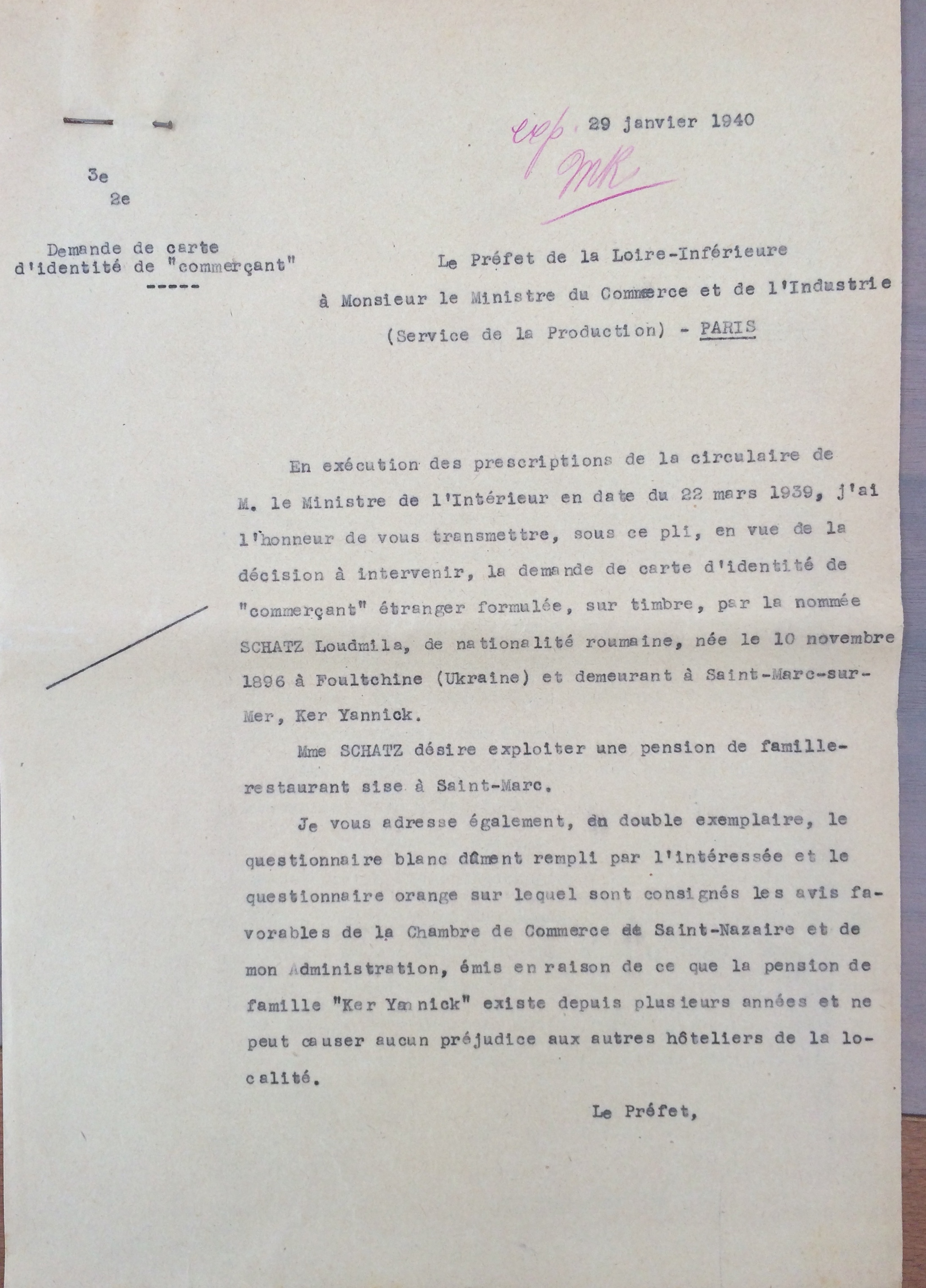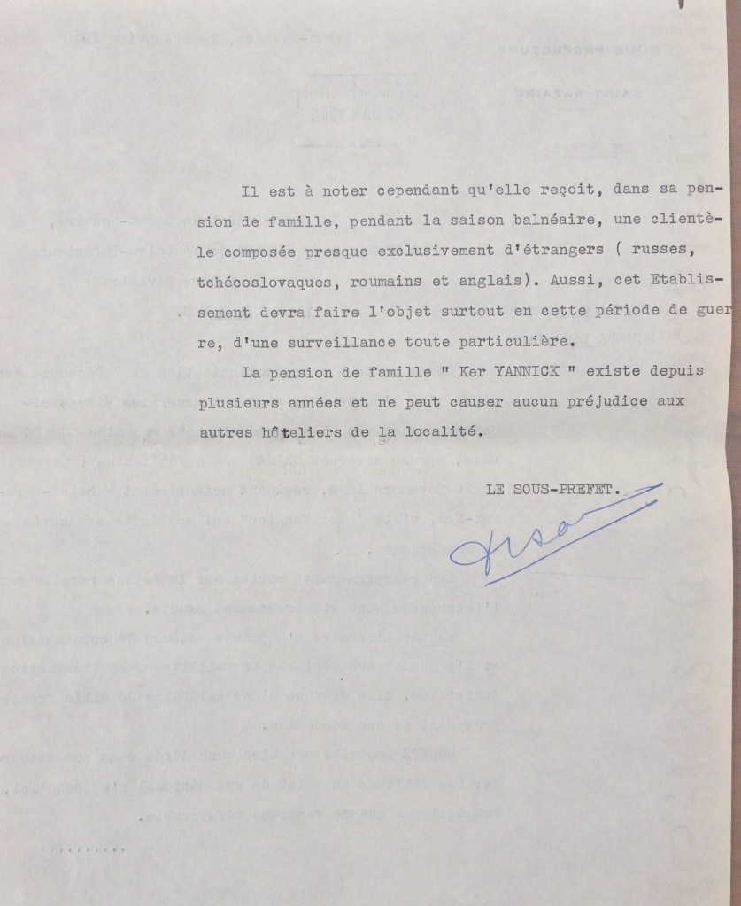 Elle obtient sa carte de commerçant étranger le 25 février 1940 après dépôt de dossier, approbation de la sous-préfecture de Saint-Nazaire et de la chambre de commerce de Nantes qui eu égard à sa présence en France lui accorde de « façon exceptionnelle » l’autorisation d’exploiter la pension de famille.