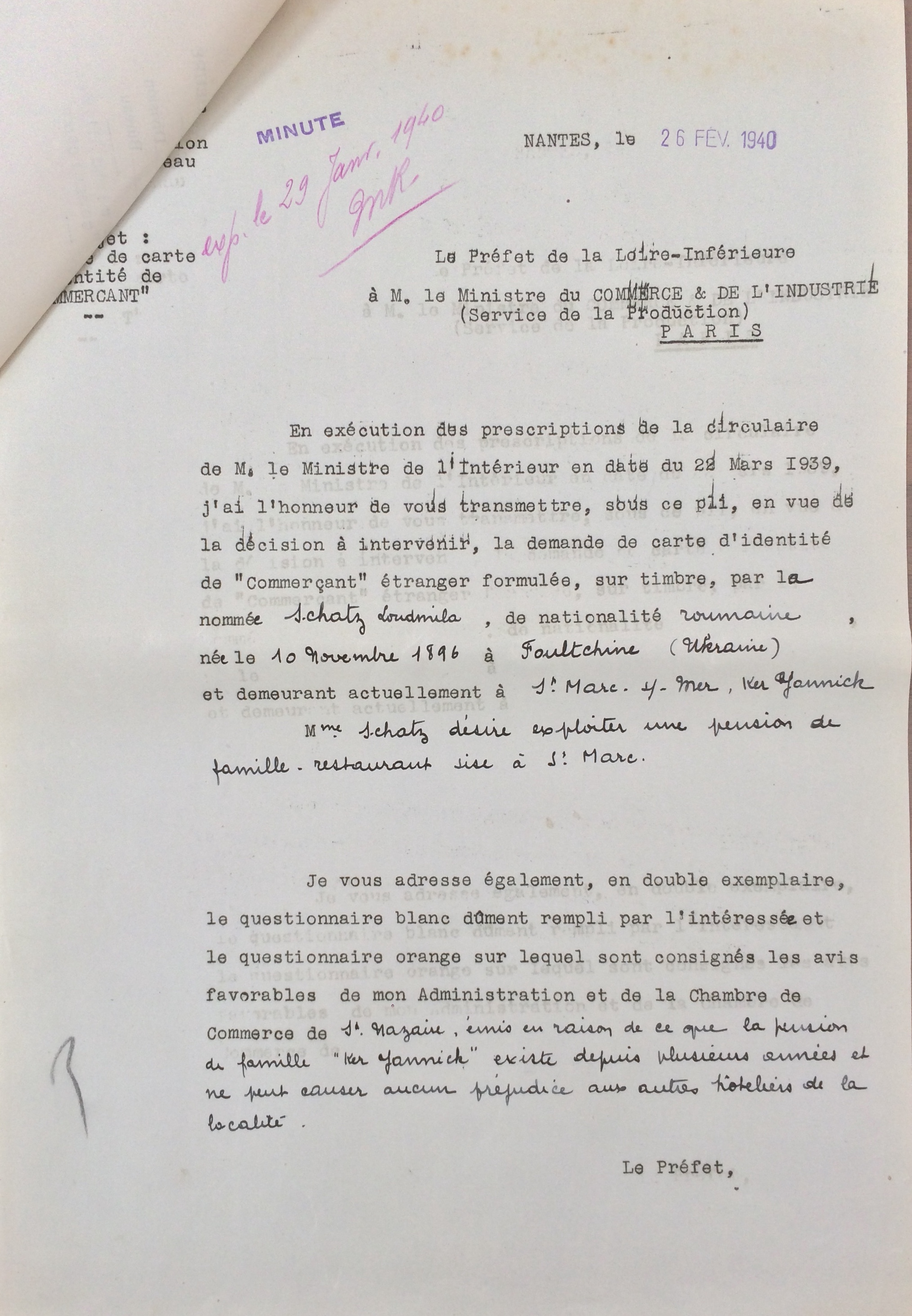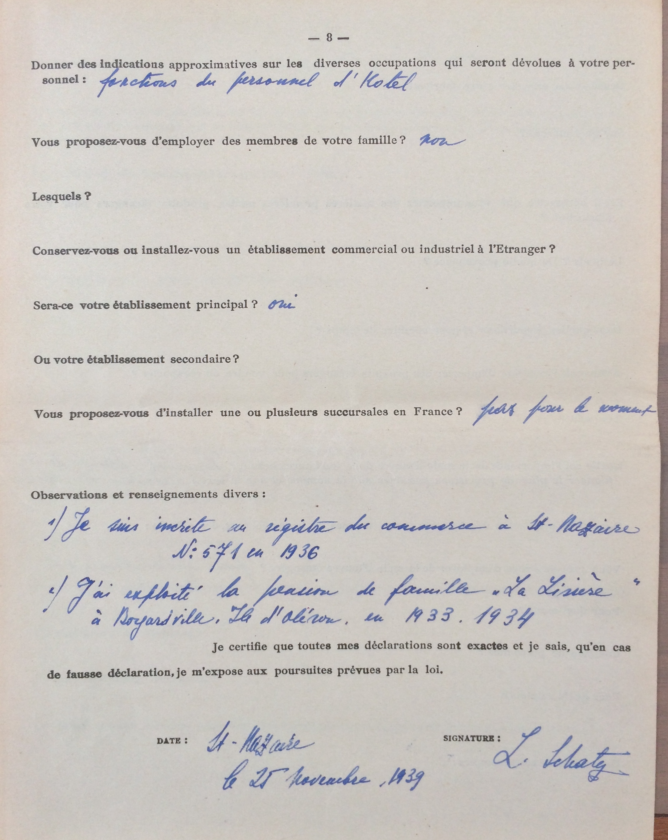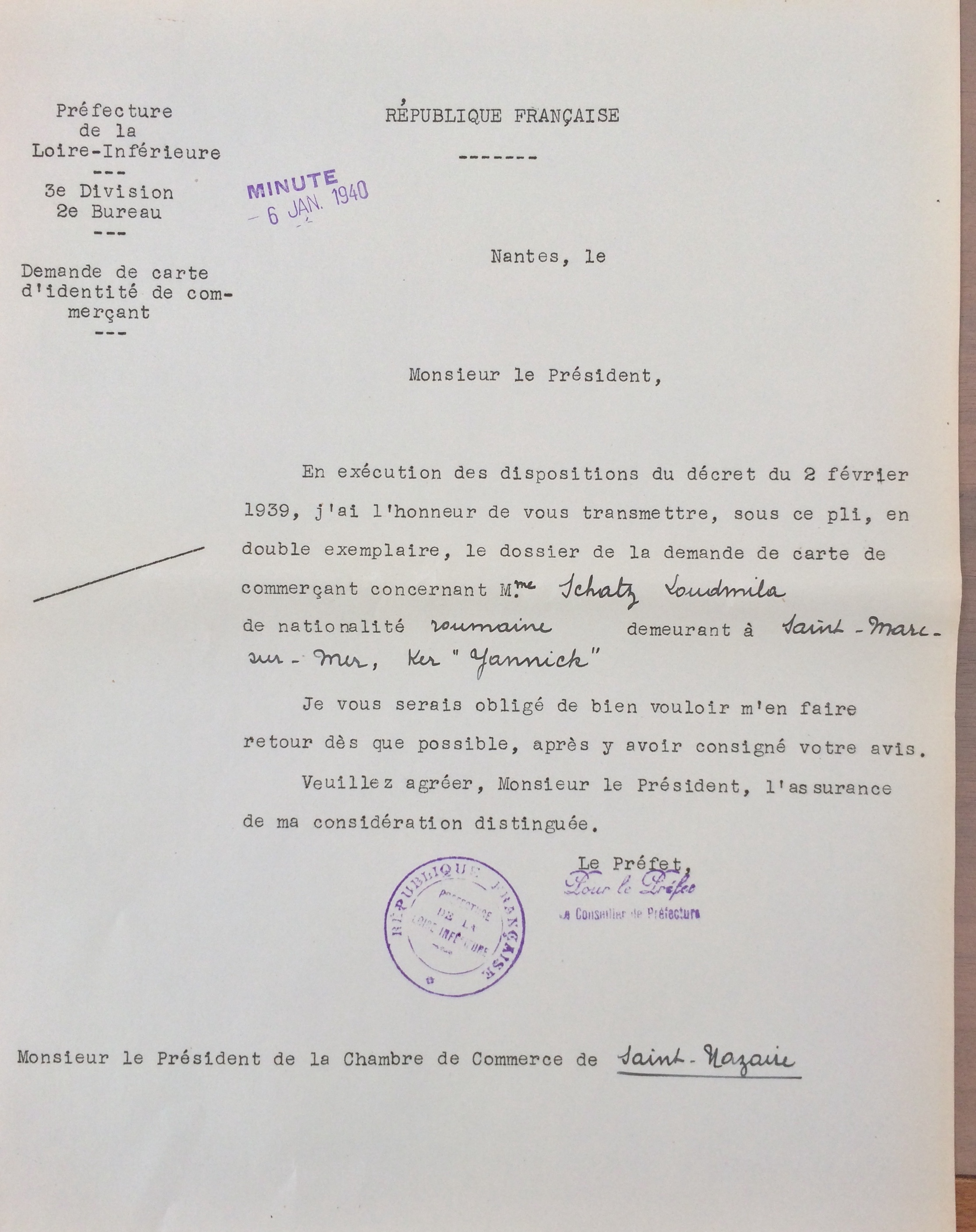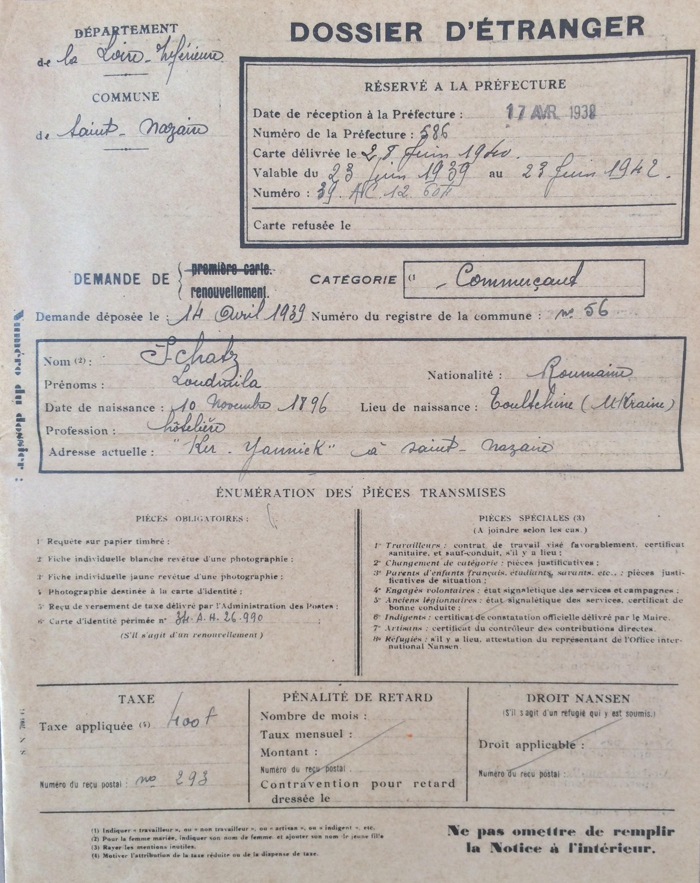 Elle obtient sa carte de commerçant étranger le 25 février 1940 après dépôt de dossier, approbation de la sous-préfecture de Saint-Nazaire et de la chambre de commerce de Nantes qui eu égard à sa présence en France lui accorde de « façon exceptionnelle » l’autorisation d’exploiter la pension de famille.