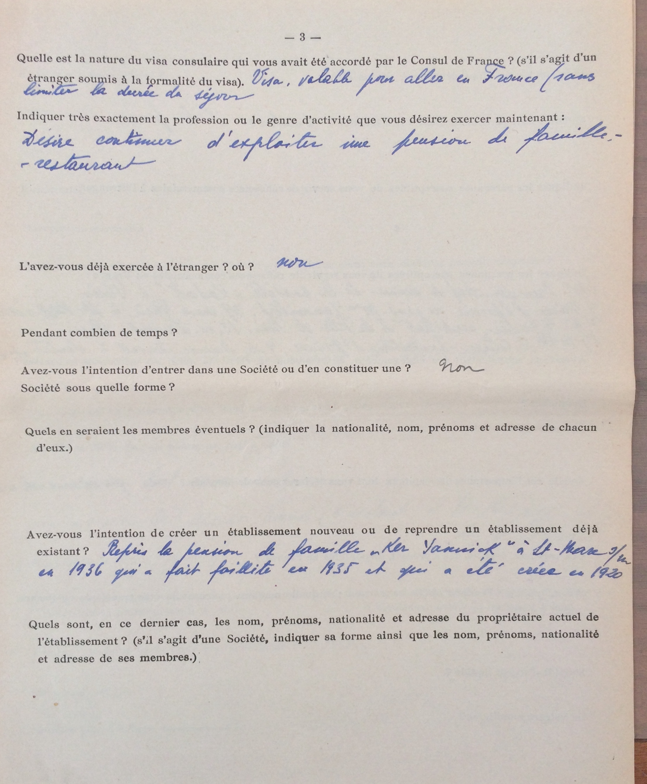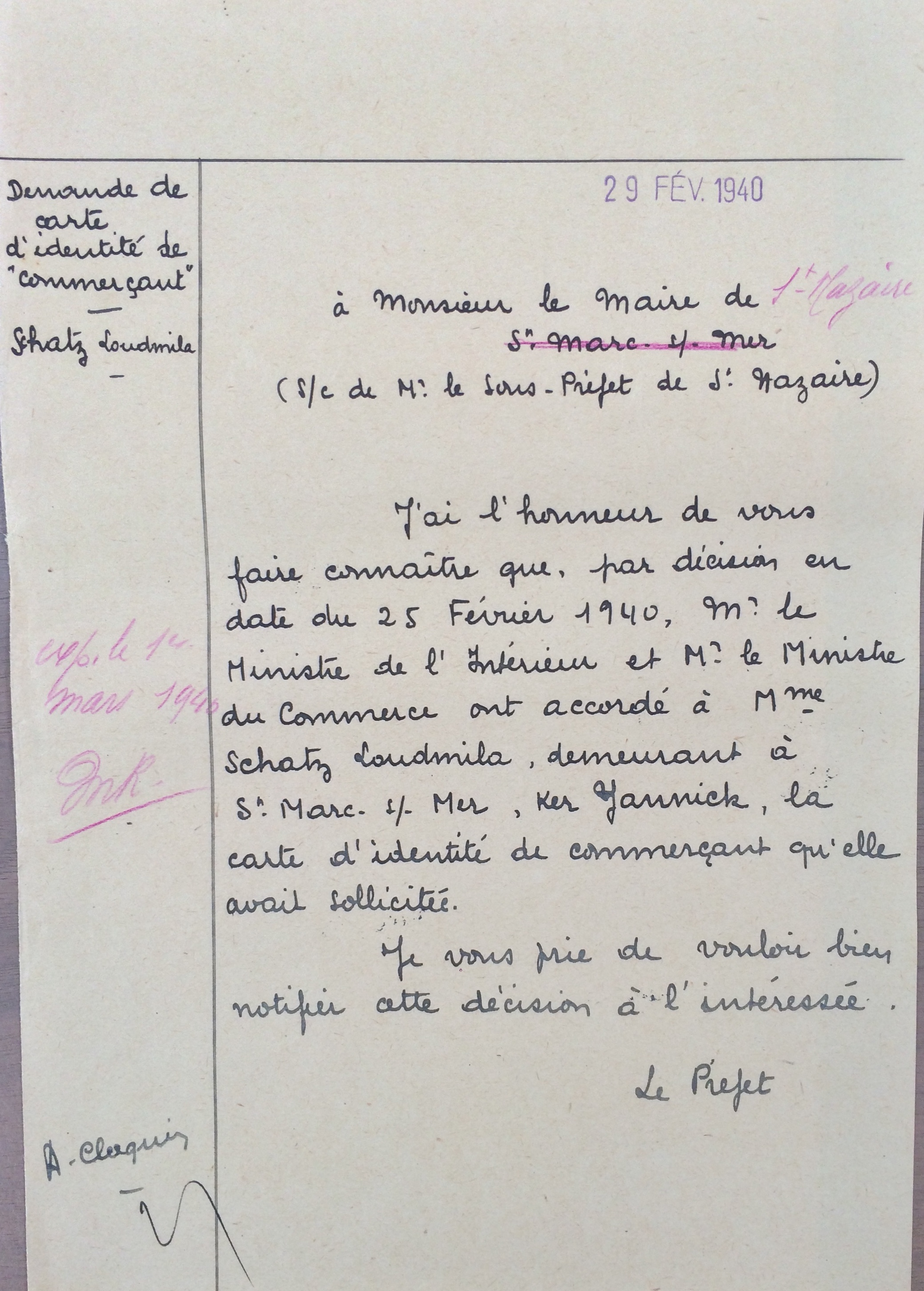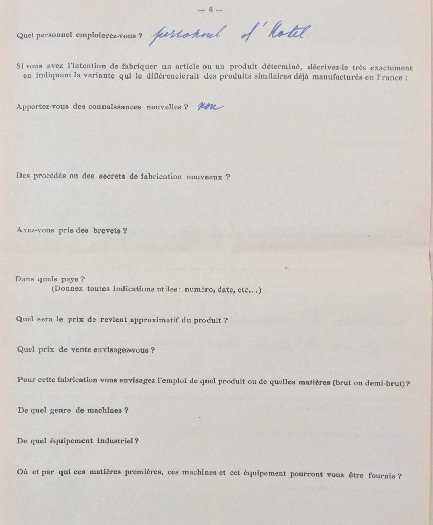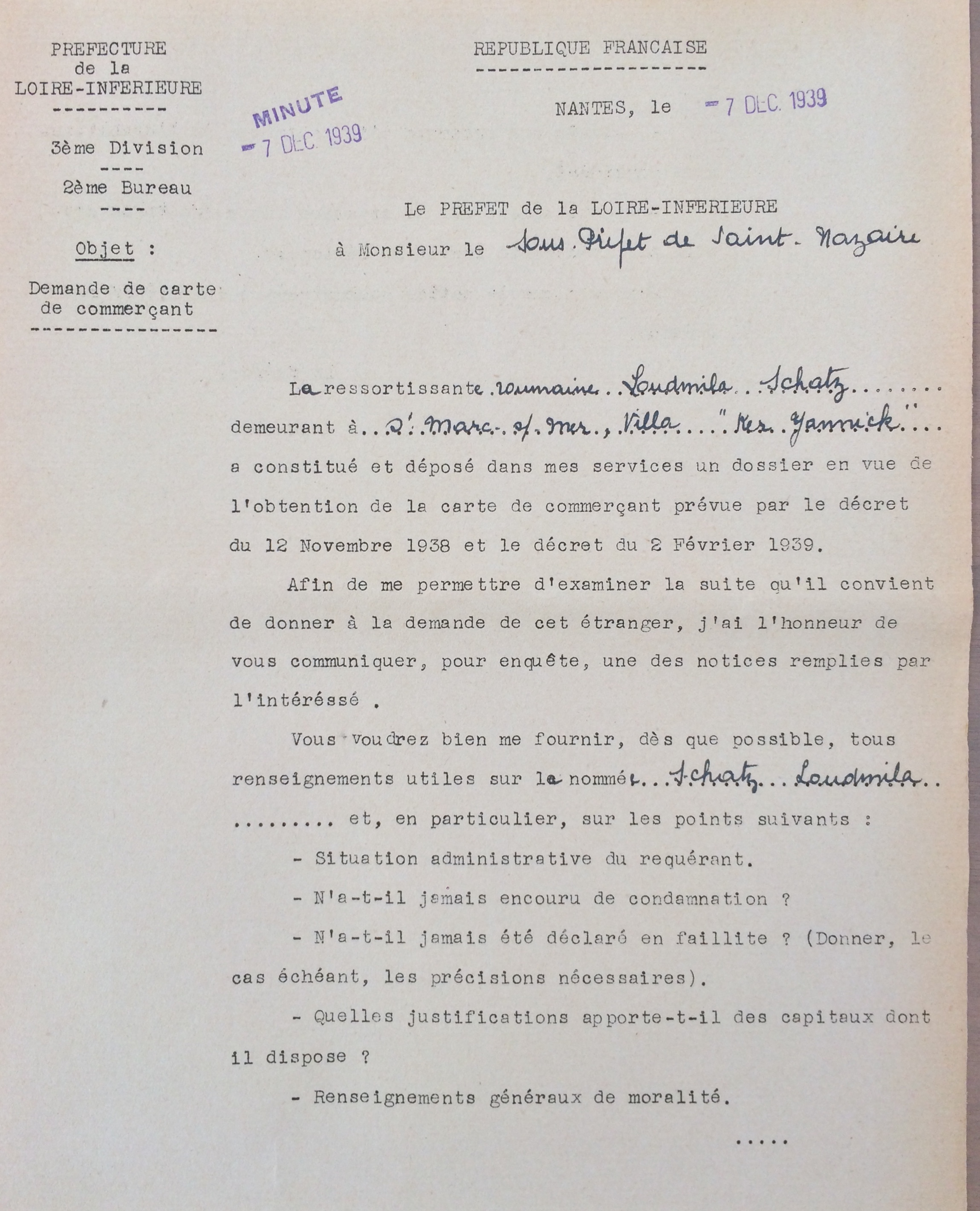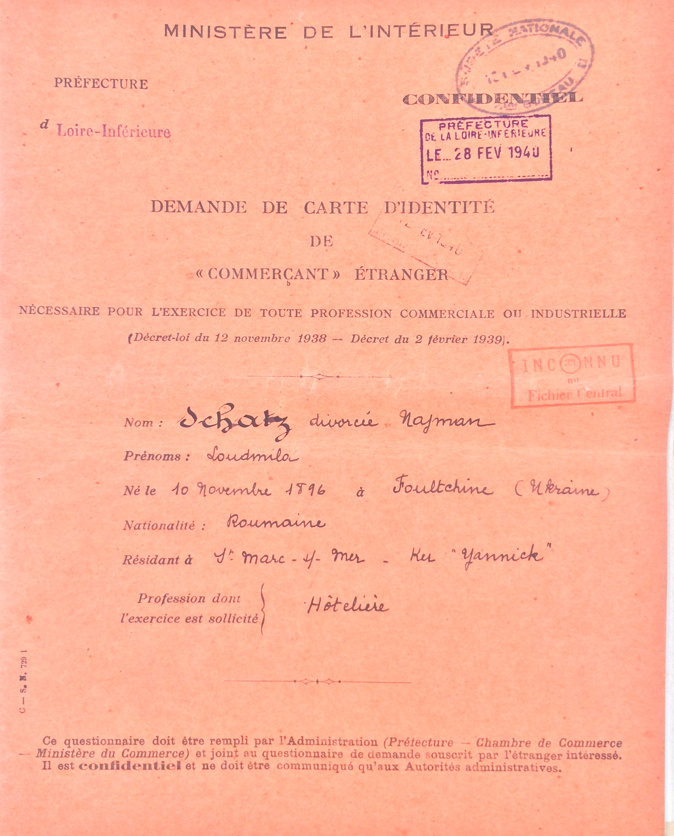 Elle obtient sa carte de commerçant étranger le 25 février 1940 après dépôt de dossier, approbation de la sous-préfecture de Saint-Nazaire et de la chambre de commerce de Nantes qui eu égard à sa présence en France lui accorde de « façon exceptionnelle » l’autorisation d’exploiter la pension de famille.