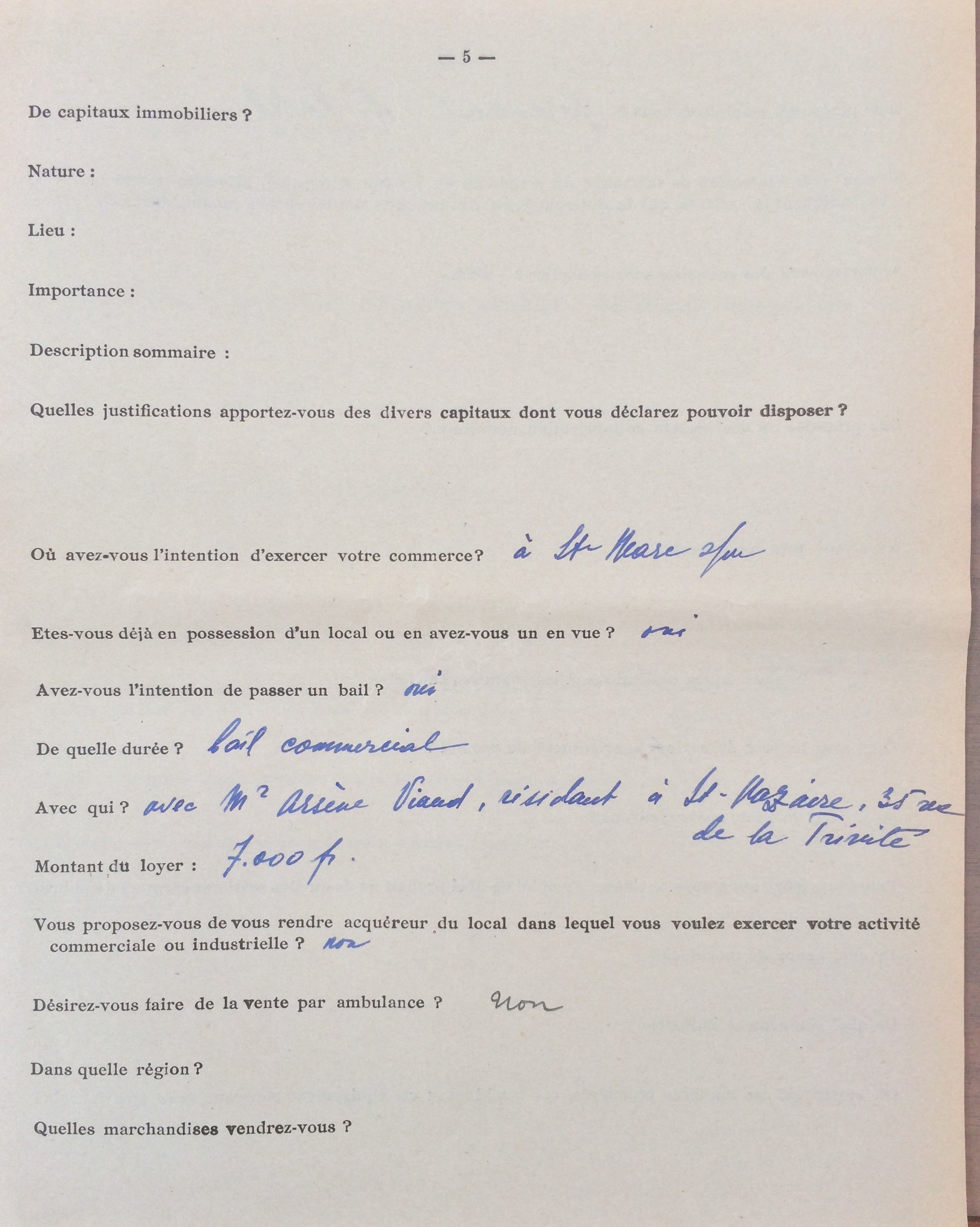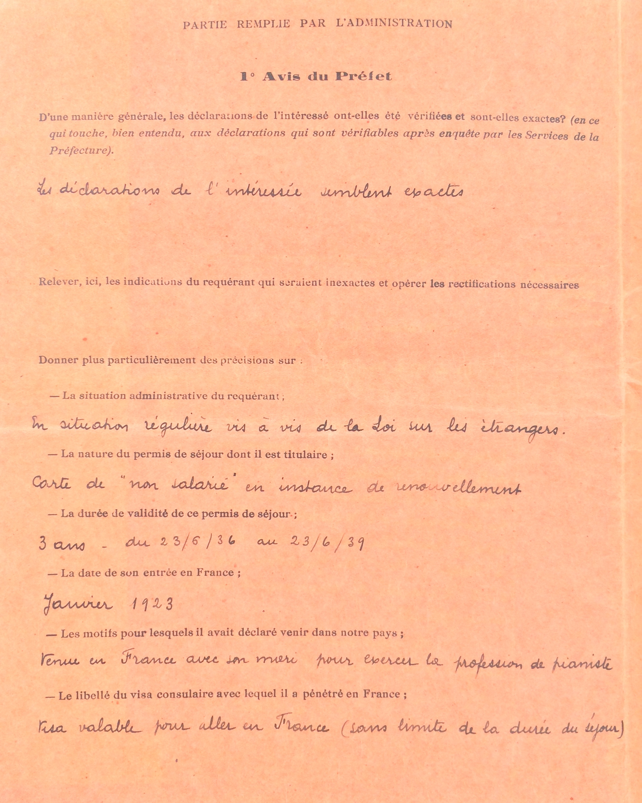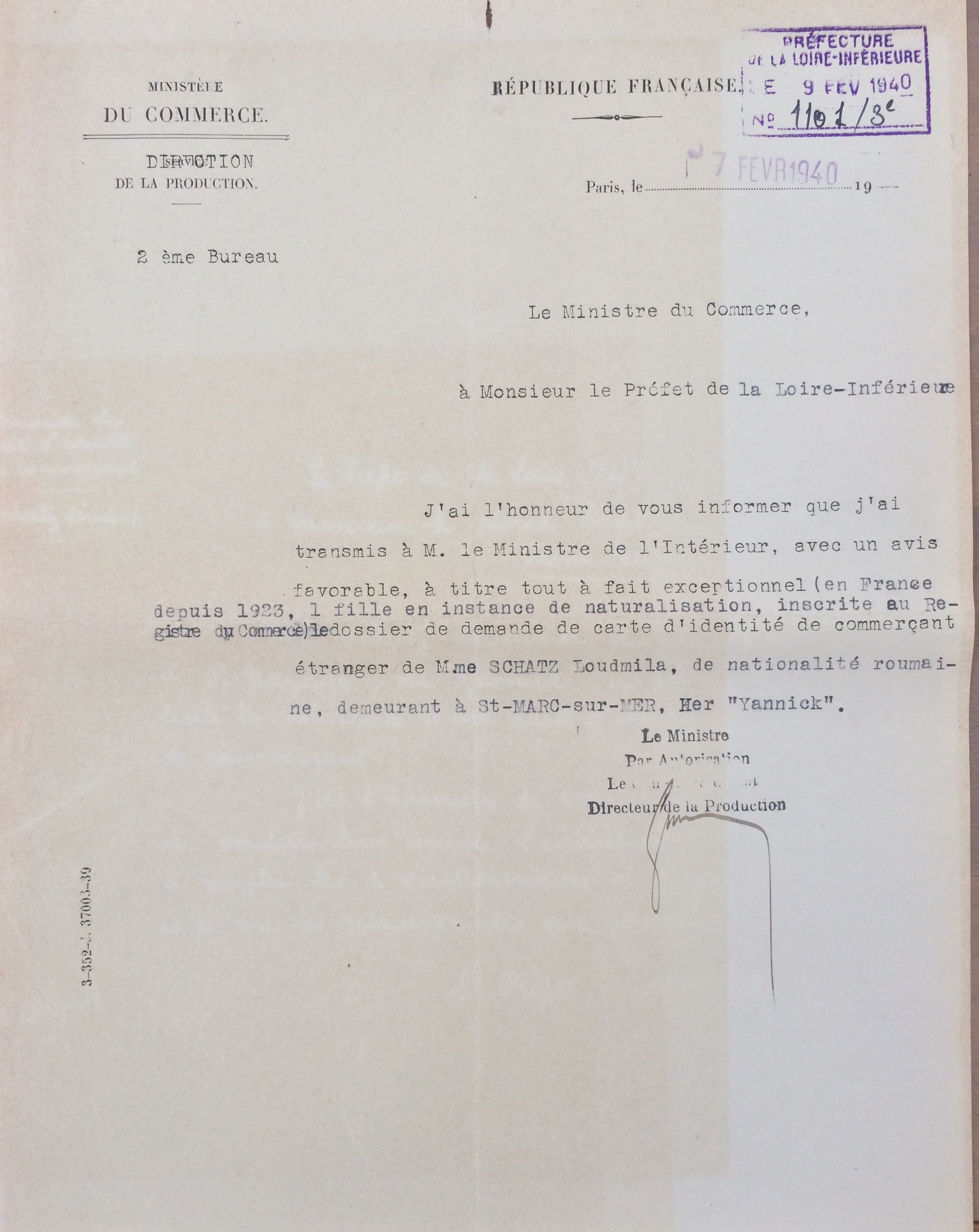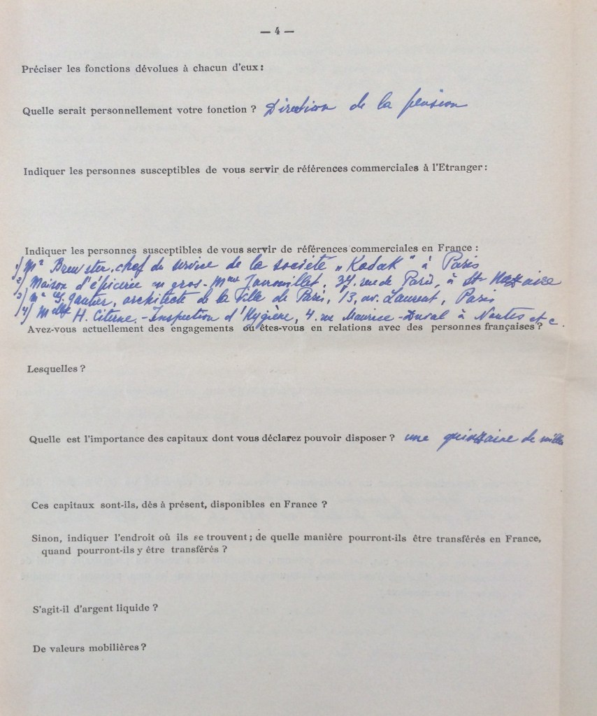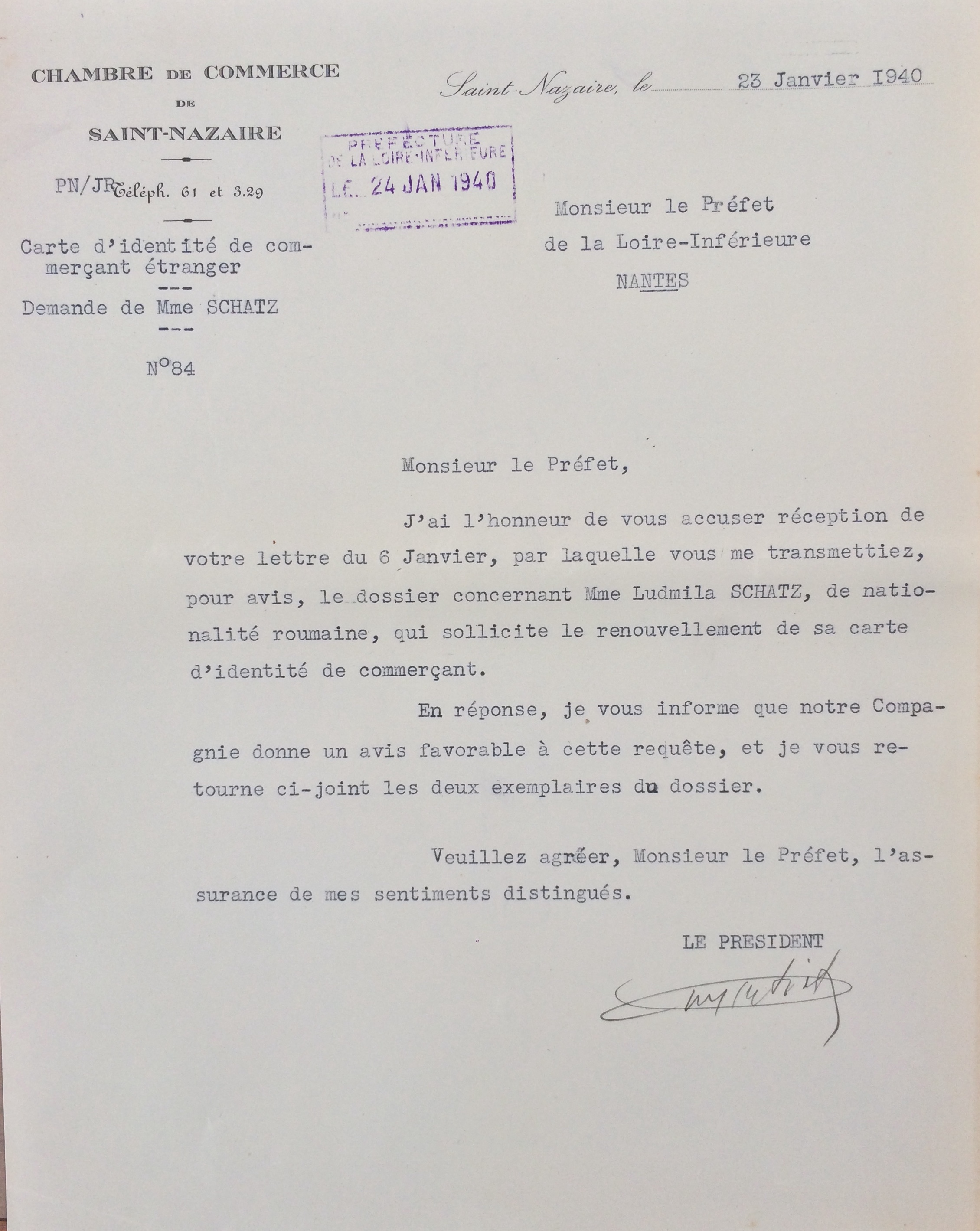 Elle obtient sa carte de commerçant étranger le 25 février 1940 après dépôt de dossier, approbation de la sous-préfecture de Saint-Nazaire et de la chambre de commerce de Nantes qui eu égard à sa présence en France lui accorde de « façon exceptionnelle » l’autorisation d’exploiter la pension de famille.