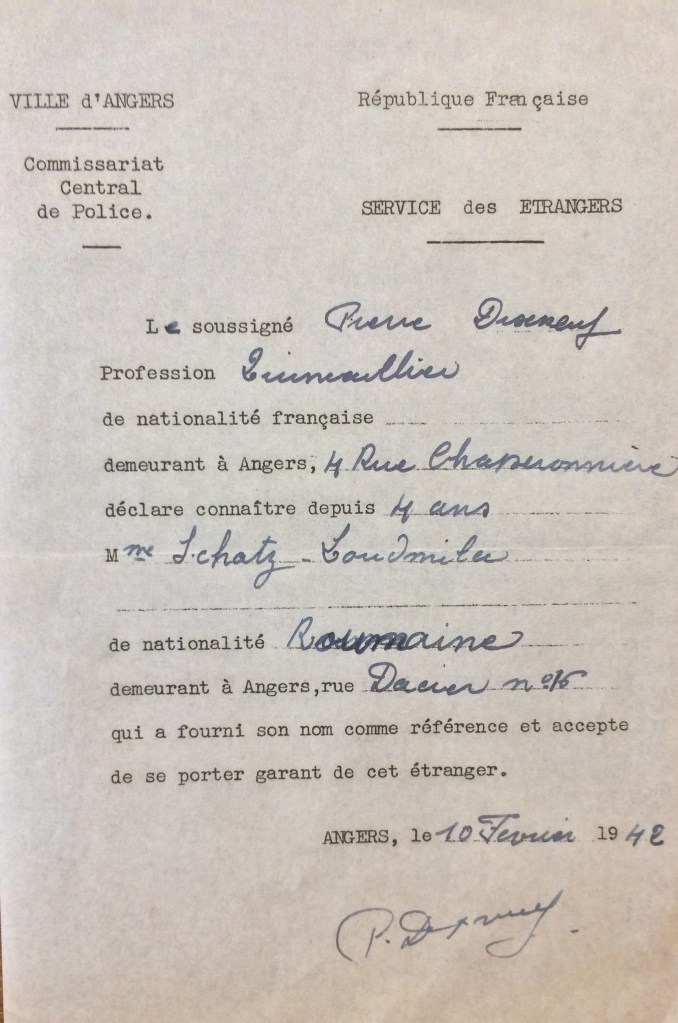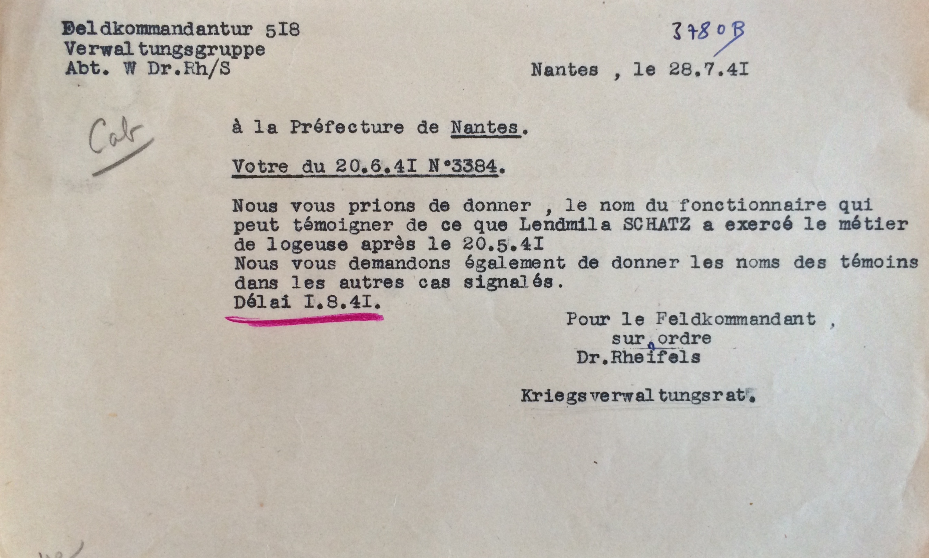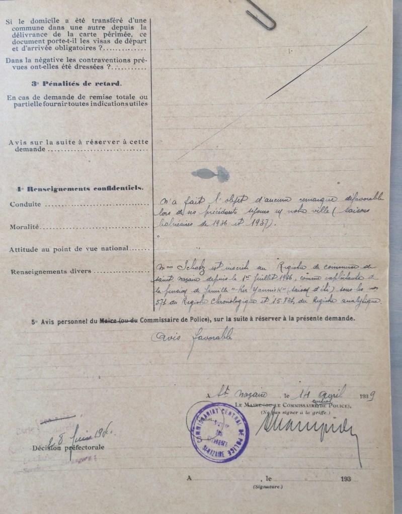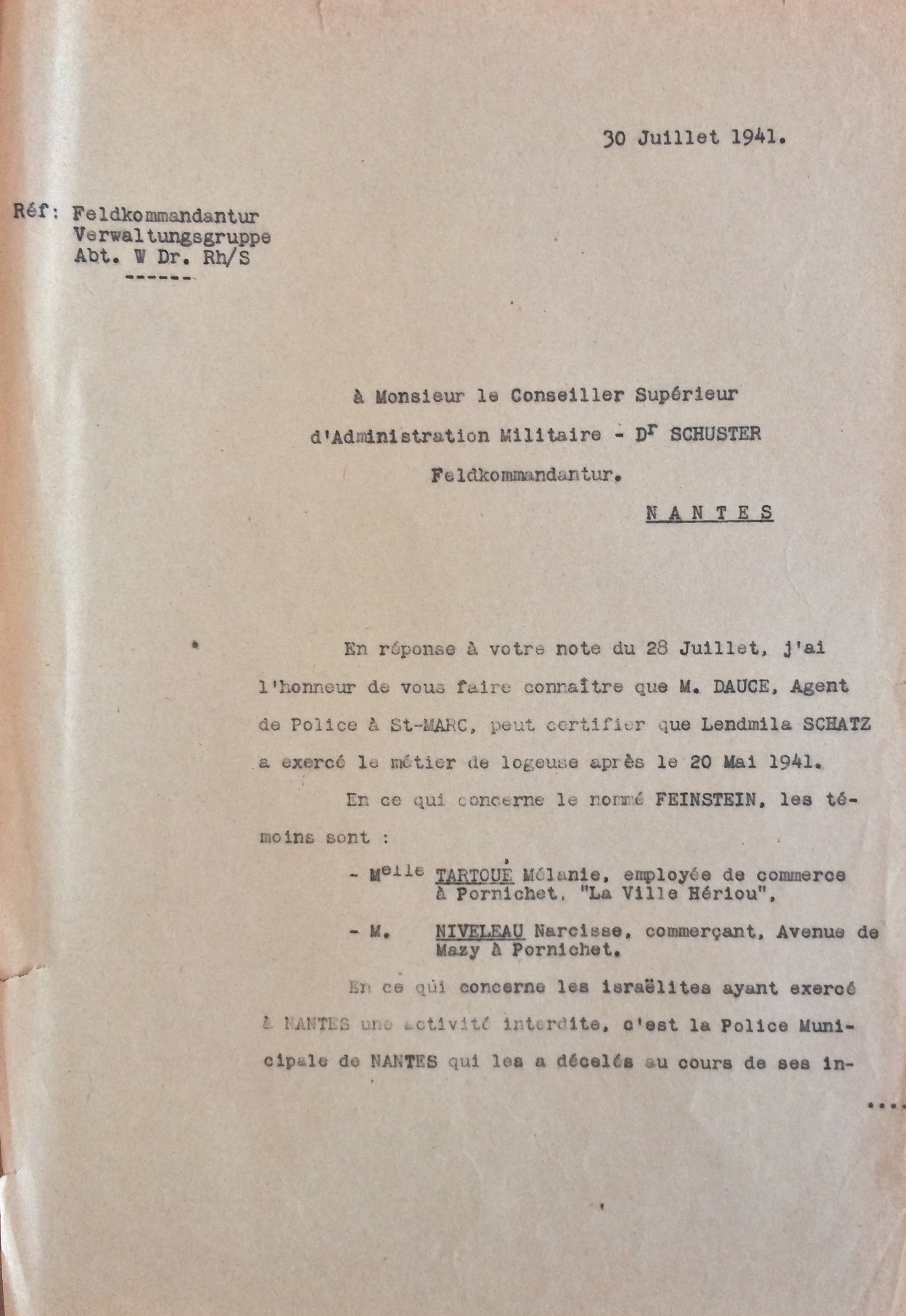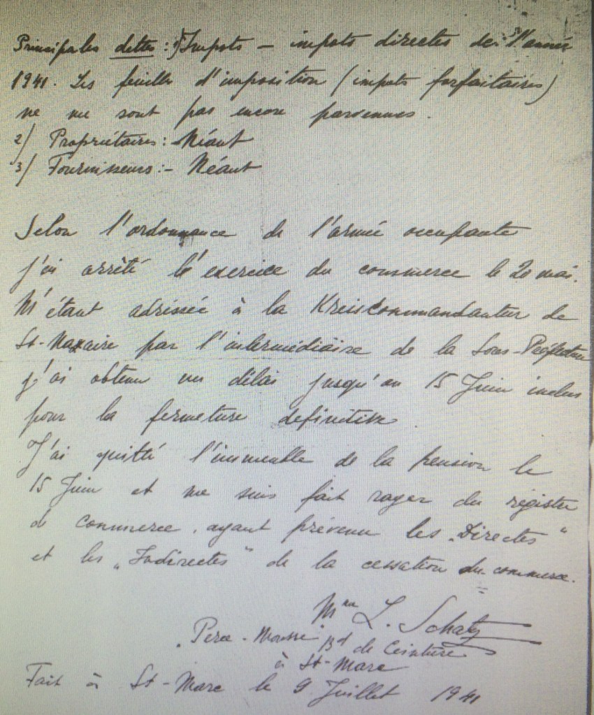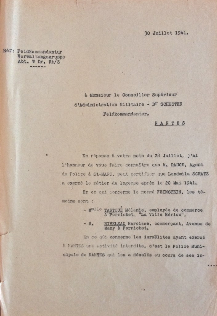De fréquents contrôles tant du côté allemand que français ont lieu pour vérifier que les Juifs ont effectivement cessé toute activité. C’est le cas en juillet 1941 où des renseignements sont demandés par les autorités allemandes au sujet de l’ouverture du commerce. Les autorités françaises répondent favorablement à la demande allemande pour je cite « Monsieur DAUCE, agent de police à Saint-Marc, peut certifier que Ludmilla SCHATZ a exercé le métier de logeuse après le 20 mai 1941« .