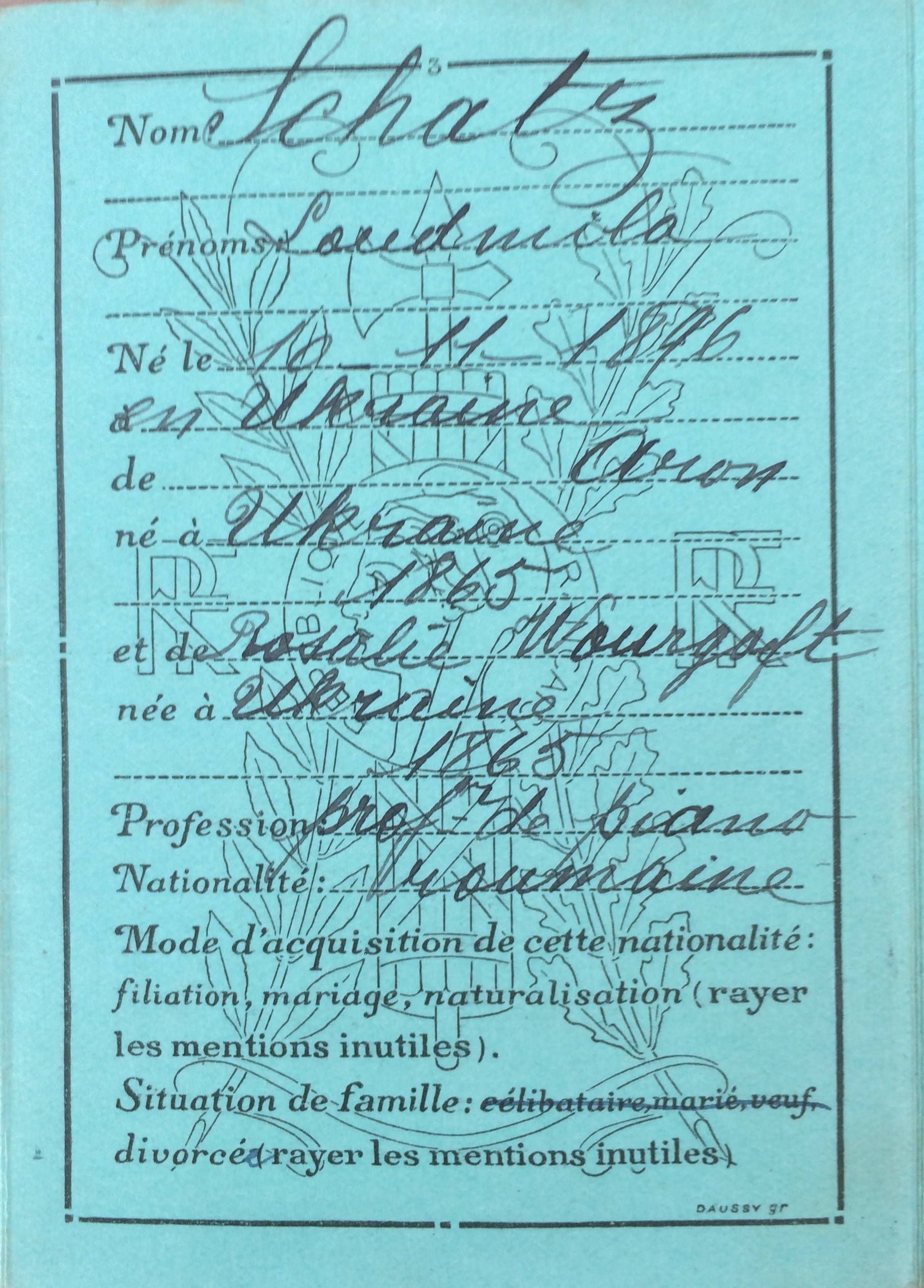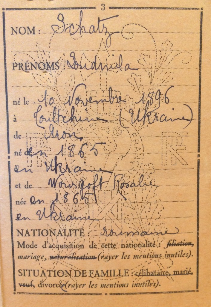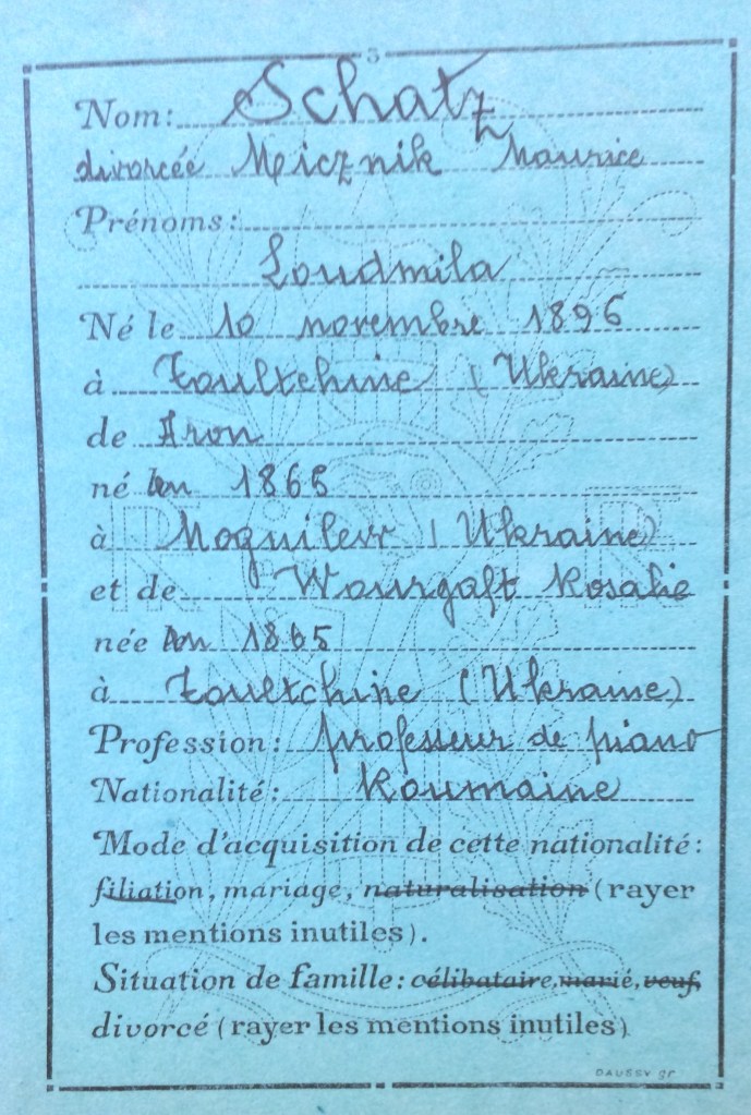 Ludmilla Bluma SCHATZ (ou Loudmilla) est née le 10 novembre 1896 à Toultchine ou Toultchyn (Ukraine). [Père : SCHATZ Aaron né en 1865 et Mère : SCHATZ Rosalia née WOURGAFT né le 20 mai 1875 à Toultchine (Ukraine)].