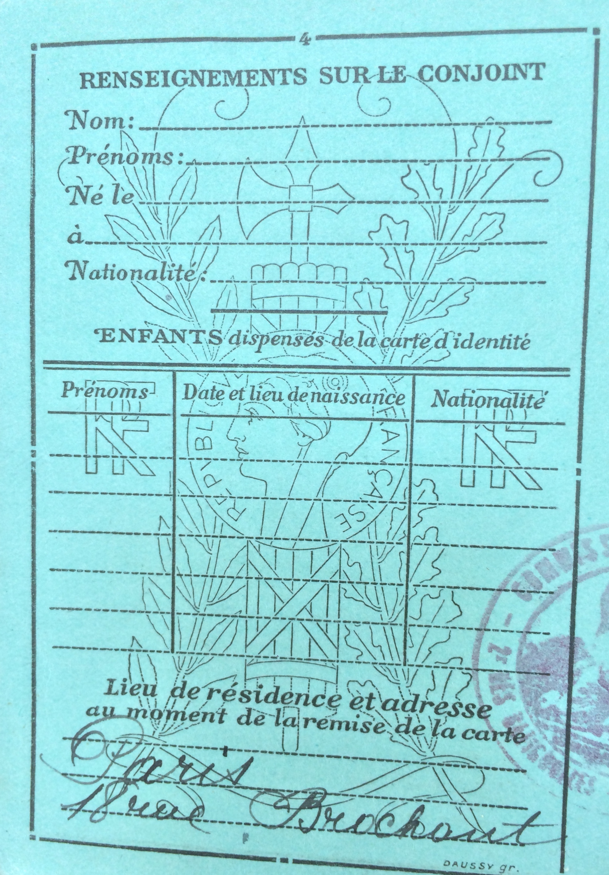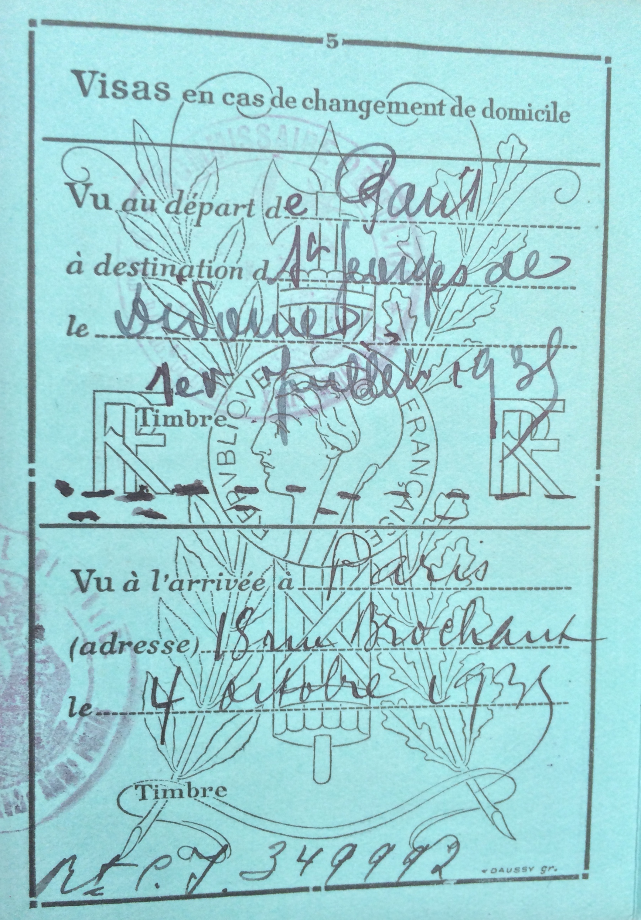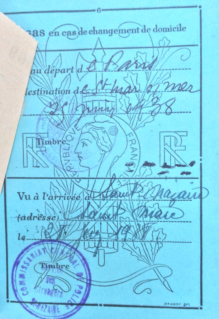 Venant du 18, rue Brochant dans le 17ème arrondissement à Paris elle effectue un déplacement à Saint-Georges-de-Divonne (commune la plus près de l’île d’Oleron desservie par le train) le 01 juillet 1935 et rentre à Paris à la fin de la saison le 04 octobre 1935 à la même adresse.