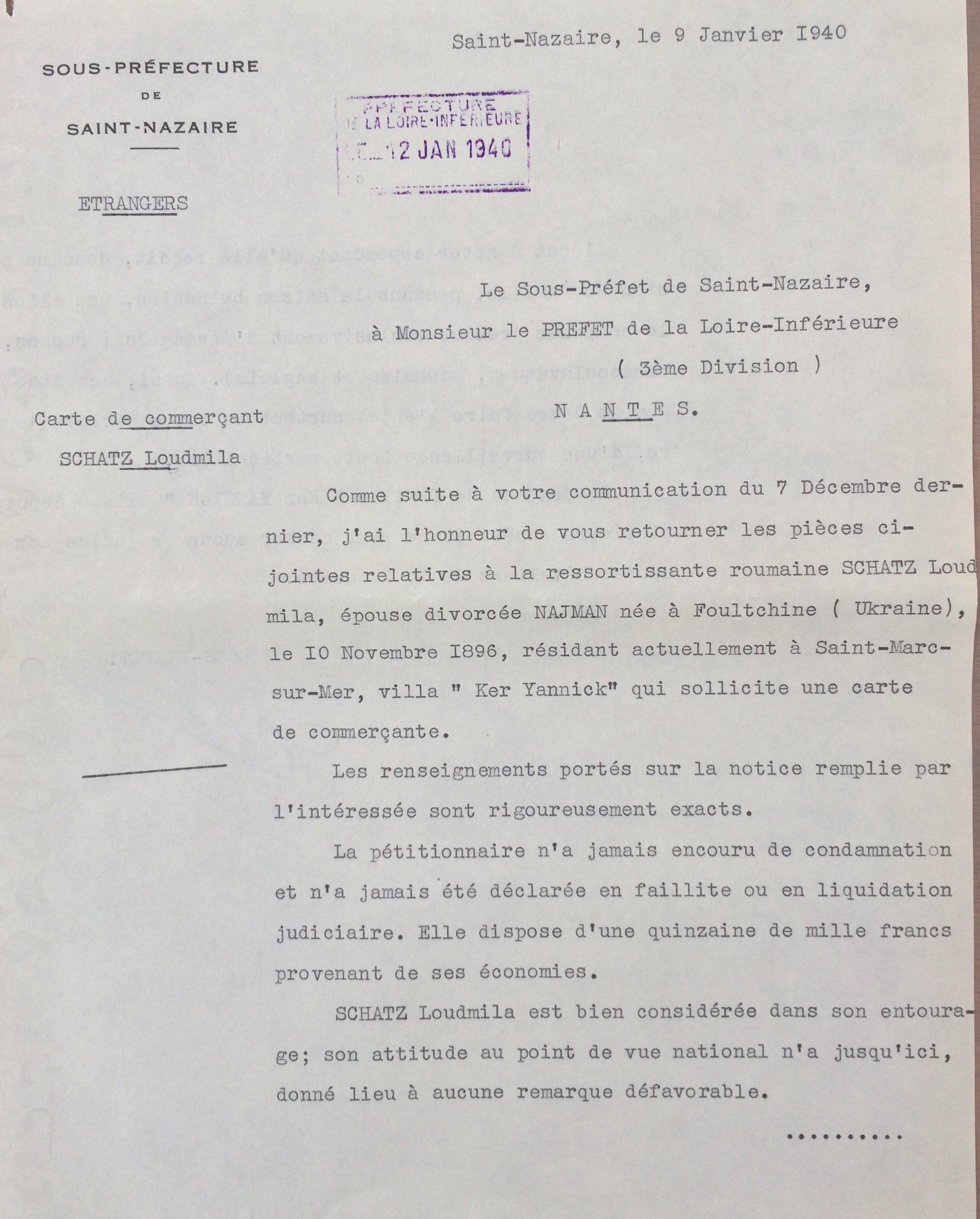 Lettre de Ludmilla SCHATZ à la sous-préfecture de Saint-Nazaire 09 juillet 1941 [Dossier d’aryanisation de Ludmilla SCHATZ, AN AJ/38/4598 dossier n°2527]