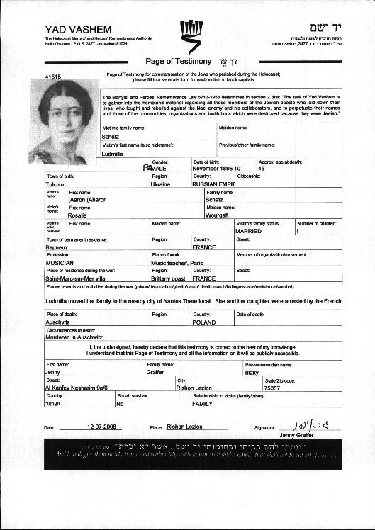 Jenny GRAIFER et Anna VOITINSKY témoigneront sur le site de Yad Vashem en mémoire de Ludmilla, Nadine et Rosalia SCHATZ en 2004 et en juillet 2008.