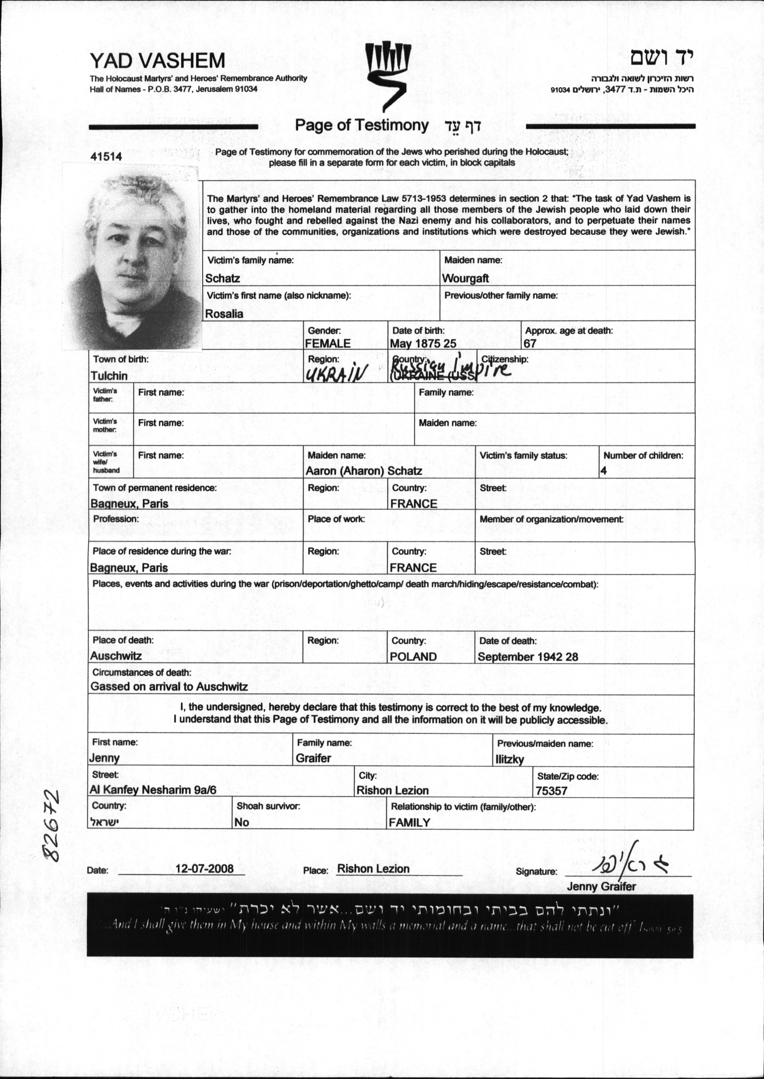 Rosalia WOURGAFT, la grand-mère de Nadine et mère de Ludmilla est déportée par le convoi 38 du 28 septembre 1942 de Drancy à Auschwitz.