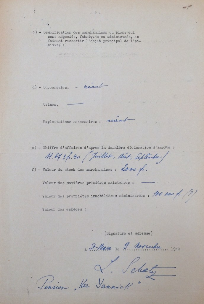 Conformément à la 2ème ordonnance allemande du 18 octobre 1940, Ludmilla SCHATZ déclare son commerce auprès des services de la sous-préfecture les 31 octobre et 09 novembre 1940.