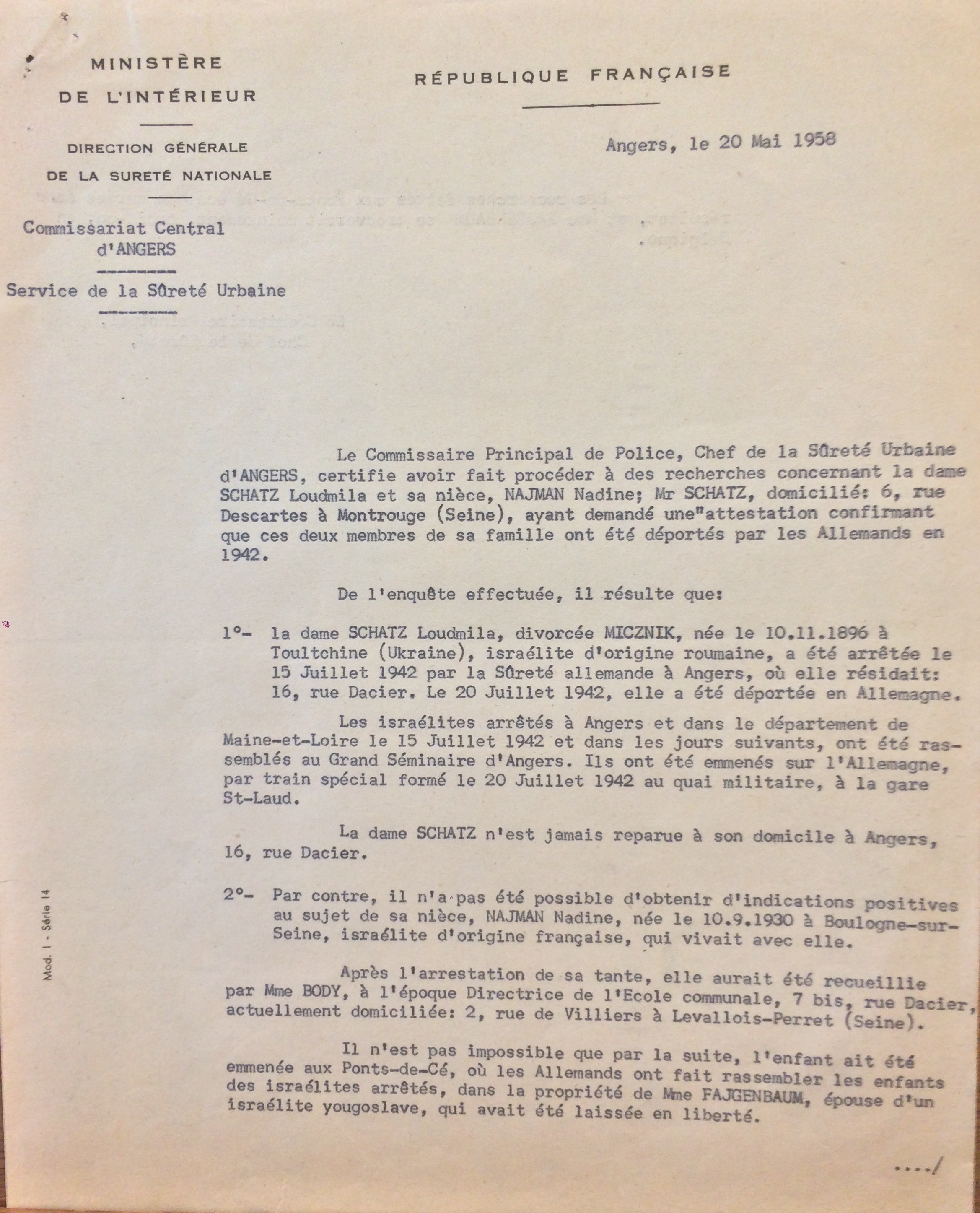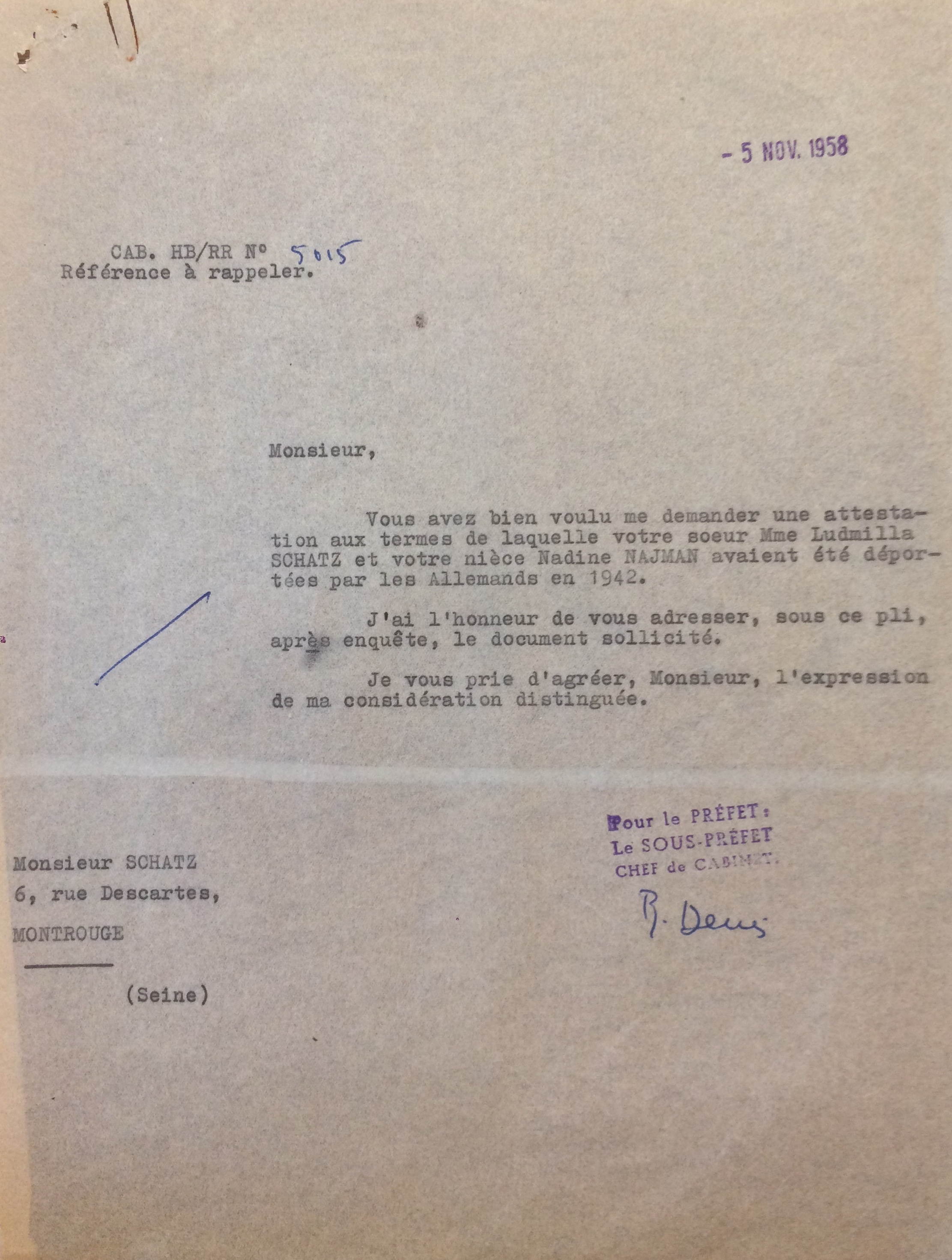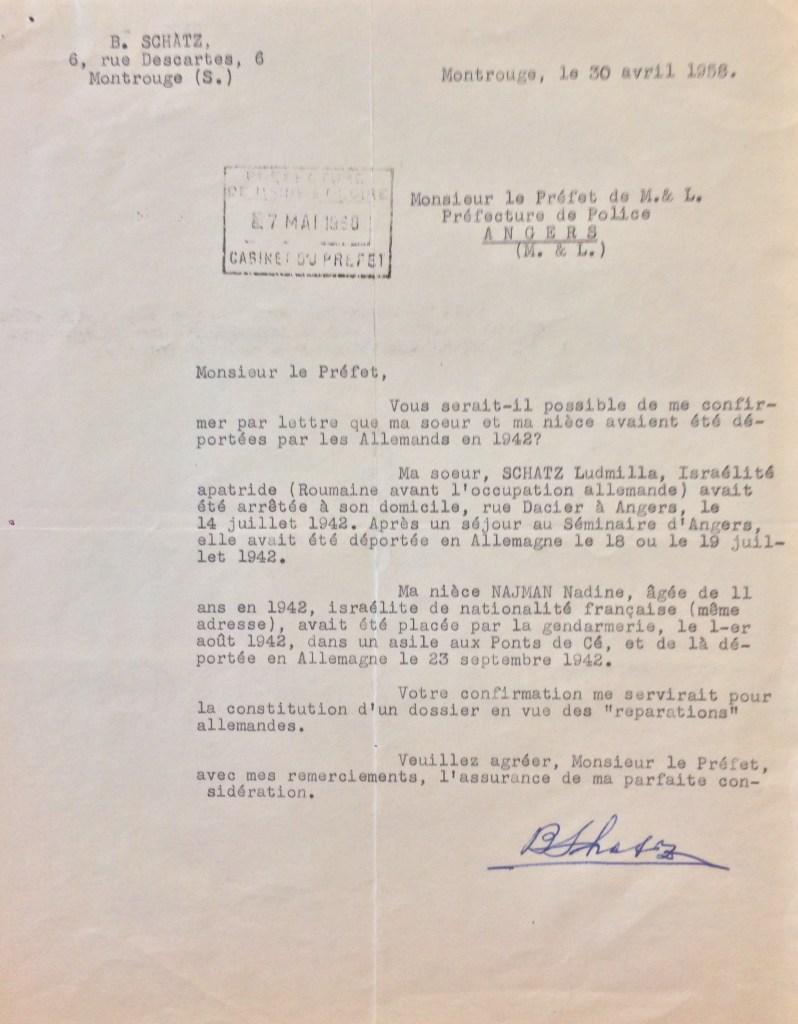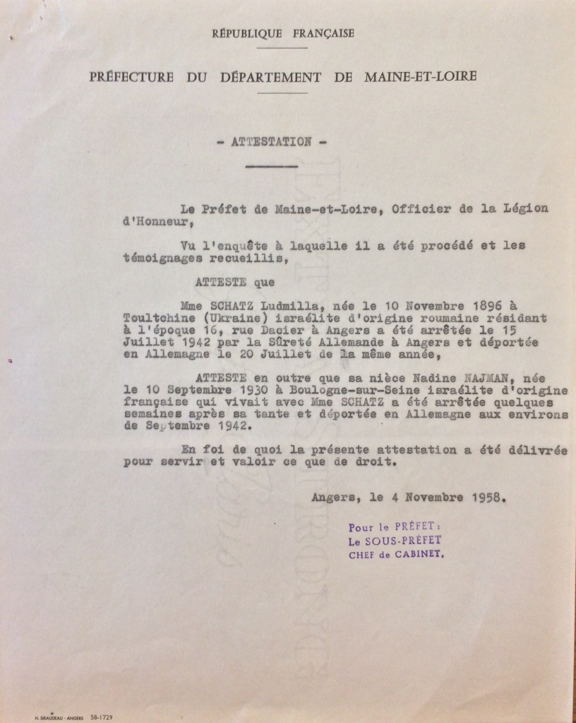 Boris SCHATZ, le frère de Ludmilla, en 1958 tentera de connaître les circonstances exactes de la déportation de sa soeur et de sa nièce et entamera une procédure d’obtention de statut de déportée politique pour sa soeur et nièce.