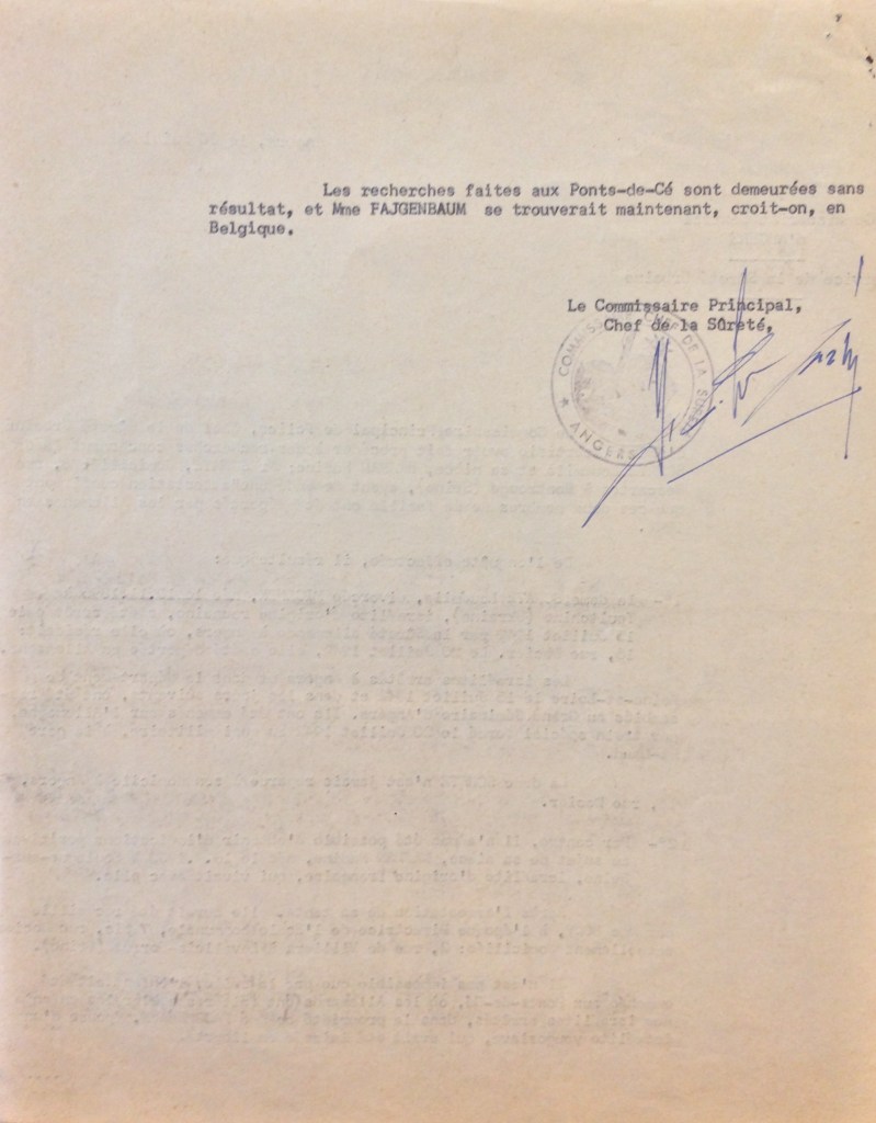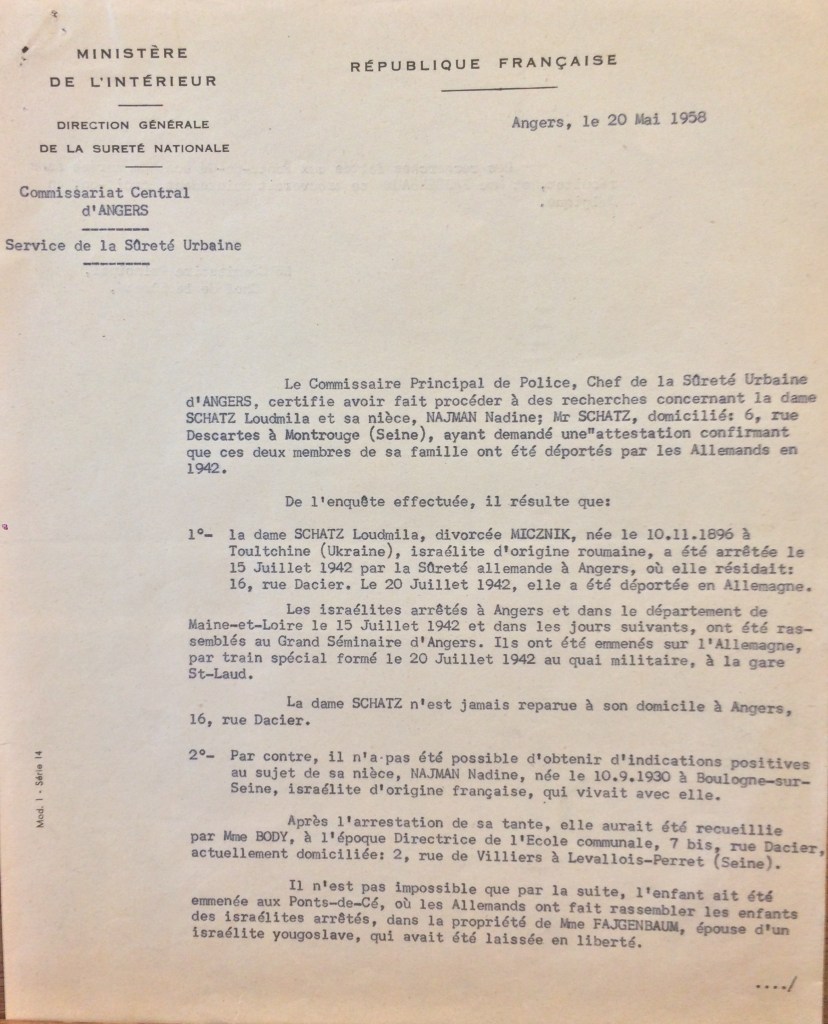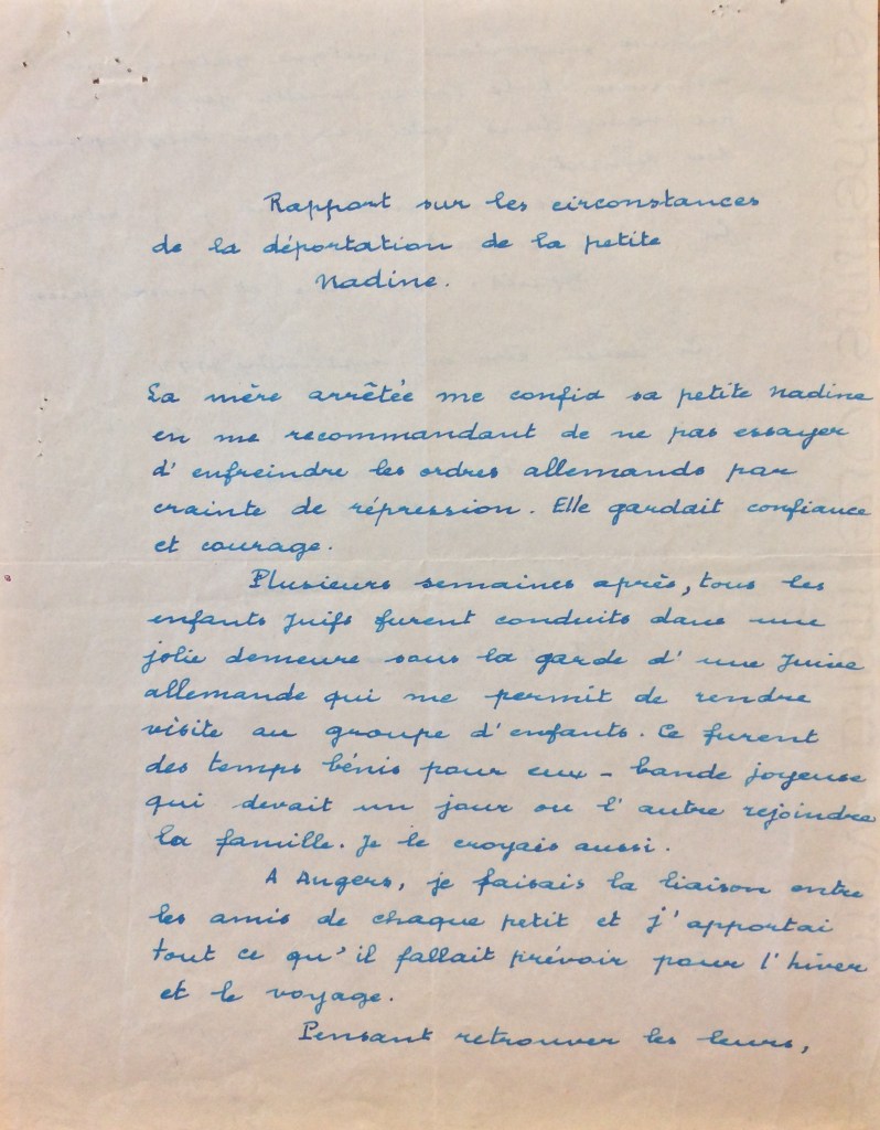 Nadine est ensuite emmenée aux Ponts-de-Cé dans la propriété de Mme FAJGENBAUM où les enfants non arrêtés en juillet 1942 ont été rassemblés. Nadine SCHATZ étant âgée de 12 ans et n’étant pas déportable en juillet 1942, elle est dirigée vers le Camp de La Lande à Monts près de Tours avec sa grand-mère puis fin août 1942, elles sont dirigées toutes les deux vers Drancy.