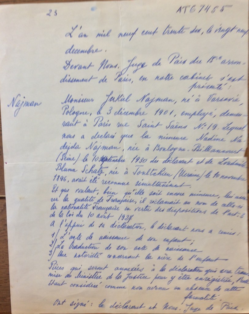 Le 29 décembre 1936, Jakiel NAJMAN demande la nationalité française pour Nadine devant un juge de paix.