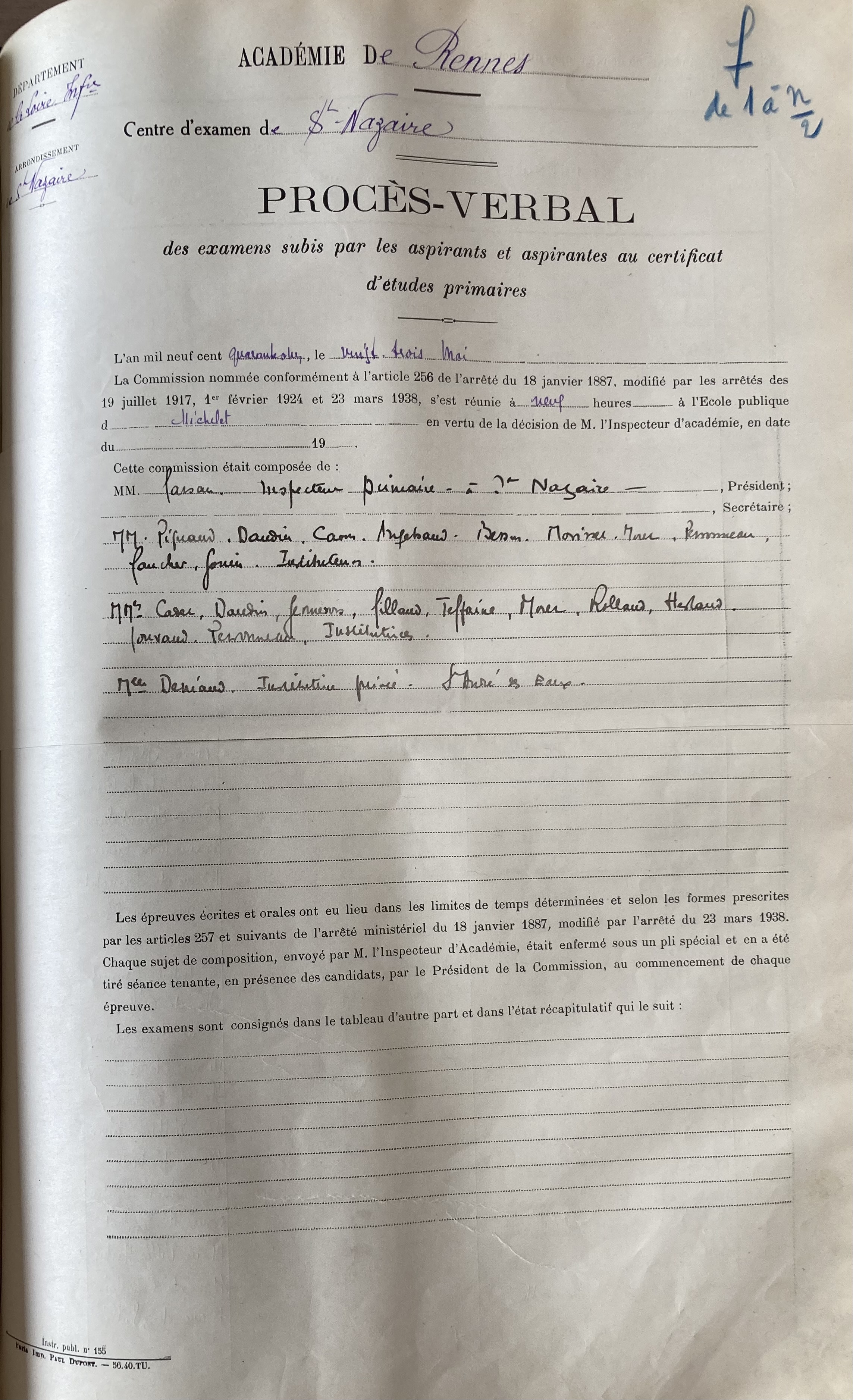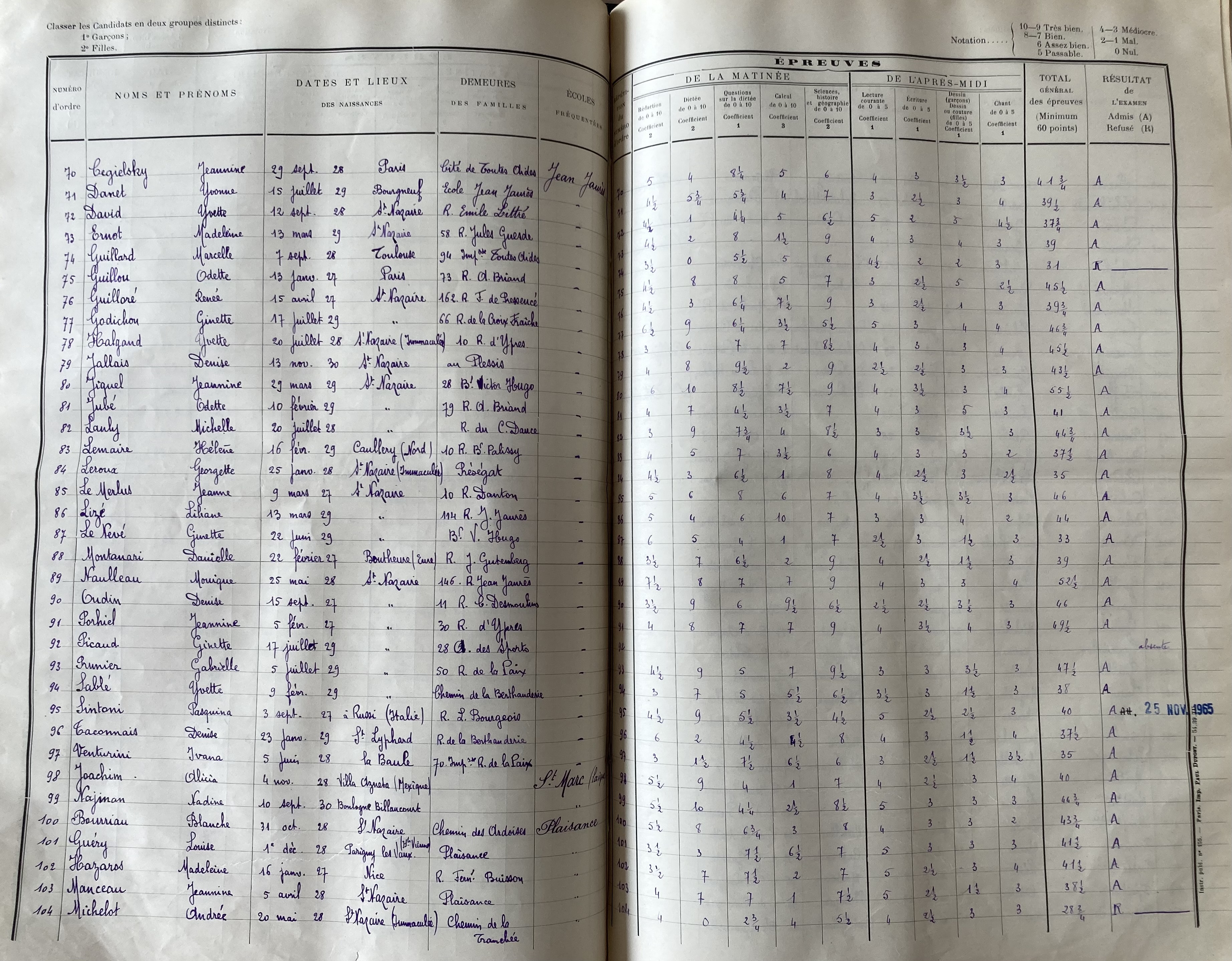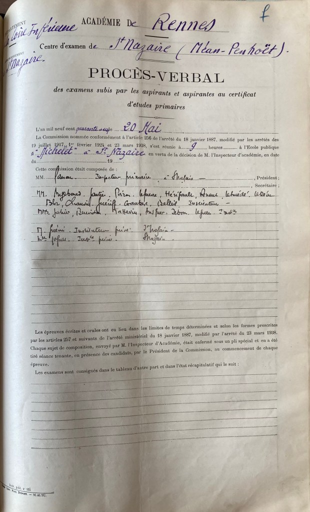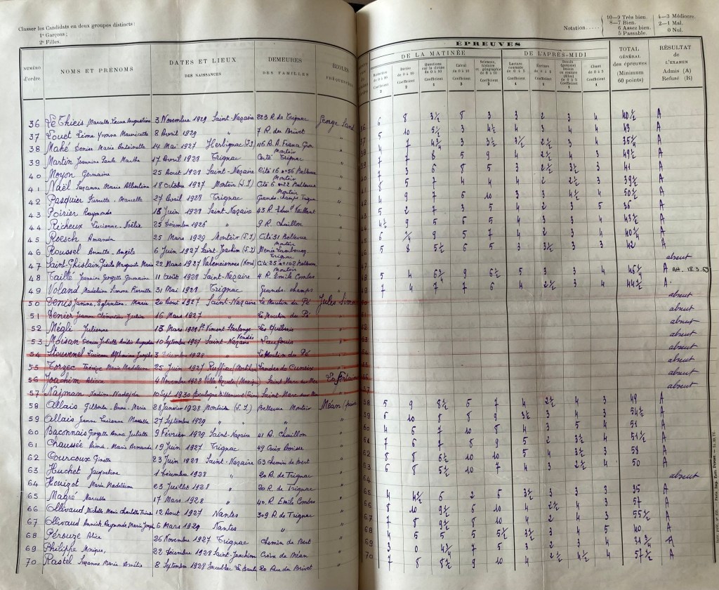 Nadine, qui est scolarisée à l’Ecole Publique de Saint-Marc passe son Certificat d’Etudes en mai 1941. D’abord absente vers le 20 mai 1941, elle est présente vers le 23 mai 1941. C’est une des plus jeunes à être présentée au certificat d’études.