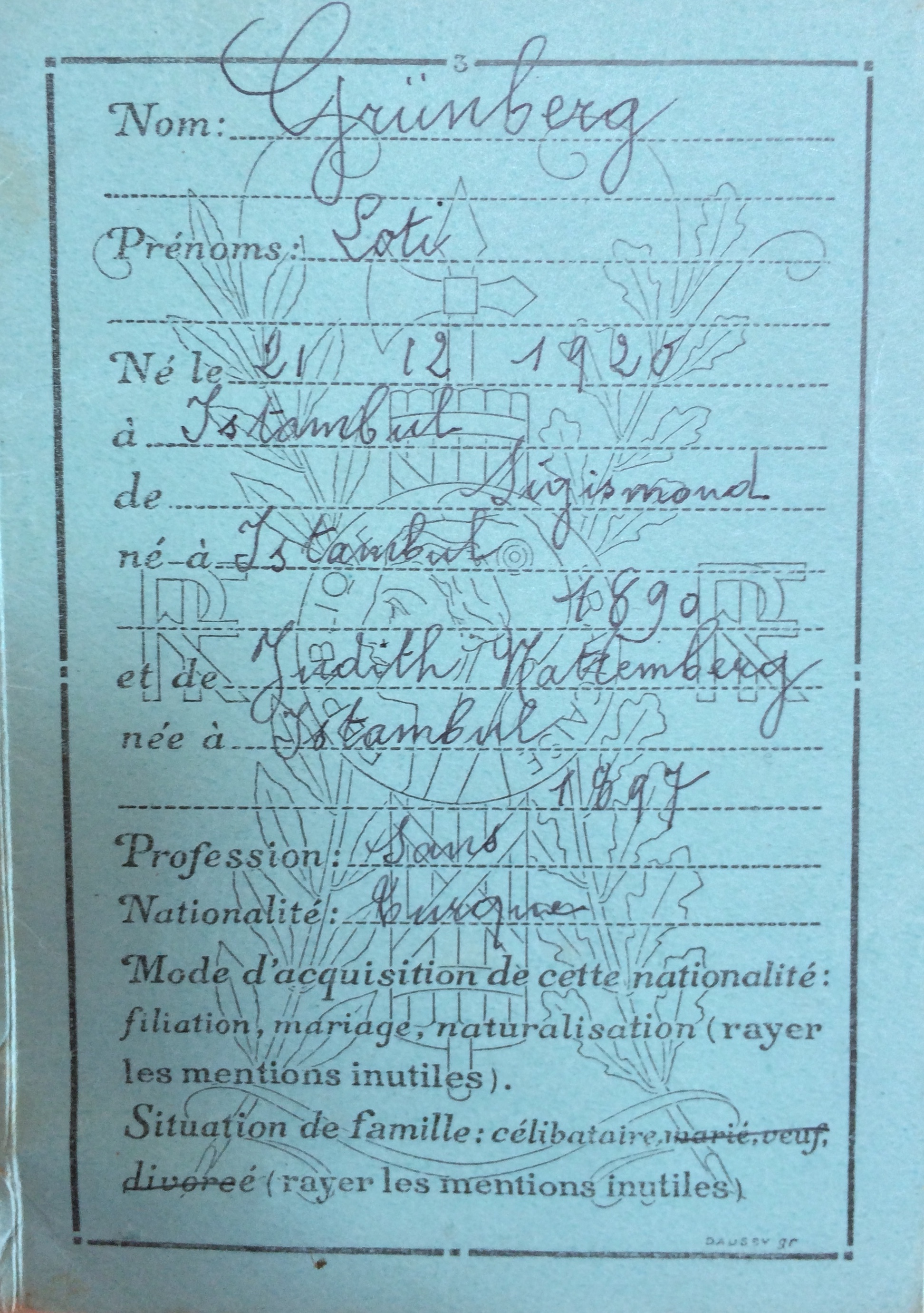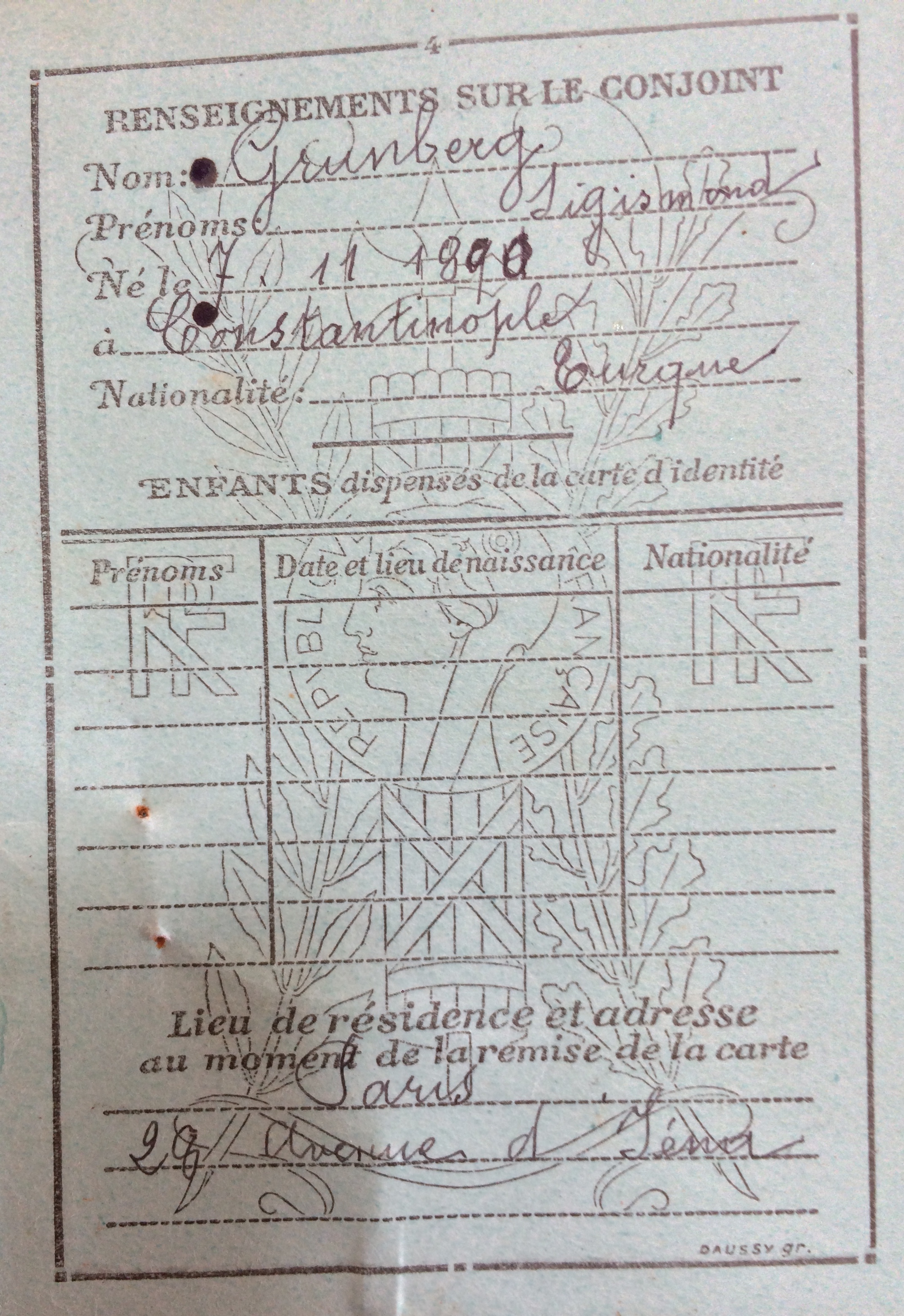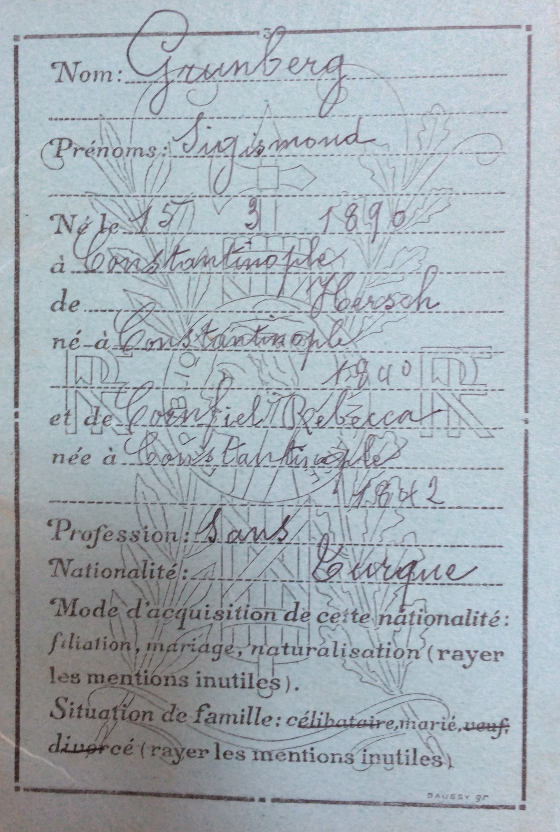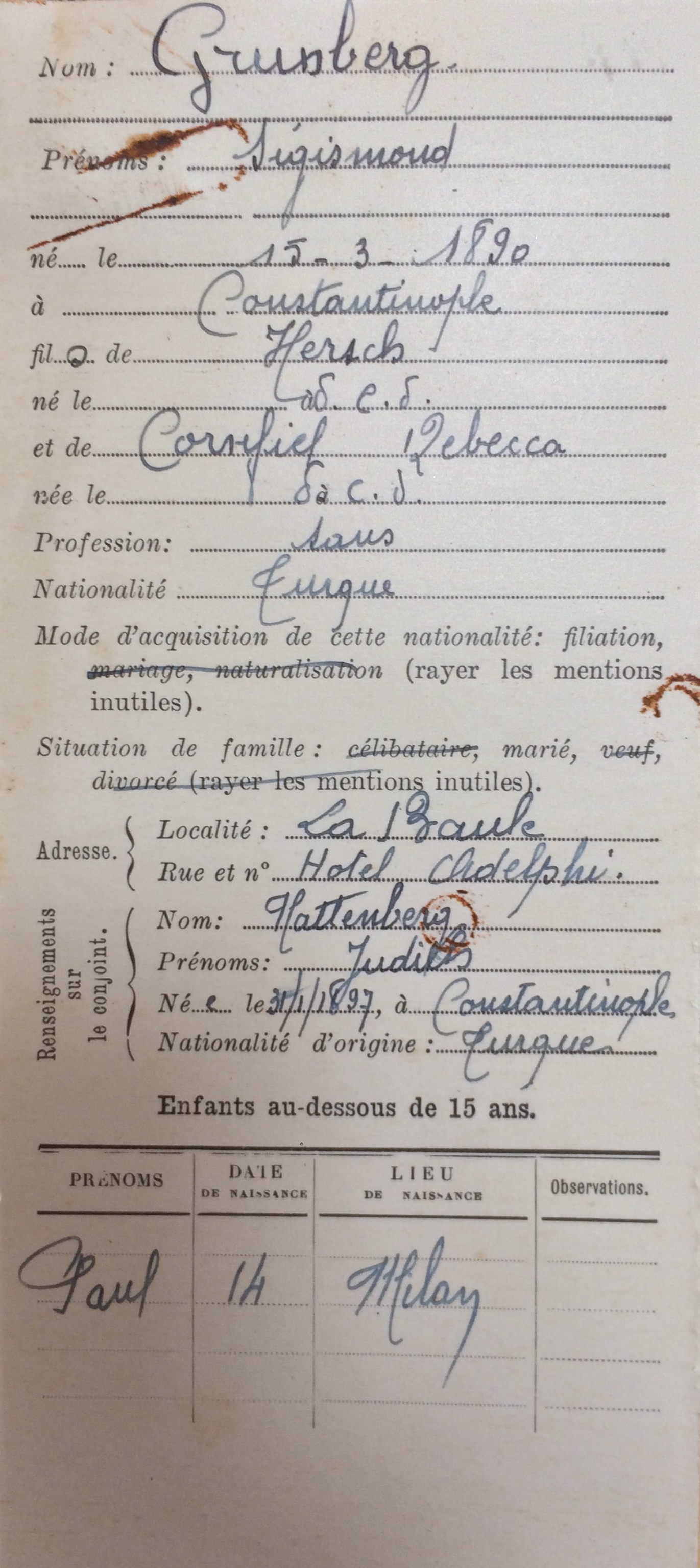 Sigismond GRÜNBERG est né le 15 mars 1890 à Constantinople (Turquie [Père : GRÜNBERG Hersch et Mère : CORNFIEL Rebecca] et est marié avec Judith SIGISMOND née NATTENBERG née le 31 janvier 1897 à Constantinople (Turquie). Ils ont deux enfants : l’aînée Loti née le 21 décembre 1920 à Istamboul (Turquie) et Paul le cadet né à Milan (Italie) en 1925.