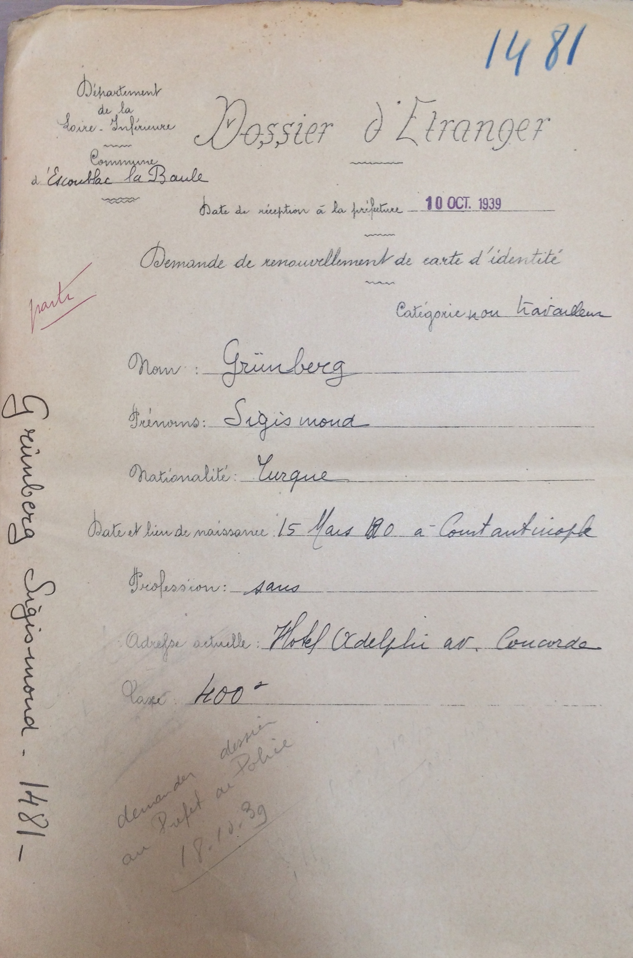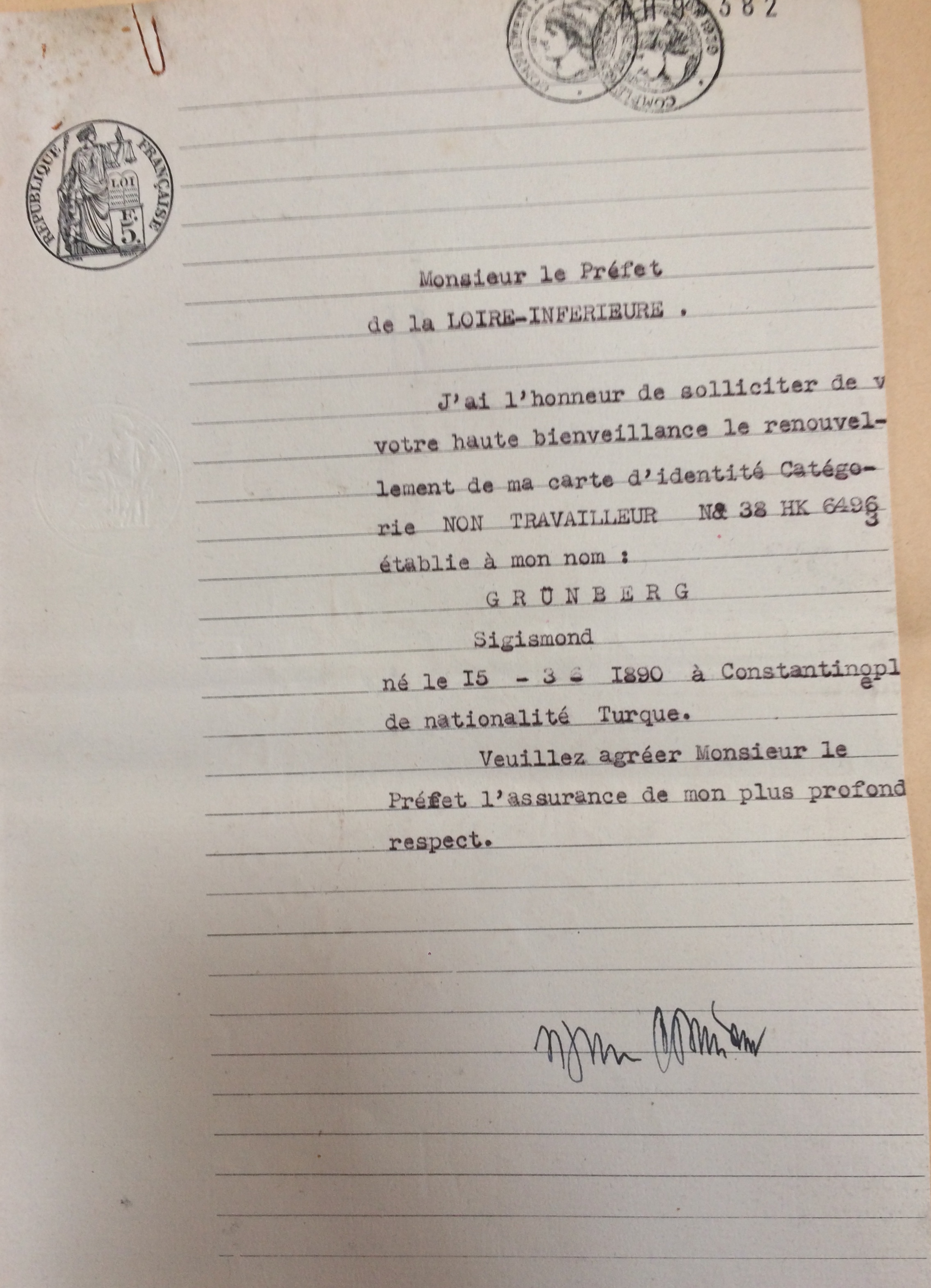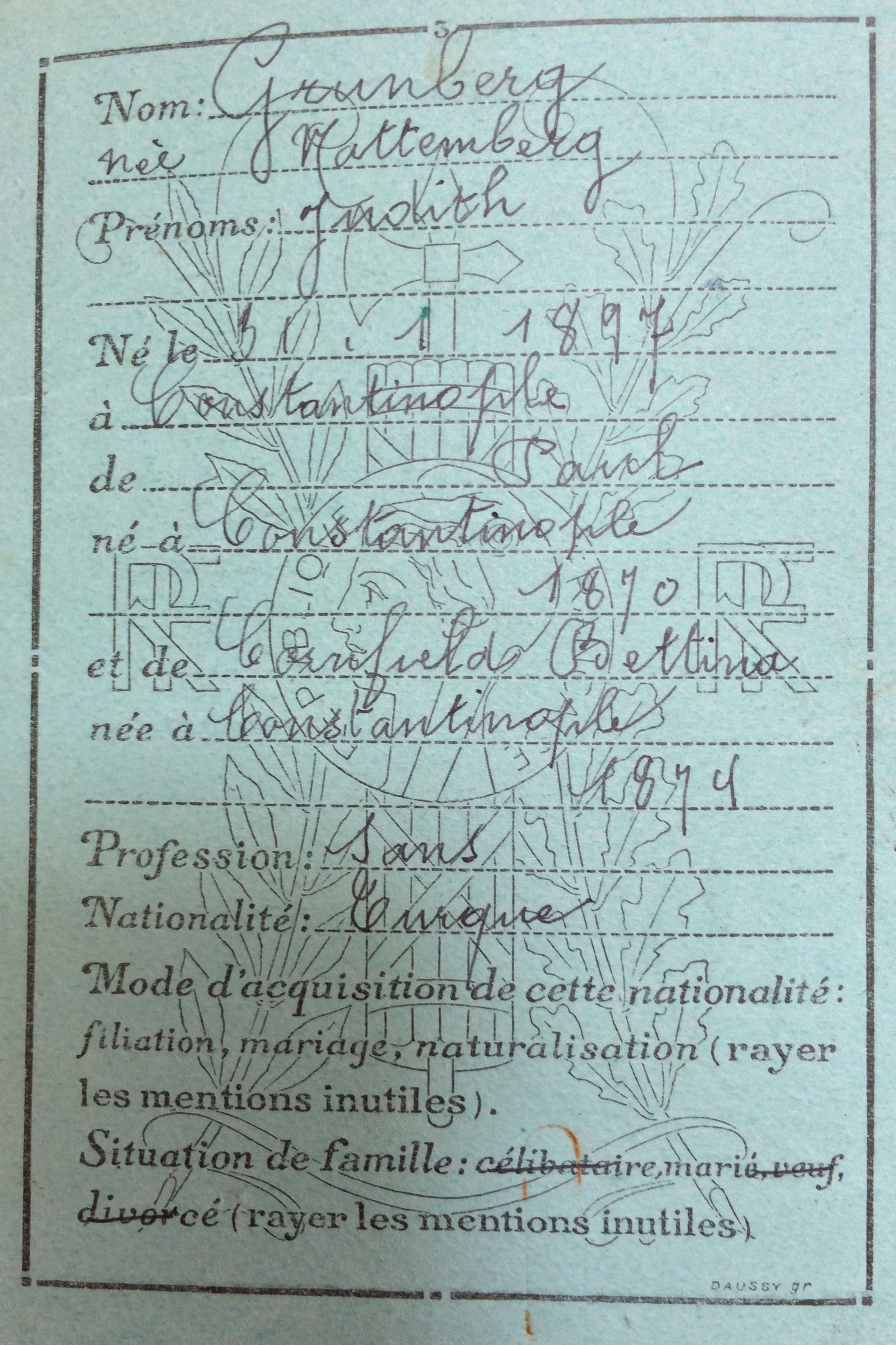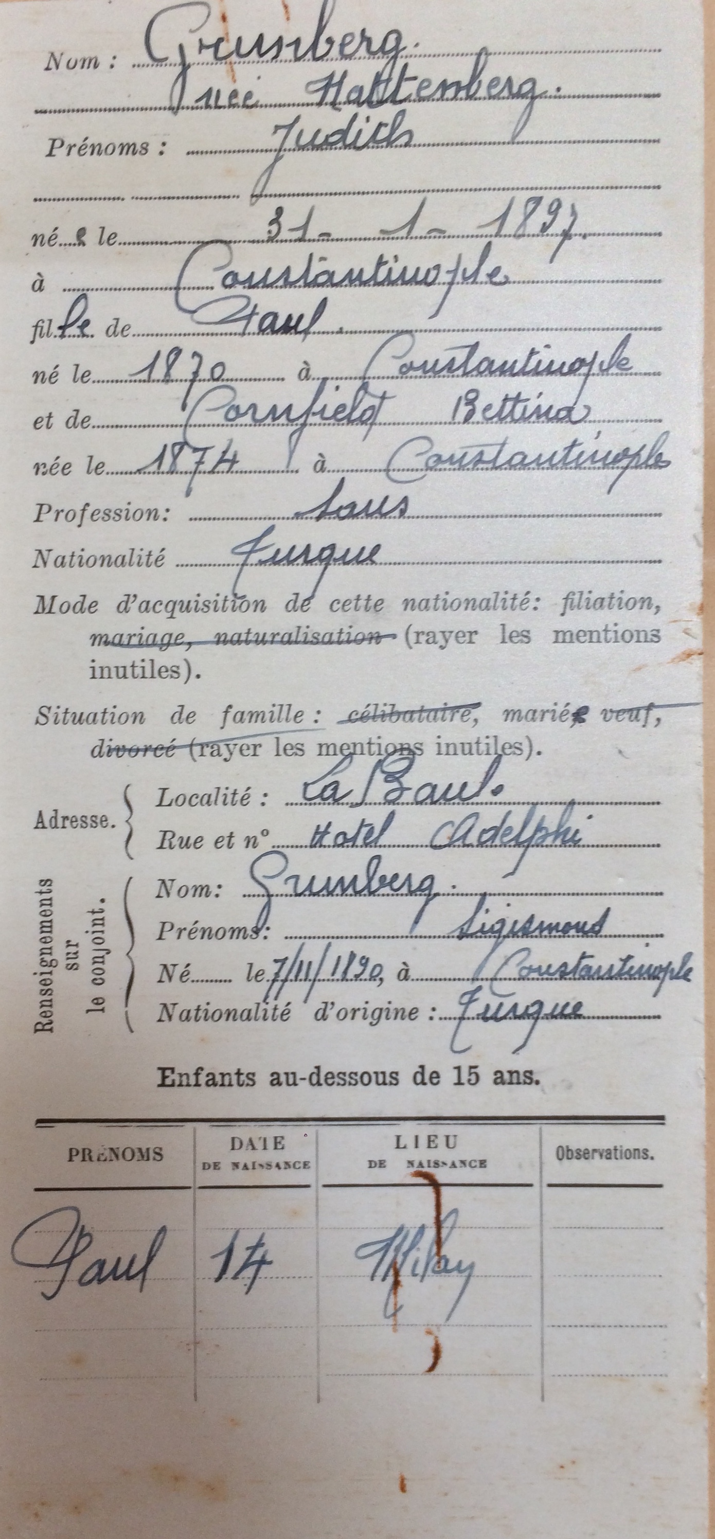 Sigismond GRÜNBERG est né le 15 mars 1890 à Constantinople (Turquie [Père : GRÜNBERG Hersch et Mère : CORNFIEL Rebecca] et est marié avec Judith SIGISMOND née NATTENBERG née le 31 janvier 1897 à Constantinople (Turquie). Ils ont deux enfants : l’aînée Loti née le 21 décembre 1920 à Istamboul (Turquie) et Paul le cadet né à Milan (Italie) en 1925.