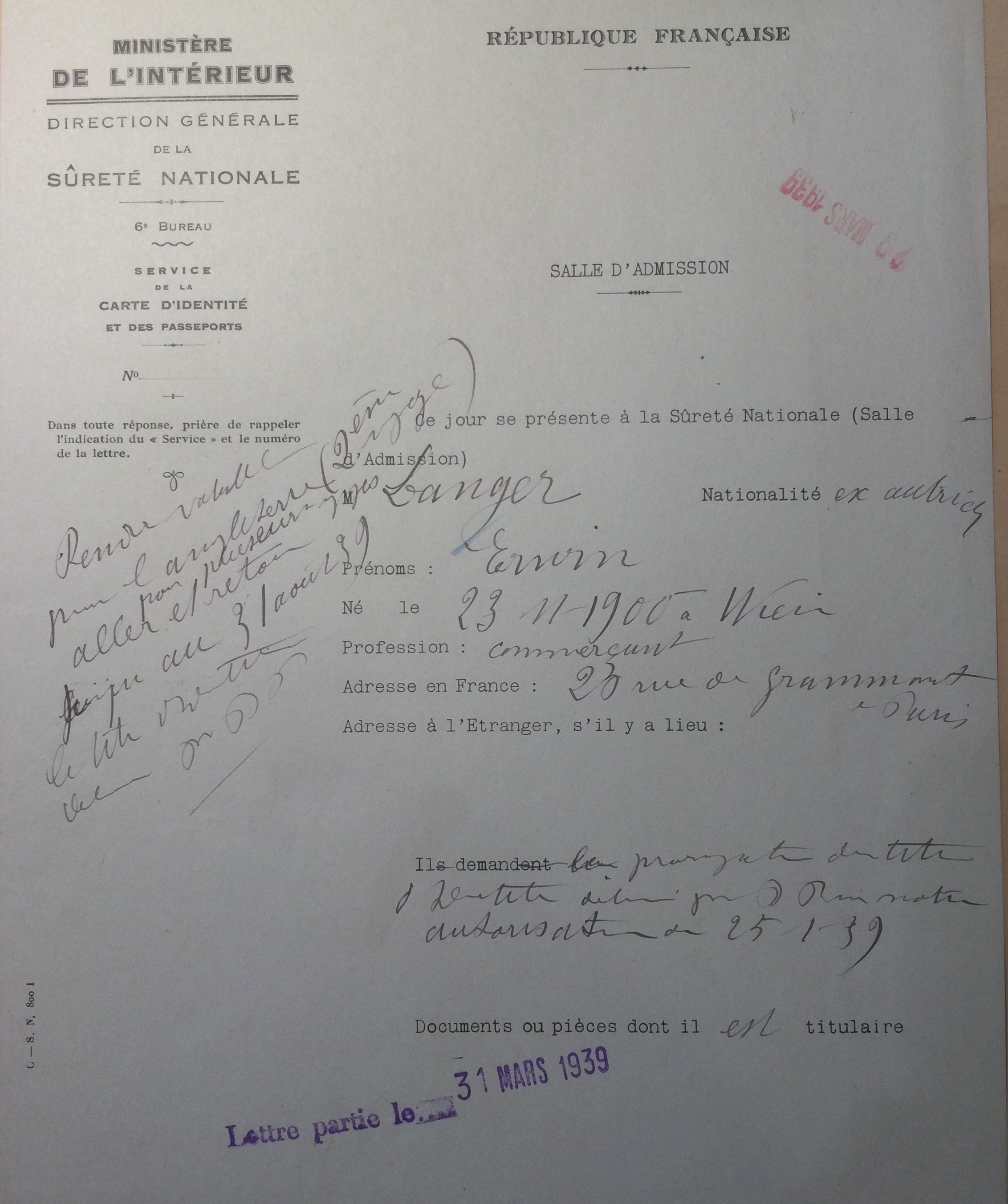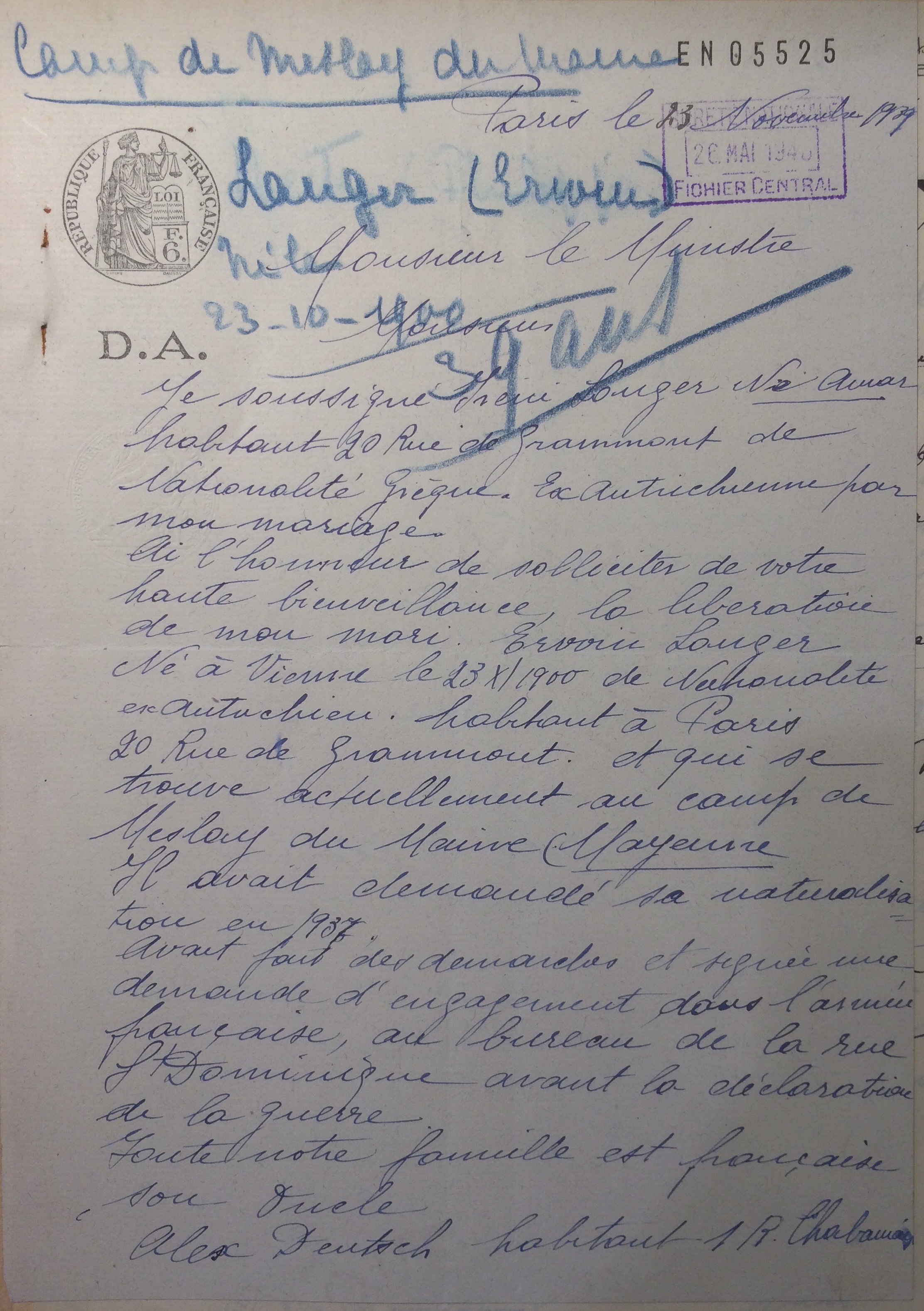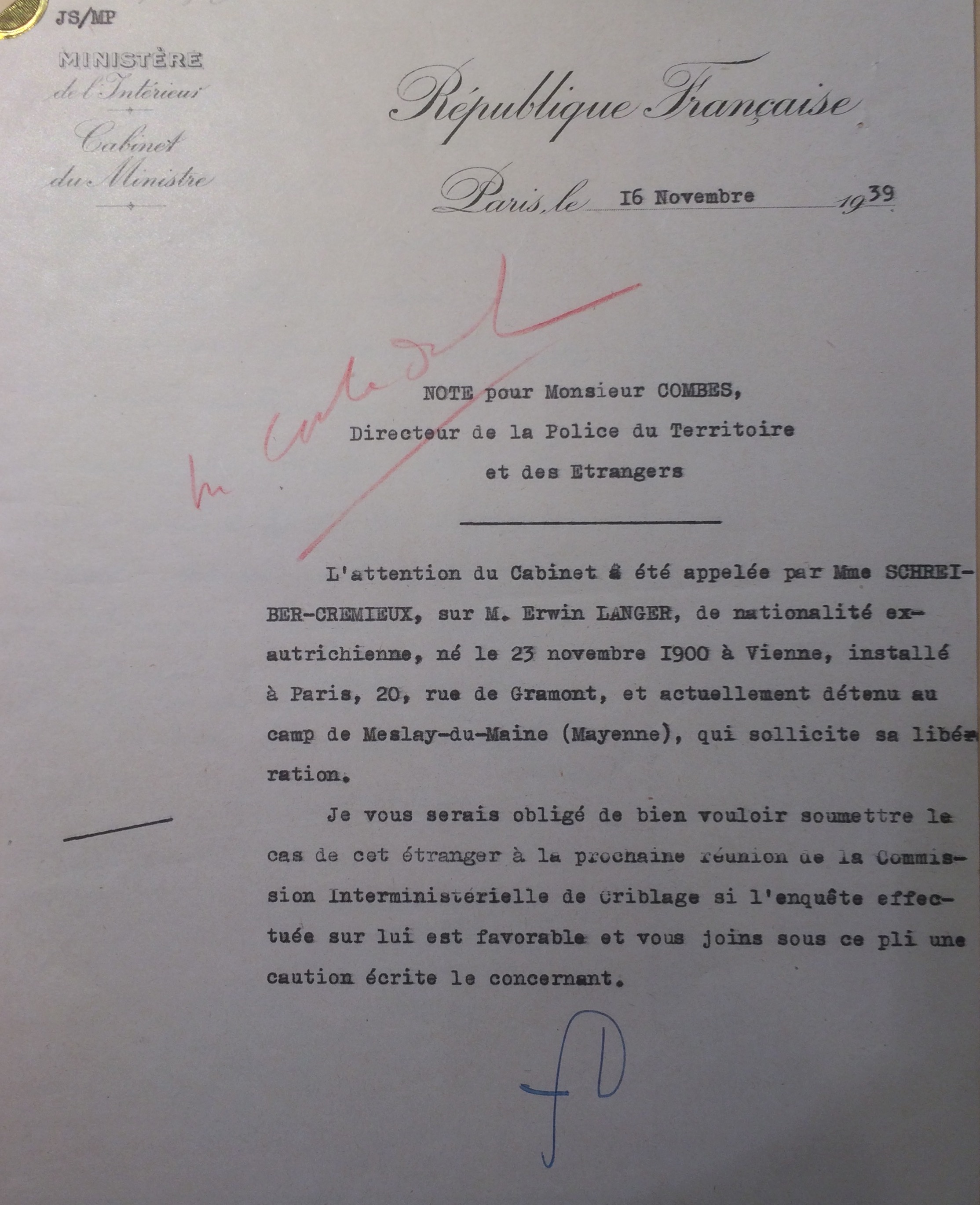 A l’entrée en guerre, les ressortissants des nations belligérantes (allemands et autrichiens) sont internés dans des camps de rassemblement : Erwin est interné au camp de Meslay-du-Maine en Mayenne. Le cabinet du Ministre de l’Intérieur est interpellé par Mme SCHREIBER-CREMIEUX le 16 novembre 1939, députée radicale pour la libération d’Erwin LANGER.