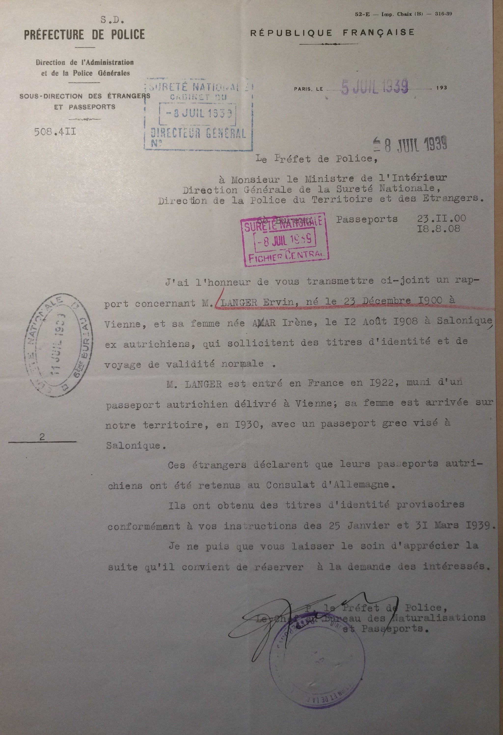 Irène LANGER née AMAR est née le 12 août 1908 à Salonique (Grèce). Elle est arrivée en France le 15 octobre 1930. Son mari Erwin LANGER est né 23 décembre 1900 à Vienne (Autriche) et est arrivé en France en 1922.