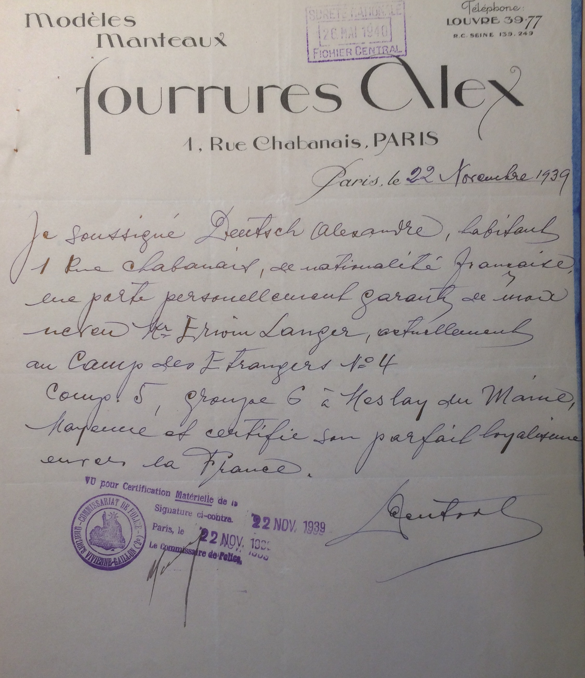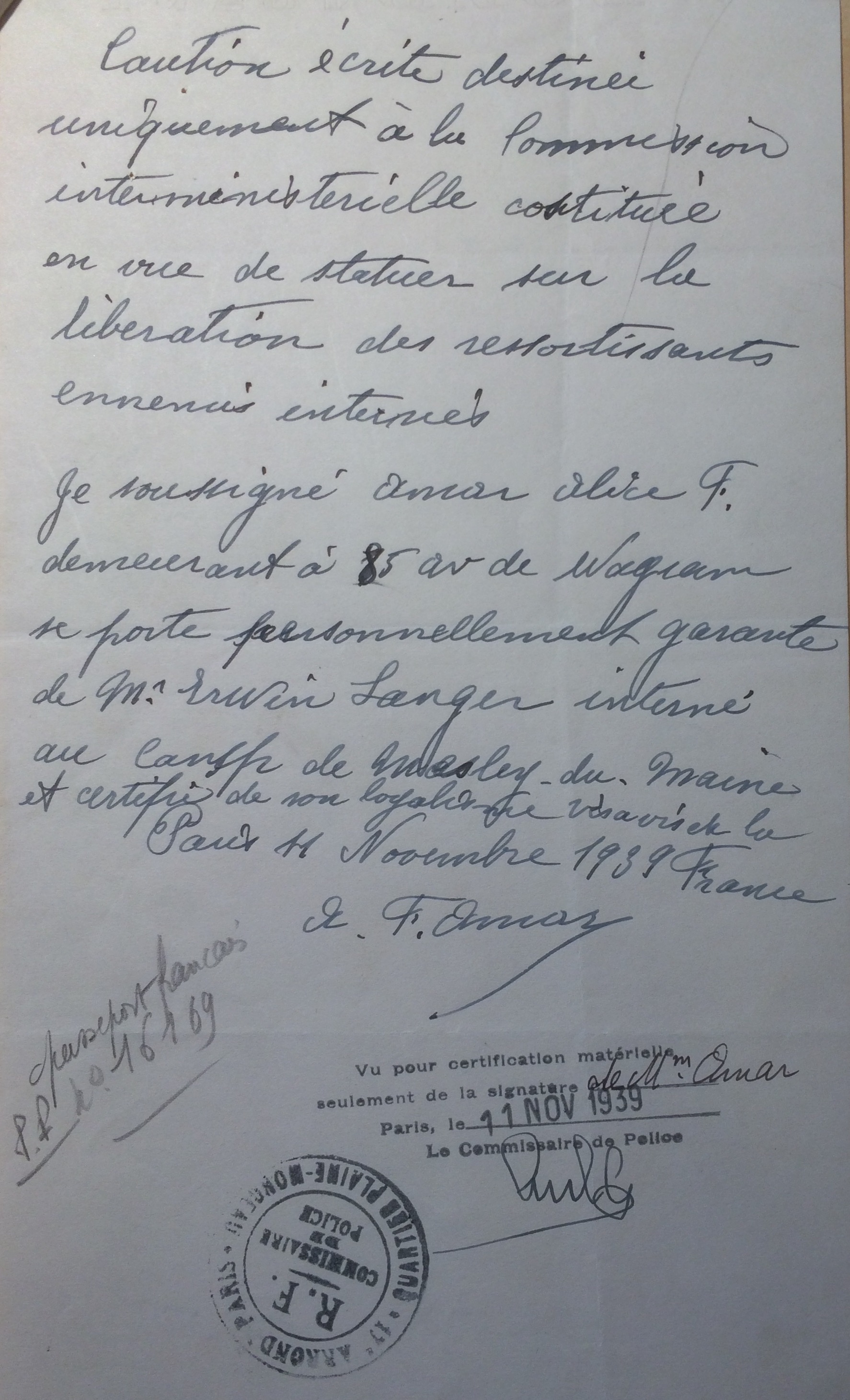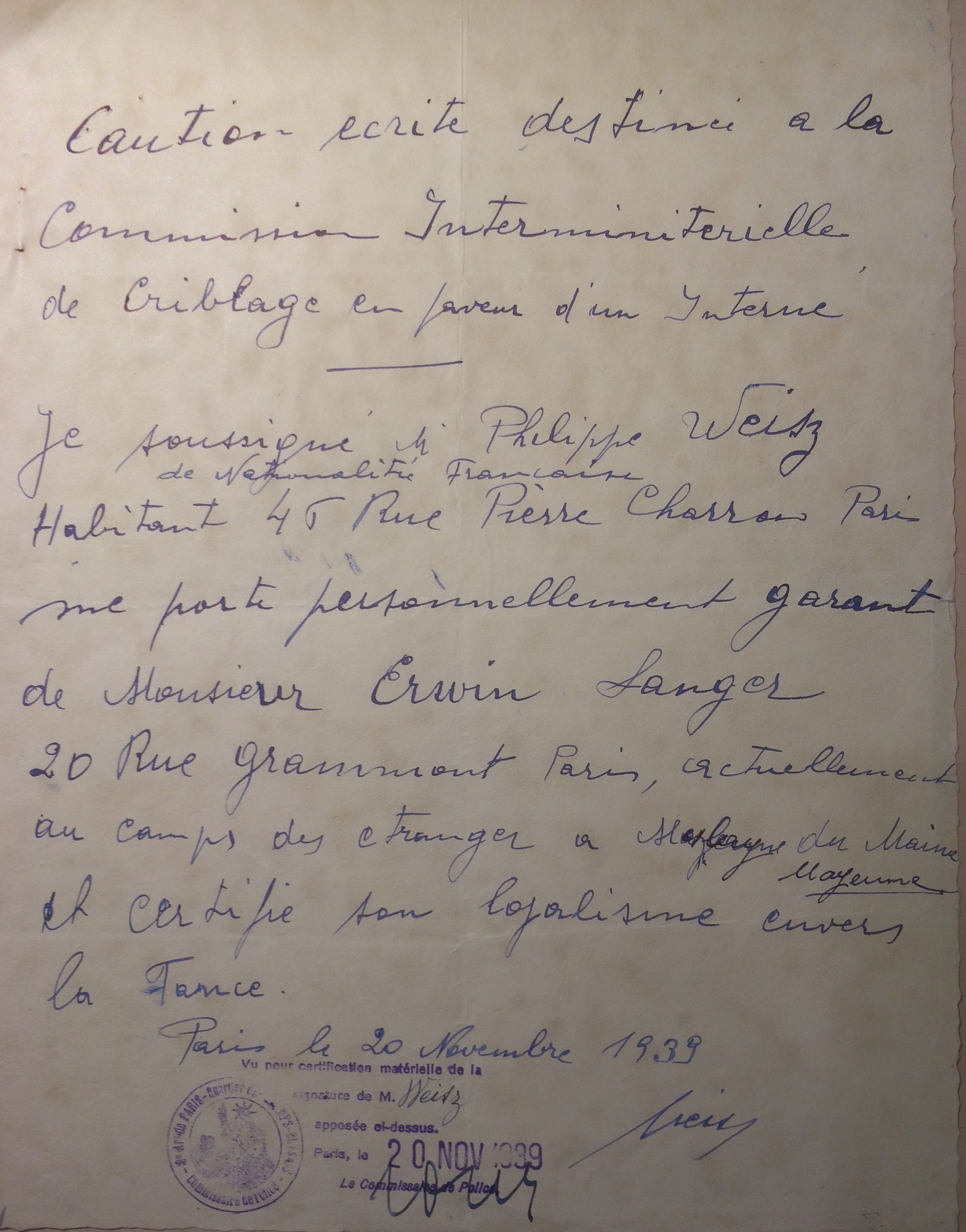 La libération des internés dans les camps de rassemblement est soumis à plusieurs conditions : des attestations prouvant le lien entre la personne détenue et son attachement à la France et un engagement dans l’armée française. Irène LANGER fournit ainsi trois attestations : celle de Philippe WEISZ, celle de Alexandre DEUTSCH et celle d’Alice AMAR. Ces trois personnes se portent garants pour Erwin LANGER.