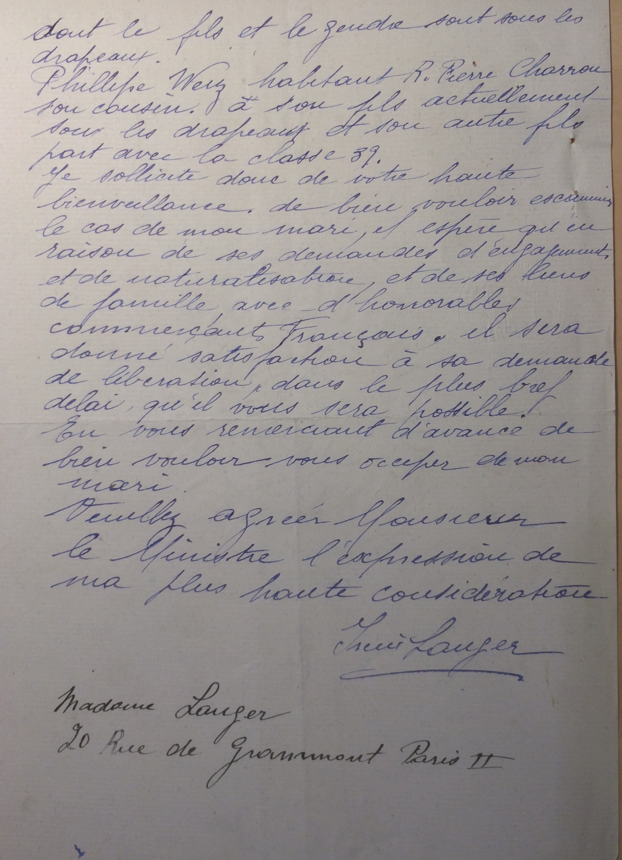 Par ailleurs, Irène LANGER, son épouse écrit une lettre au Ministère de l’Intérieur le 23 novembre 1939 pour tenter de faire libérer son mari.