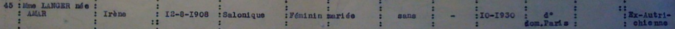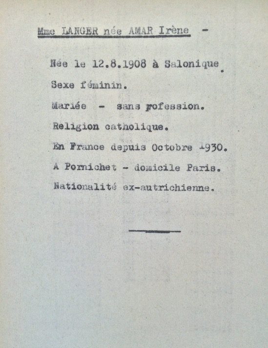 Irène LANGER née AMAR est née le 12 août 1908 à Salonique (Grèce). Elle est arrivée en France le 15 octobre 1930. Son mari Erwin LANGER est né 23 décembre 1900 à Vienne (Autriche) et est arrivé en France en 1922.