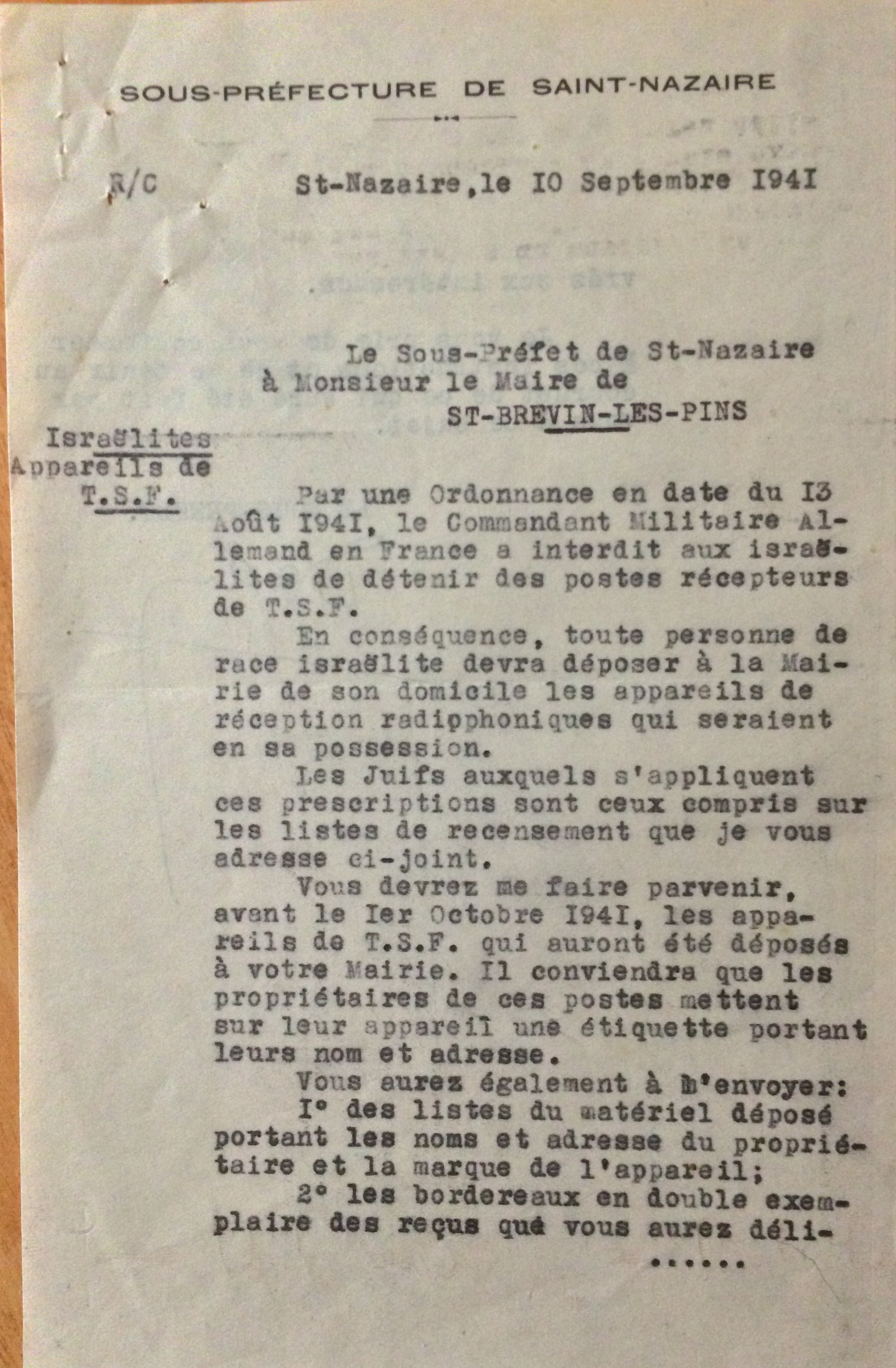 Suite à l’ordonnance allemande du 13 août 1941 interdisant aux Juifs de posséder un poste de TSF et suite au courrier envoyé par la sous-préfecture de Saint-Nazaire le 10 septembre 1941, le maire de la commune renvoie un courrier récapitulatif de la situation à Saint-Brévin.