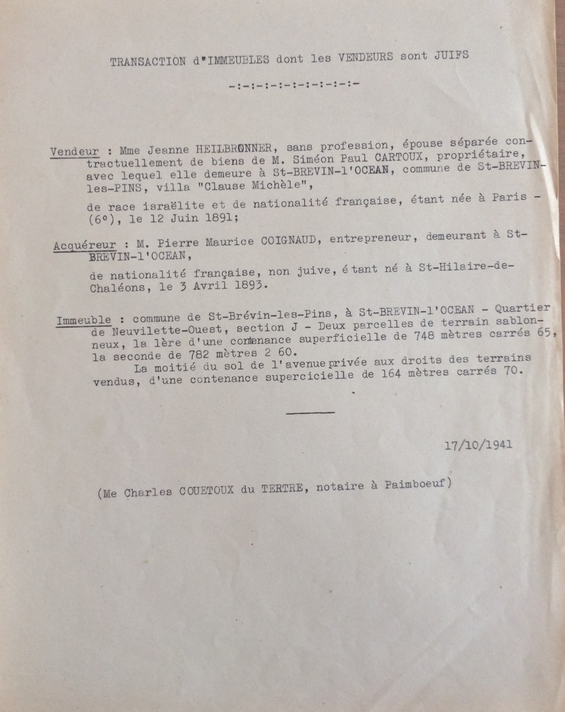 En juillet 1941, le Directeur Général du Service du Contrôle des Administateurs Provisoires envoie un courrier au Préfet concernant la vente des éventuels immeubles de rapport mais également la vente des immeubles appartenant à des propriétaires juifs. Jeanne HEILBRONNER est amenée à vendre deux terrains à Saint-Brévin-les-Pins, acte officialié devant notaire (Charles Couëtoux du Tertre, notaire à Paimboeuf) comme le précise le courrier du SCAP : « Il est par ailleurs indispensable qu’elles offrent [les ventes] toutes garanties de légalité pour les acquéreurs aryens.«