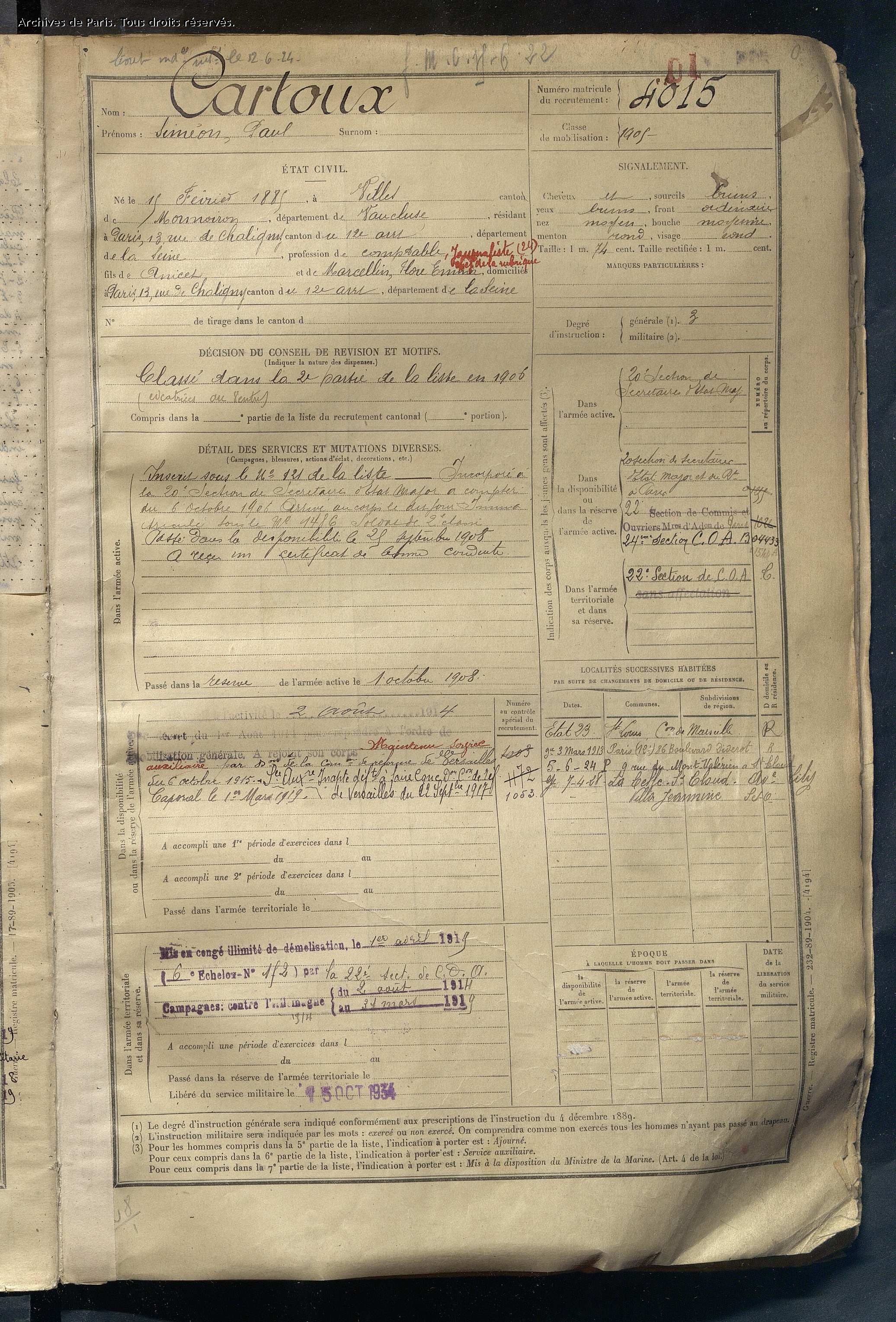 Siméon Paul effectue son service militaire et est incorporé le 06 octobre 1906 à la 20ème section de secrétaires d’Etat-Major jusqu’au 29 septembre 1908. Mobilisé pendant la 1ère guerre mondiale le 03 août 1914, il est affecté durant le temps de la guerre à la 22ème Section de Commis et Ouvriers à Paris.