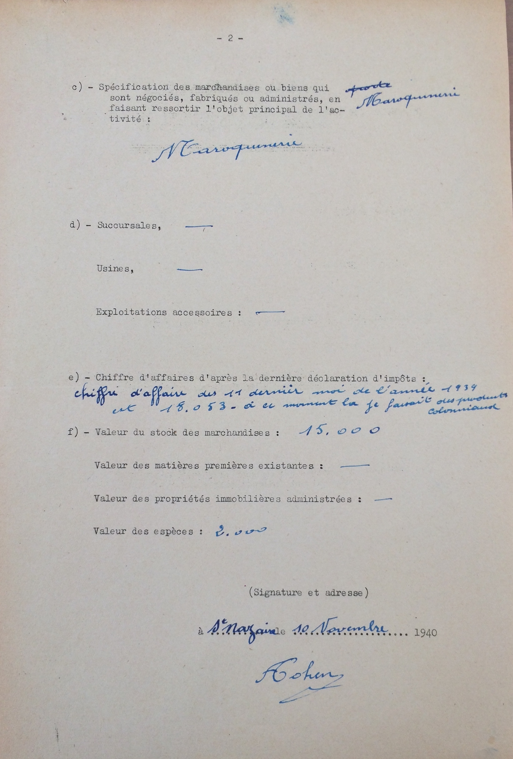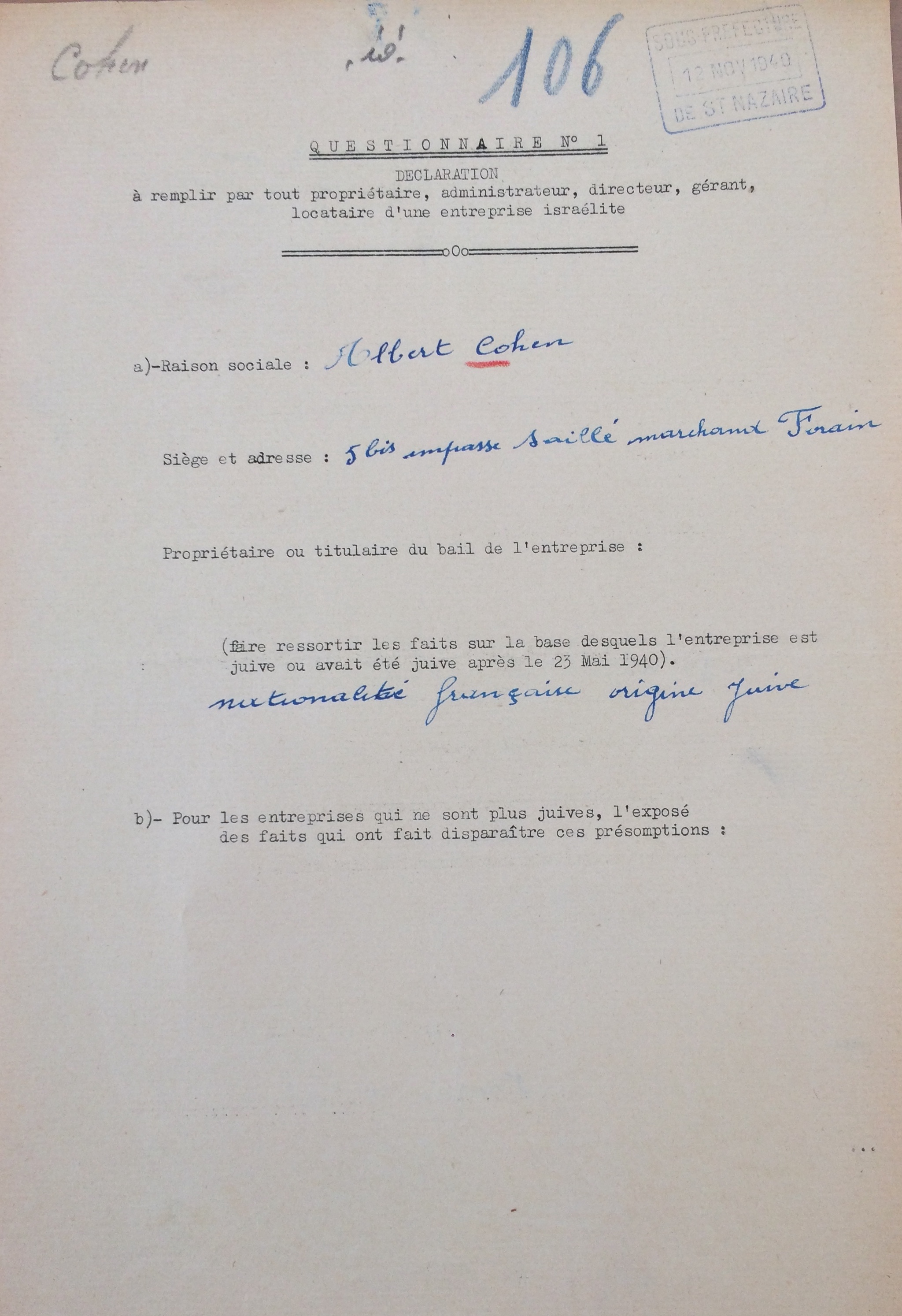 Conformément à la 2ème ordonnance allemande du 18 octobre 1940, Albert COHEN déclare son commerce auprès de la sous-préfecture de Saint-Nazaire le 10 novembre 1940.