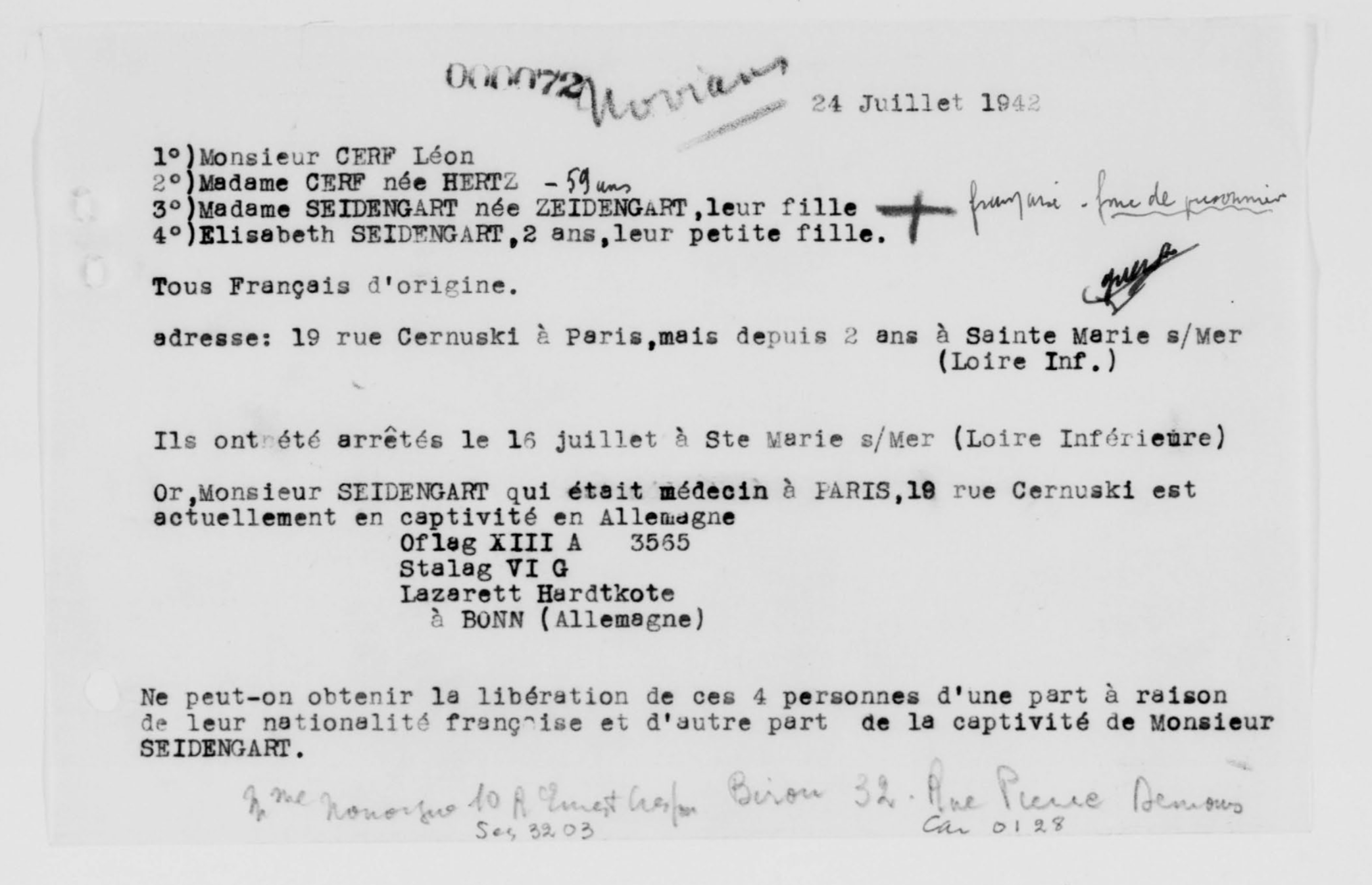 Le 24 juillet 1942, une demande est effectuée (à priori de la part de Monsieur BIRON 32, rue Pierre Demours à Paris) pour obtenir la libération de toute la famille (Epoux CERF + famille SEIDENGART) avançant les arguments qu’ils sont à Sainte Marie depuis au moins deux ans, qu’ils sont tous d’origine française et que Monsieur SEIDENGART est prisonnier de guerre en Allemagne. Cette demande transite par l’UGIF qui lui répond qu’ils effectuent une demande de copie de pièce d’identité à la sous-préfecture de Saint-Nazaire pour prouver la nationalité française de Léon CERF et lui demande par ailleurs d’intervenir personnellement de son côté.