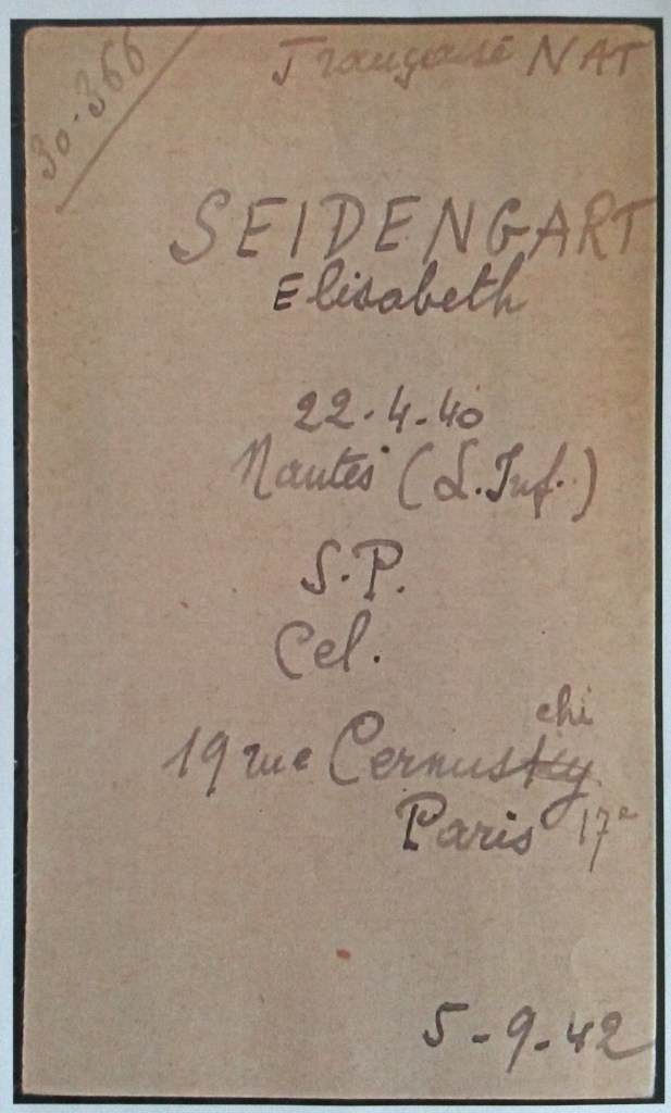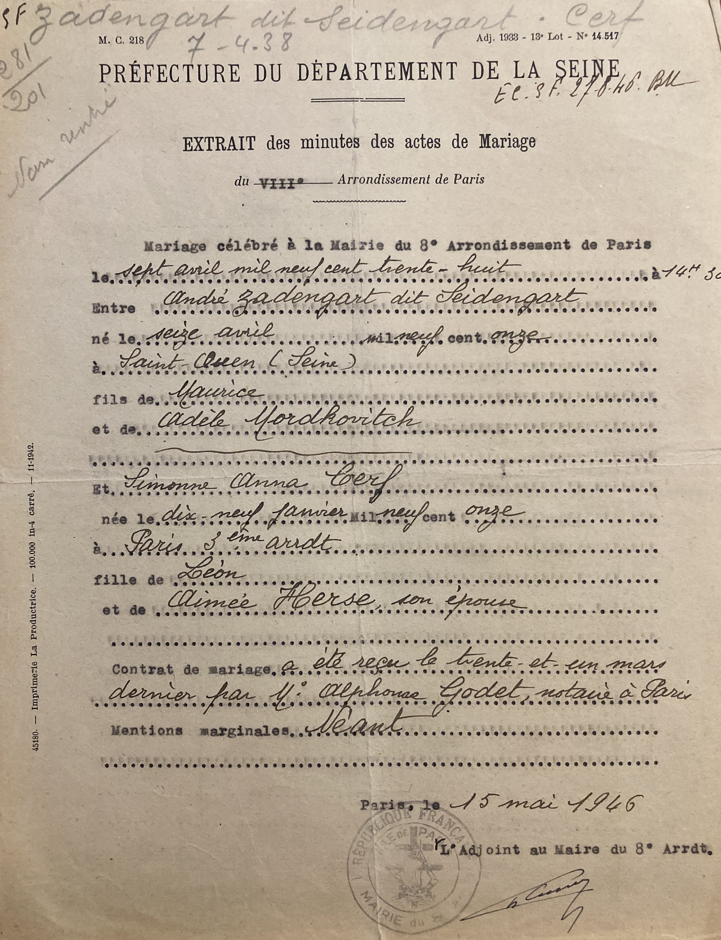 Simonne Anna (Prénom usuel Simone) CERF est née le 19 janvier 1911 à Paris (3ème arrondissement) [Père : CERF Léon, attaché de laboratoire/directeur laboratoire pharmaceutique et Mère : HERSE Aimée]. Elle s’est mariée le 07 avril 1938 à Paris (8ème arrondissement) avec André ZADENGART dit SEIDENGART, né à Saint-Ouen le 16 avril 1911, à l’époque étudiant en médecine. Simone va mettre au monde un enfant : Elisabeth SEIDENGART le 22 avril 1940 à Nantes, 8 rue des Folies Chaillou.