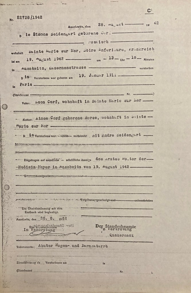 Un certificat de décès dressé le 28 août 1942 par un des médecins d’Auschwitz le docteur Meyer précise la cause du décès du 19 août 1942 de Simone SEIDENGART: catharre (secrétion) aigüe de l’estomac et de l’intestin, cause du décès à prendre avec les précautions d’usage.