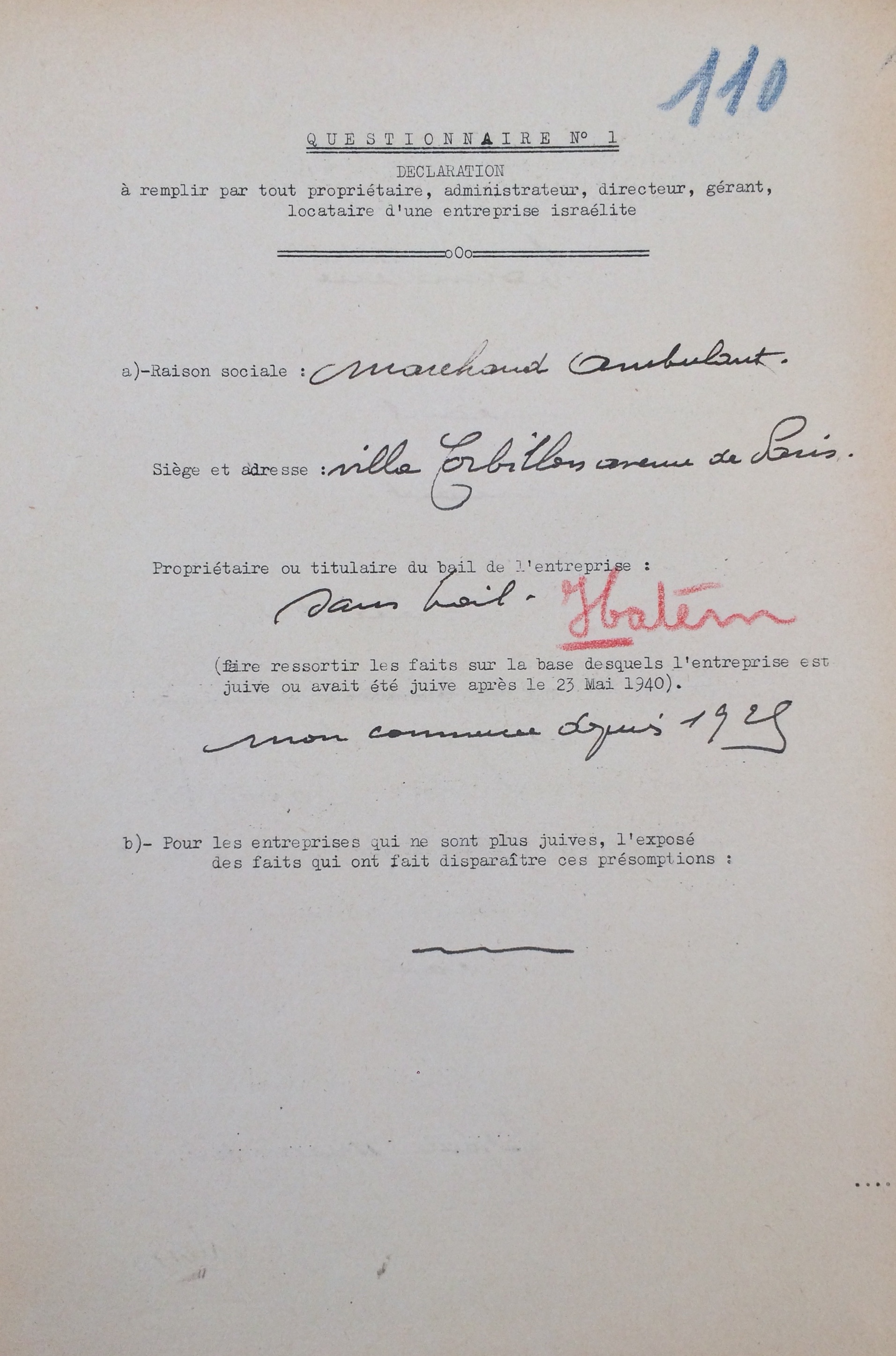 Afin de rendre compte de l’avancement de l’aryanisation dans le département de Loire-Inférieure, la liste des commerçants et entreprises juives est transmise par le Préfet de Loire-Inférieure au Commissariat Général aux Questions Juives. Le nom de HATEM Youmtov apparaît.