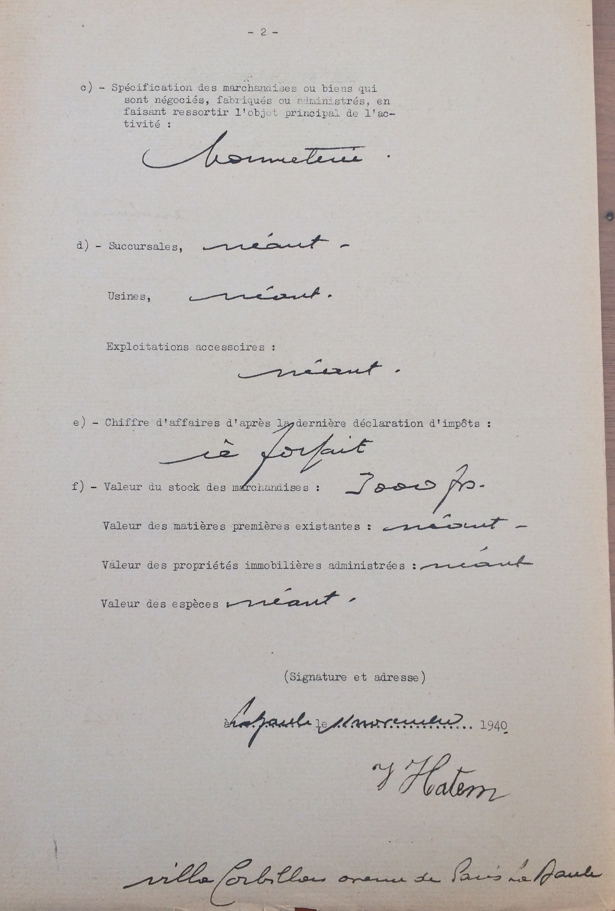 Conformément à la 2ème ordonnance allemande du 18 octobre 1940, Youmtov HATEM déclare son commerce auprès de la sous-préfecture de Saint-Nazaire le 11 novembre 1940.