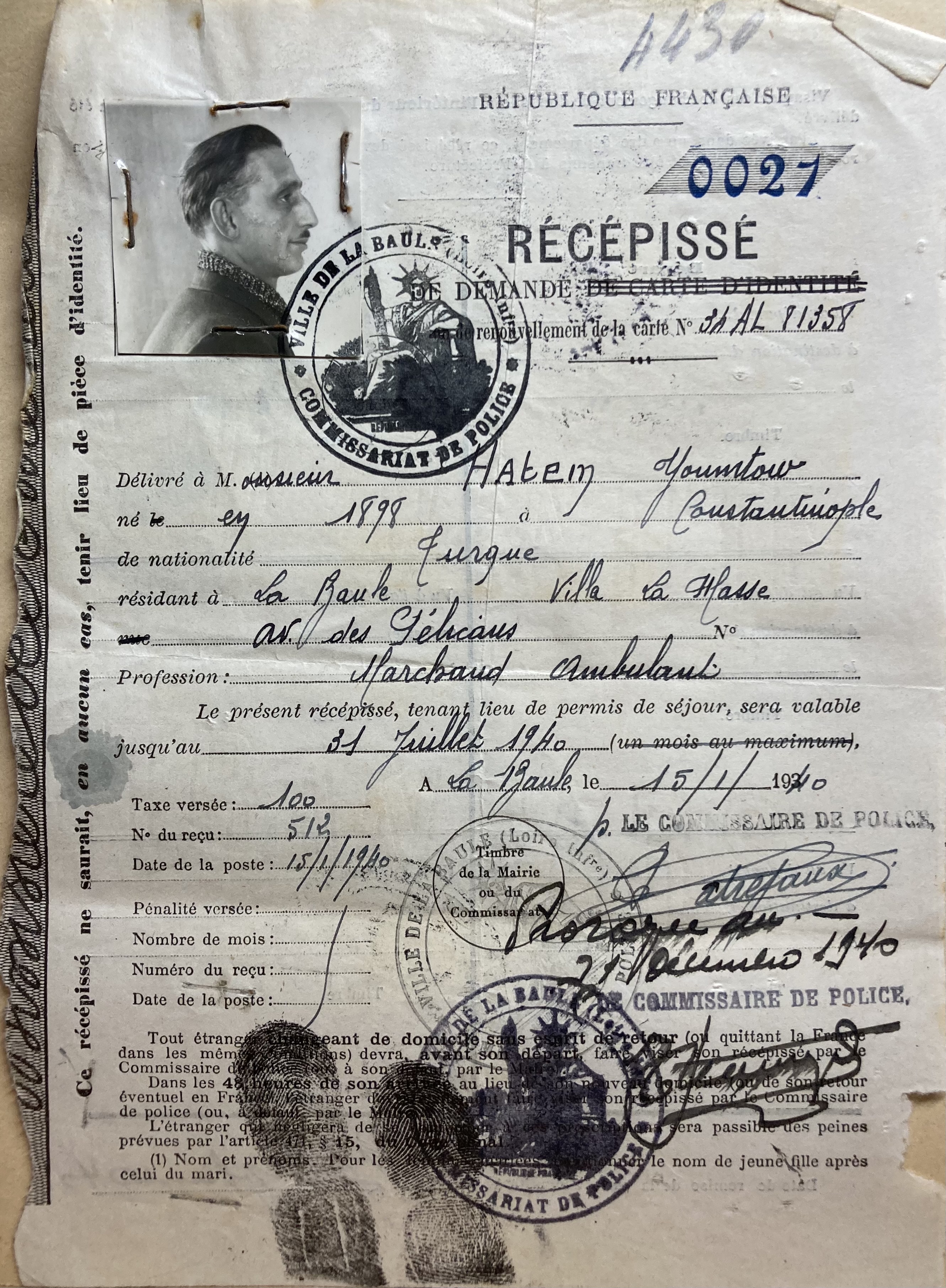 La famille de 3 personnes fait partie des réfugiés arrivés de Paris (12 septembre 1939) et Mme HATEM, sans ressources, touchera une allocation pour réfugiés au mois de décembre 1940. Youmtov effectue une demande de carte d’identité pour étrangers en janvier 1940 qui lui est remise le 7 septembre 1940.