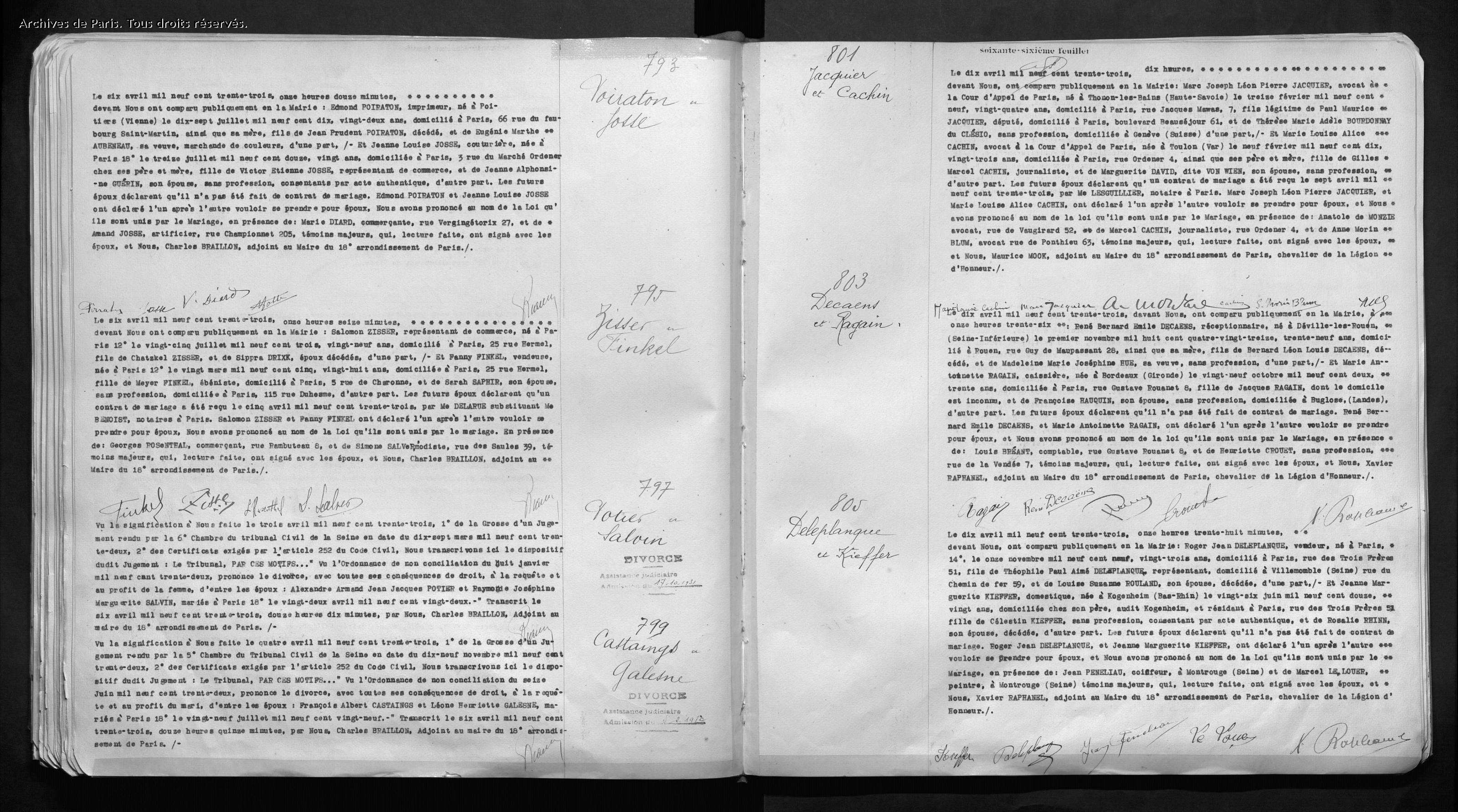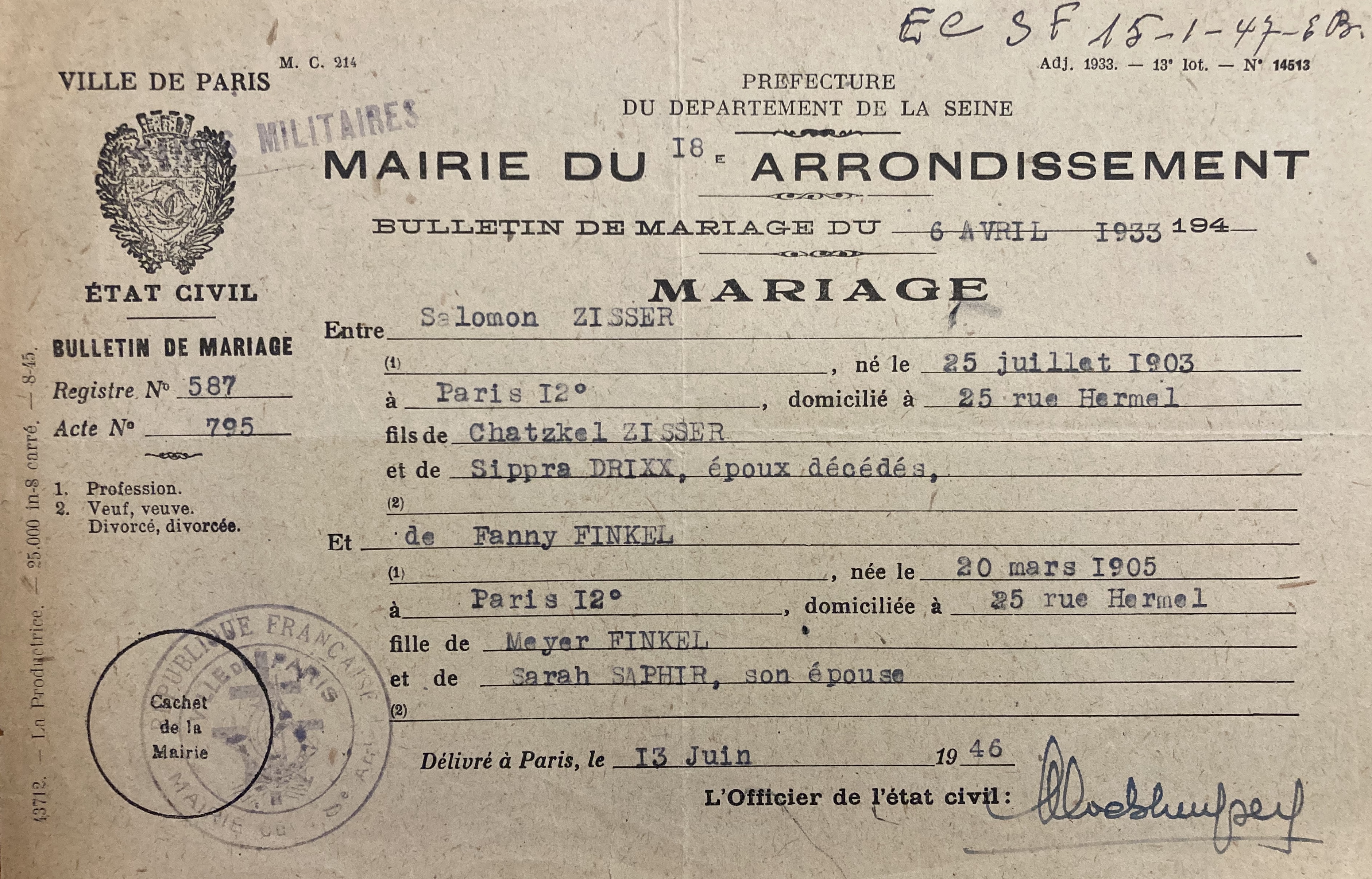 Fanny ZISSER née FINKEL est née à Paris (12ème arrondissement) le 19 mars 1905 [Père : FINKEL Meyer, ébéniste et Mère : Sarah SAPHIR, couturière] et est mariée avec Salomon ZISSER né le 25 juillet 1903 à Paris (12ème arrondissement) [Père : ZISSER Chatzkel, marchand et Mère : Sippra DRIXK]. Ils se sont mariés dans le 18ème arrondissement le 06 avril 1933 et ils habitent au moment de leur mariage 25, rue Hermel dans le 12ème arrondissement.