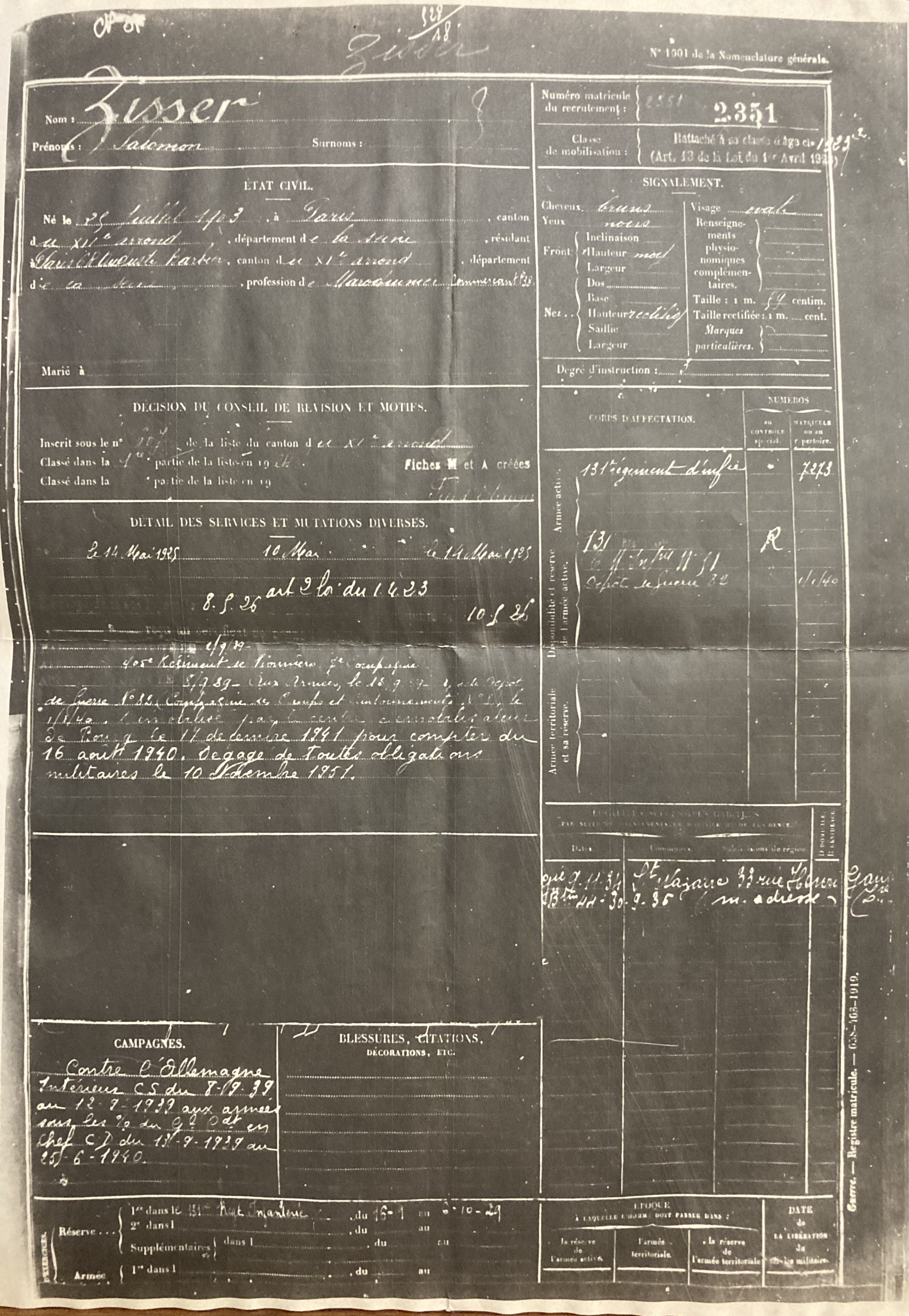 Salomon ZISSER est mobilisé le 02 septembre 1939 131 régiment d’infanterie puis au 405ème Régiment de Pionniers 7ème compagnie jusqu’au 25 juin 1940.
