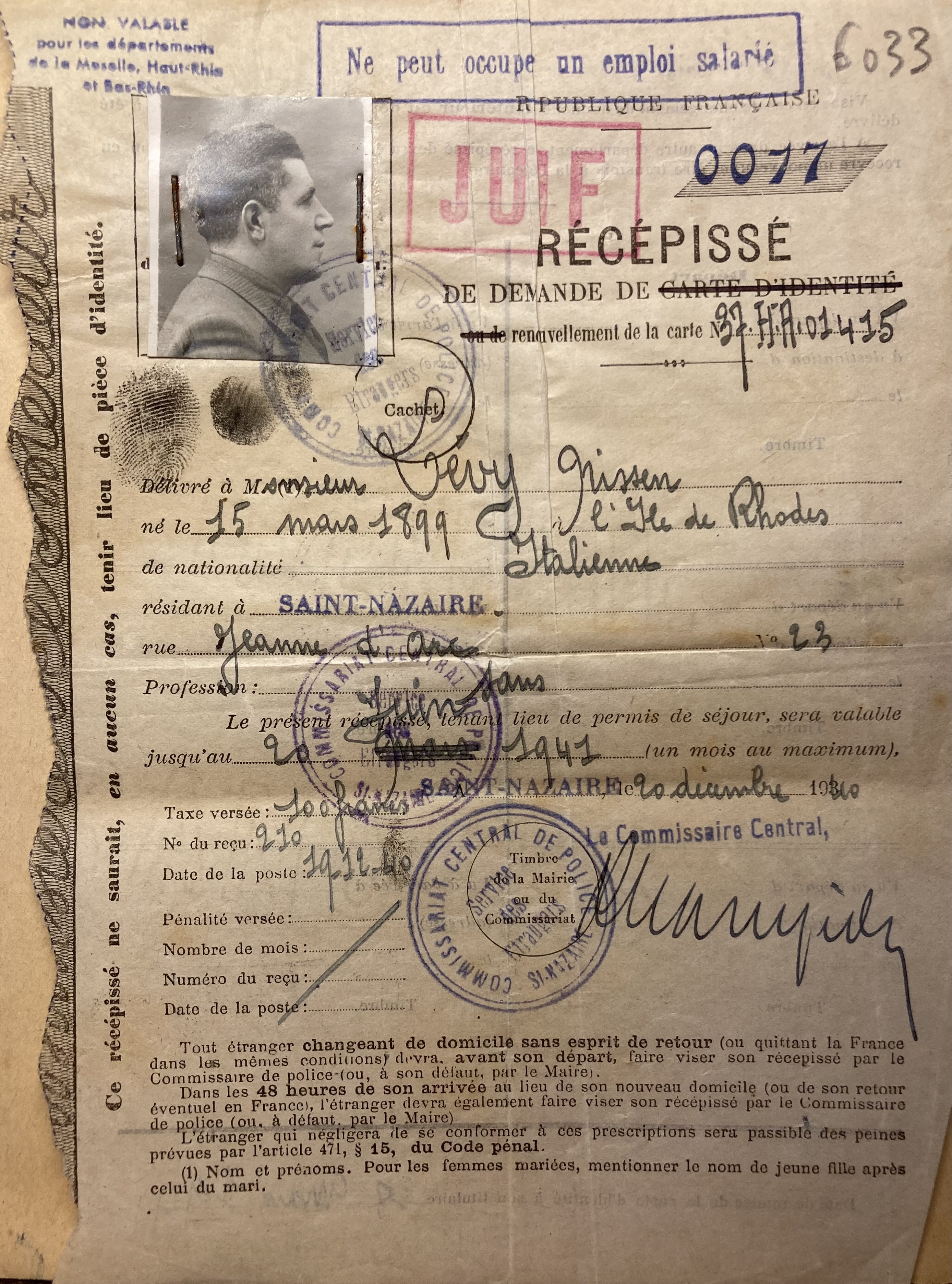 Le tampon Juif est apposé sur son récépissé de demande de nouvelle carte d’identité en décembre 1940.