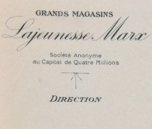 Ils se situent 18, rue du Calvaire et 5, rue Lafayette en plein centre. Le 11 juillet 1923, une société anonyme est créée au nom de Grands Magasins Marx Lajeunesse. La précédente Société en nom collectif nommée Marx et fils est dissoute à la même date. Trois actionnaires se partagent les actions : 7800 pour Marcel et Jean MARX et 200 pour Alfred DREYFUS. En juillet 1925, Jean et Marcel MARX vendent leurs actions aux Galeries Lafayette afin que les produits vendus soient achetés via la Centrale d’achat des Galeries Lafayette mais restent administrateurs de la société. Le 15 novembre 1934, Marcel MARX démissionne et est remplacé par Monsieur Alphonse VUILLAUME, nommé administrateur et président du Conseil d’Administration. Le 16 novembre 1935, Jean MARX démissionne et est replacé par Monsieur Victor GAUTRET et le 2 janvier 1937, Alfred DREYFUS est remplacé par Monsieur Jean LAFOND. En 1940, Alphonse VUILLAUME est directeur général des Galeries Lafayette de Paris et Jean LAFOND en est le chef du contentieux.