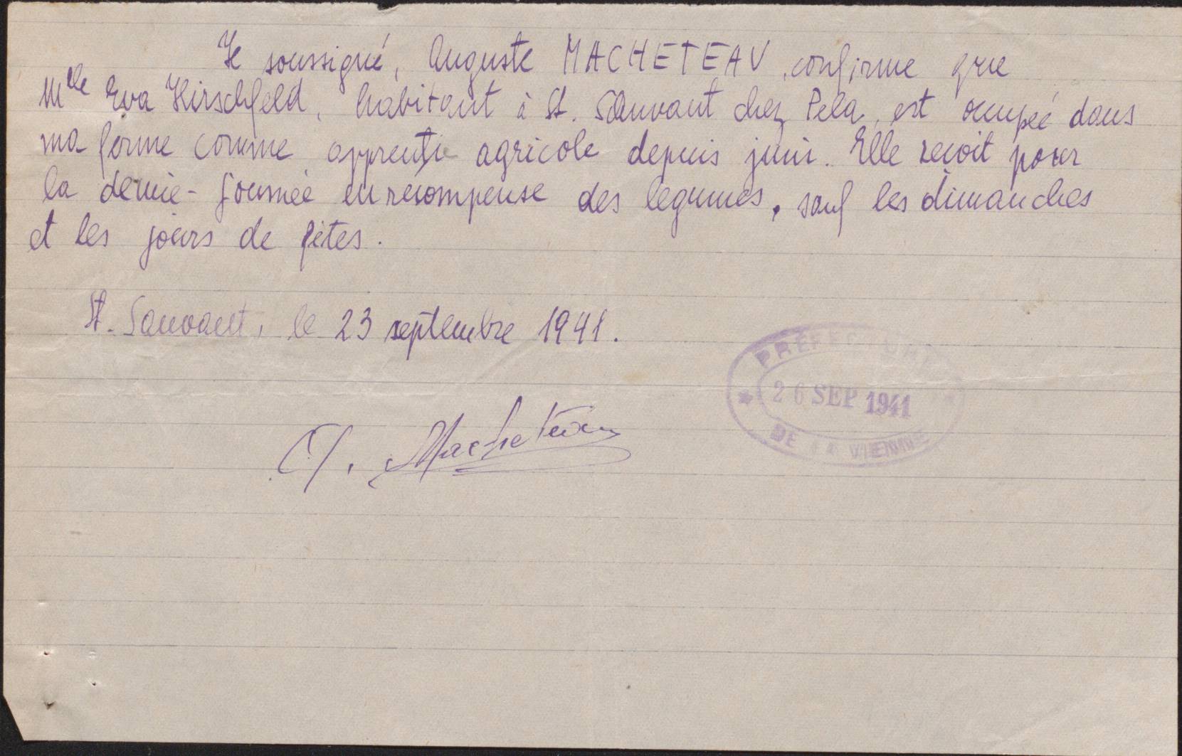 La famille loge chez Monsieur PELA Gabriel, rue du Marchais à Saint-Sauvant. Réfugiée, elle va recevoir à ce titre une allocation pour réfugiés. Pour subvenir au besoin de la famille, Eva va être employée comme apprentie agricole en juin 1941 chez Auguste MACHETEAU qui lui donne des légumes en guise de salaire (!) puis chez Louis FORTUNAT au prix de 5 frs par jour en mai 1942 (!). [Note : le salaire moyen d’un ouvrier étranger est de l’ordre de 1500 francs par mois en 1939].