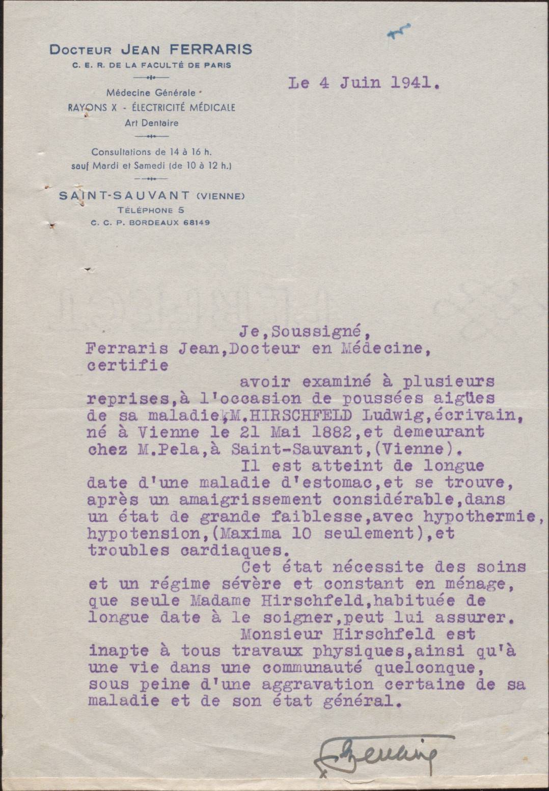 Ludwig HIRSCHFELD est malade et souffre d’une maladie chronique à l’estomac. Visiblement très affaibli, il consulte le médecin en juin 1941.