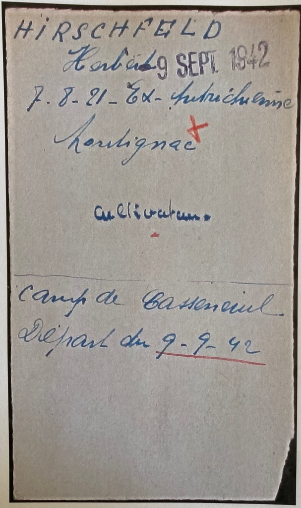 Une circulaire émanant du Secrétariat général à la police prévient les préfets de zone libre que les Juifs étrangers entrés en France après 1936 « seront transportés en zone occupée avant le 15 septembre ». Durant les mois de septembre et d’octobre 1942 les opérations visant à arrêter les Juifs se poursuivent : Herbert est arrêté le 26 août 1942 et conduit au camp de Casseneuil avant dêtre transféré sur Drancy. Le reste de la famille HIRSCHFELD est arrêtée à Saint-Sauvant (Vienne) puis regroupée au camp de Poitiers le 12 octobre 1942 avant d’être envoyée sur Drancy le 15 octobre 1942.