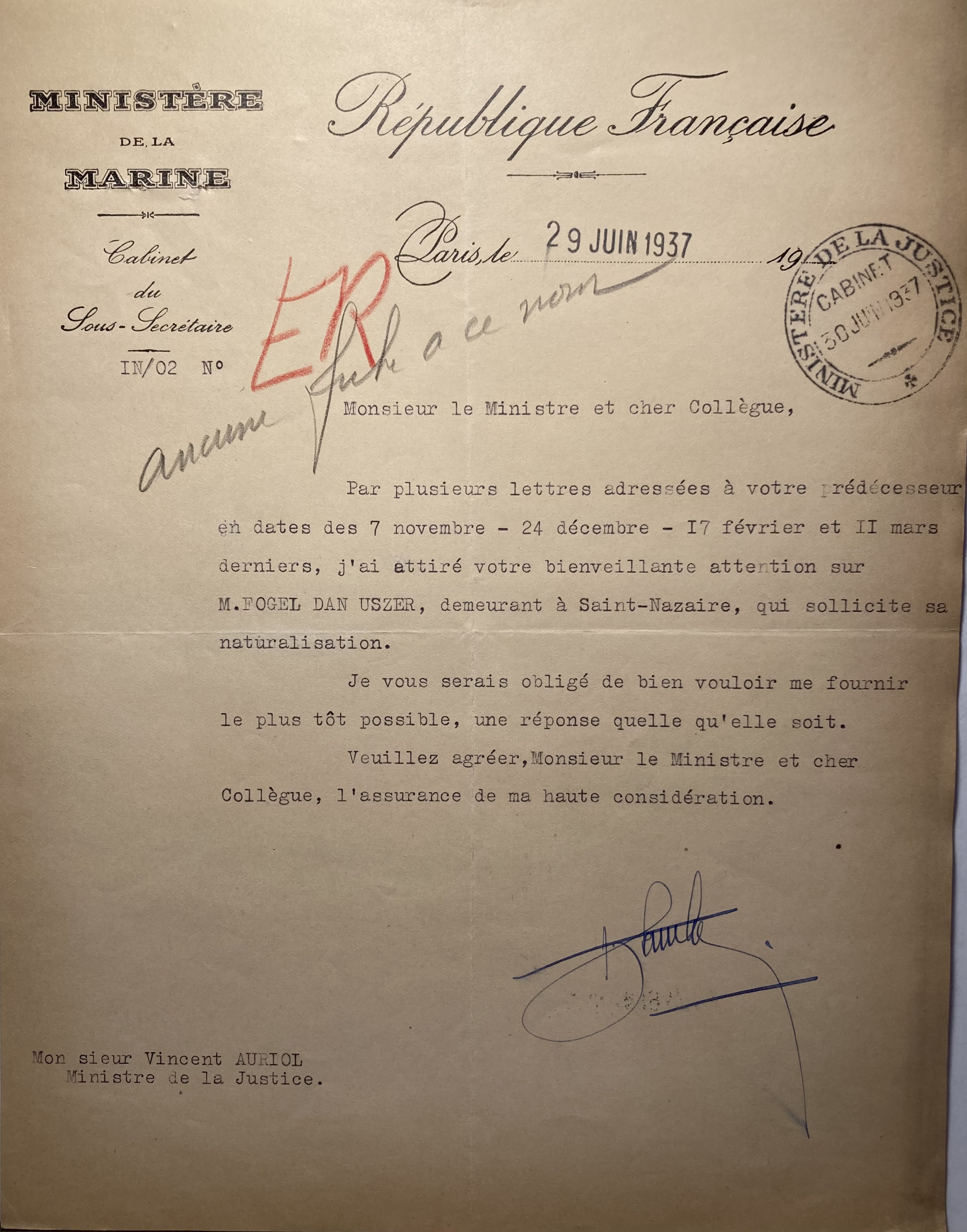 Appuyée par François Blancho alors sous-secrétaire d’Etat à la Marine et conseiller général de Loire-Inférieure, Henri FOGIEL obtient la nationalité française en 1938 par décret du 11 mai 1938 dossier n°11523X37. De fait, son épouse obtient la nationalité française. Son dossier de naturalisation passera devant la commission de dénaturalisation le 28 mars 1941 mais sa nationalité sera maintenue.