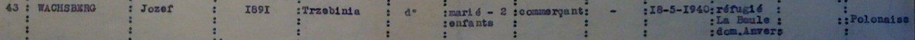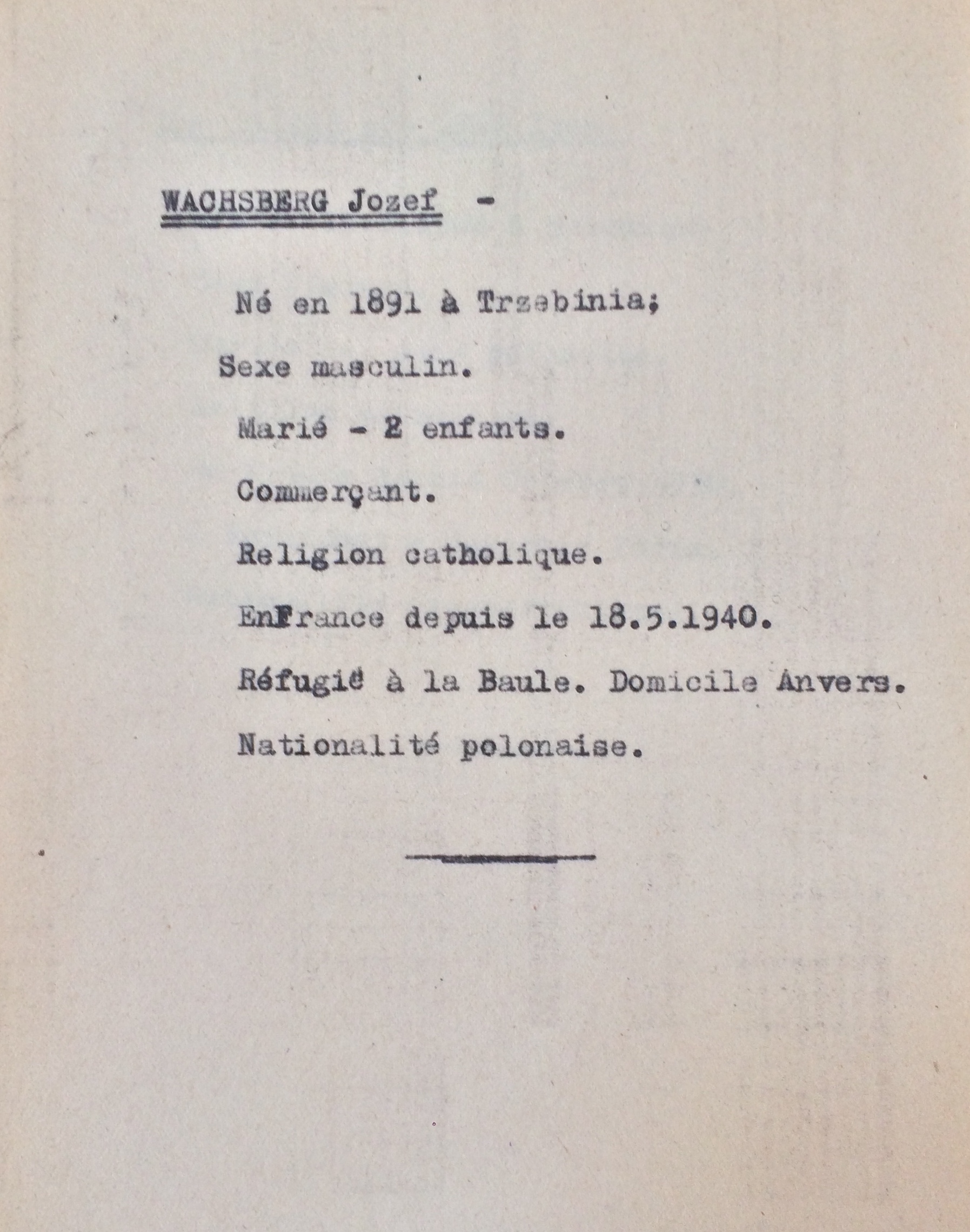 Jozef WACHSBERG, de nationalité polonaise, est né en 1891 à Trzebinia (Pologne), commerçant, marié avec Rachel VELT née à Amsterdam en 1894, 2 enfants Harry né à Hanau le 09 août 1922 (Allemagne) et Anna Sara née en 1924 à Anvers (Hollande) et arrive en France le 18 mai 1940 où il se réfugie avec sa famille à La Baule en provenance d’Anvers.