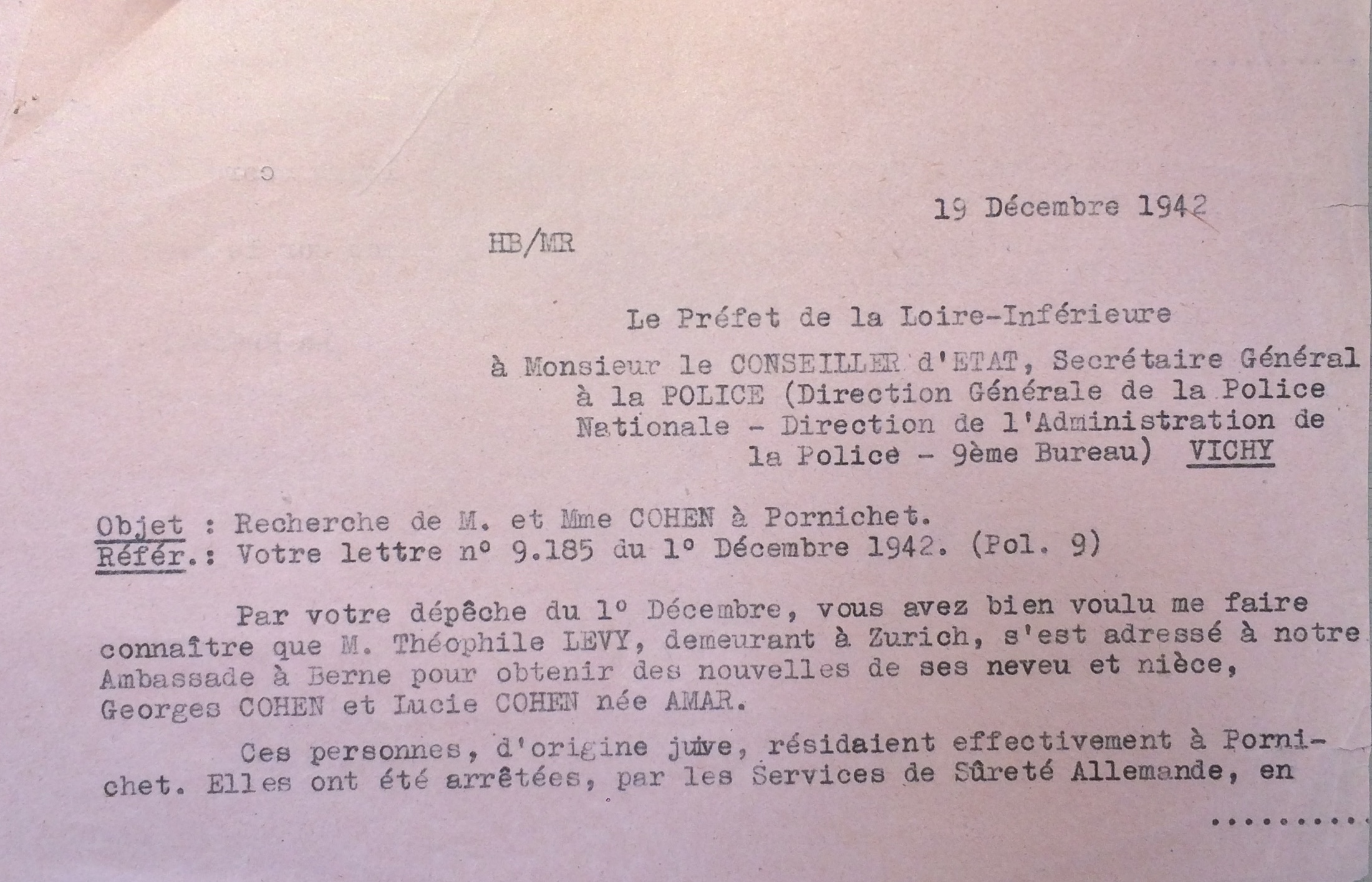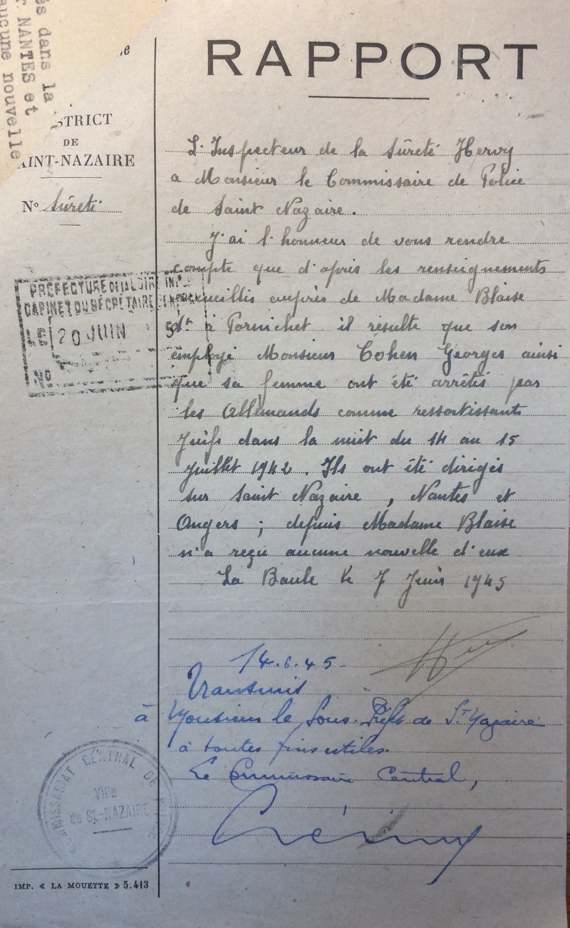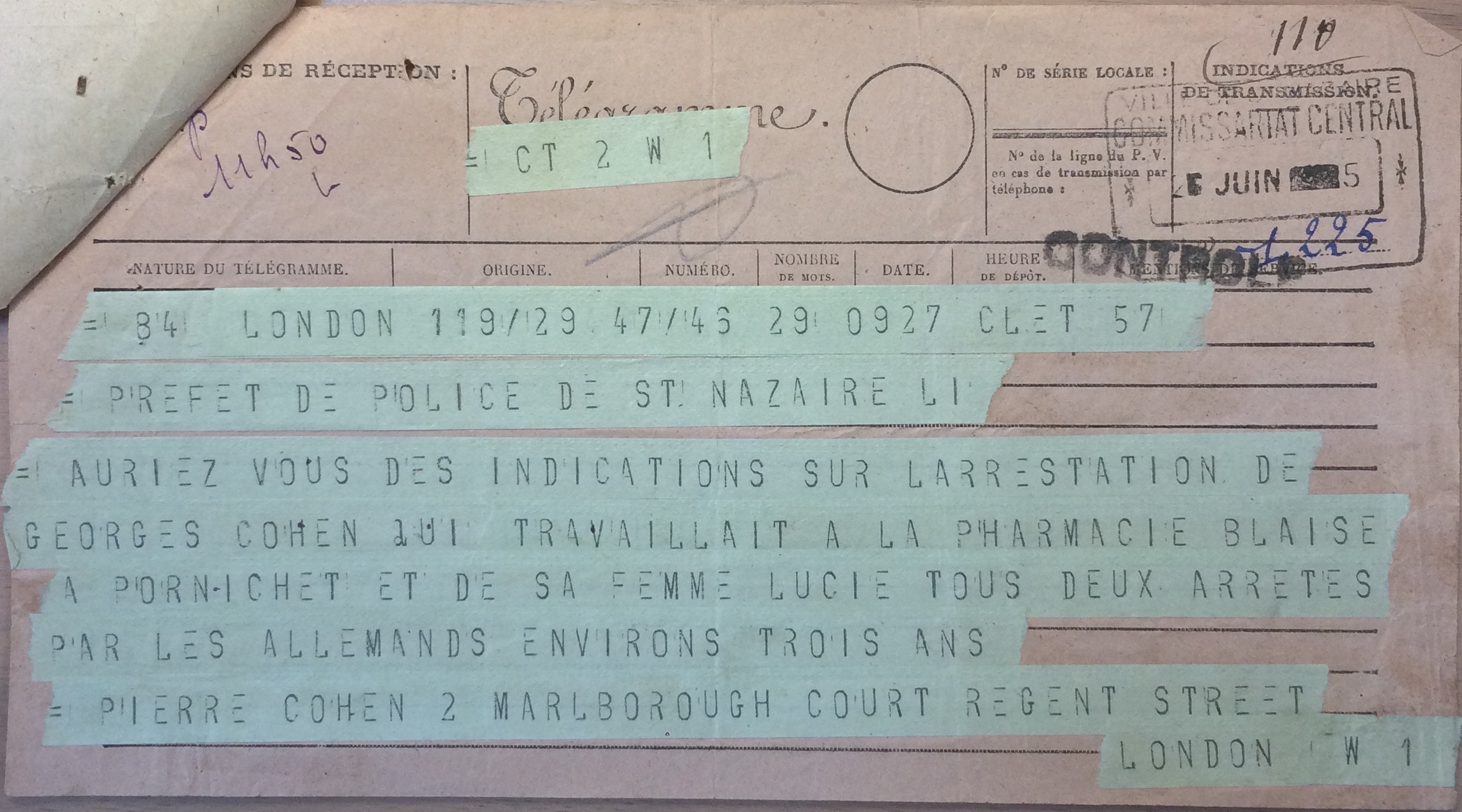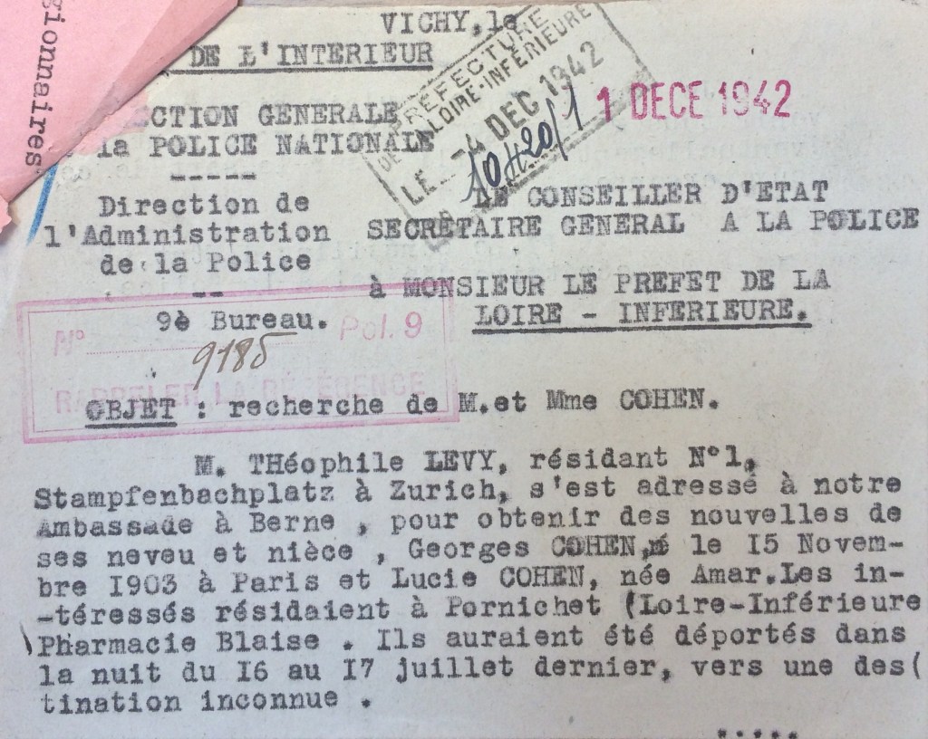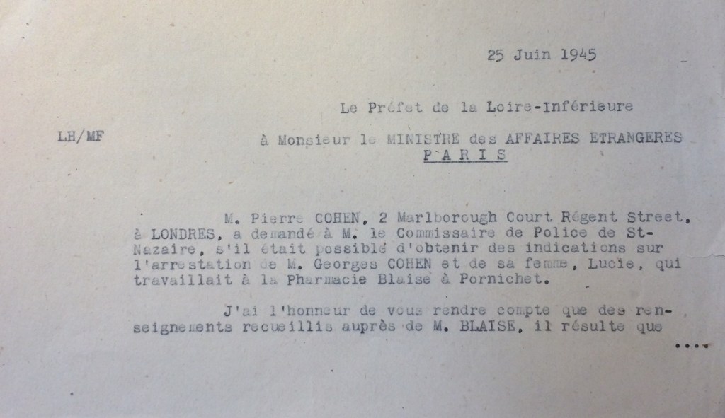 Pierre COHEN, le frère de Georges, sans nouvelles depuis 1942 et dans l’espoir de les retrouver vivants, envoie un télégramme en 1945 de Londres à la préfecture de Loire-Inférieure. Le rapport de gendarmerie précise les circonstances de l’arrestation.